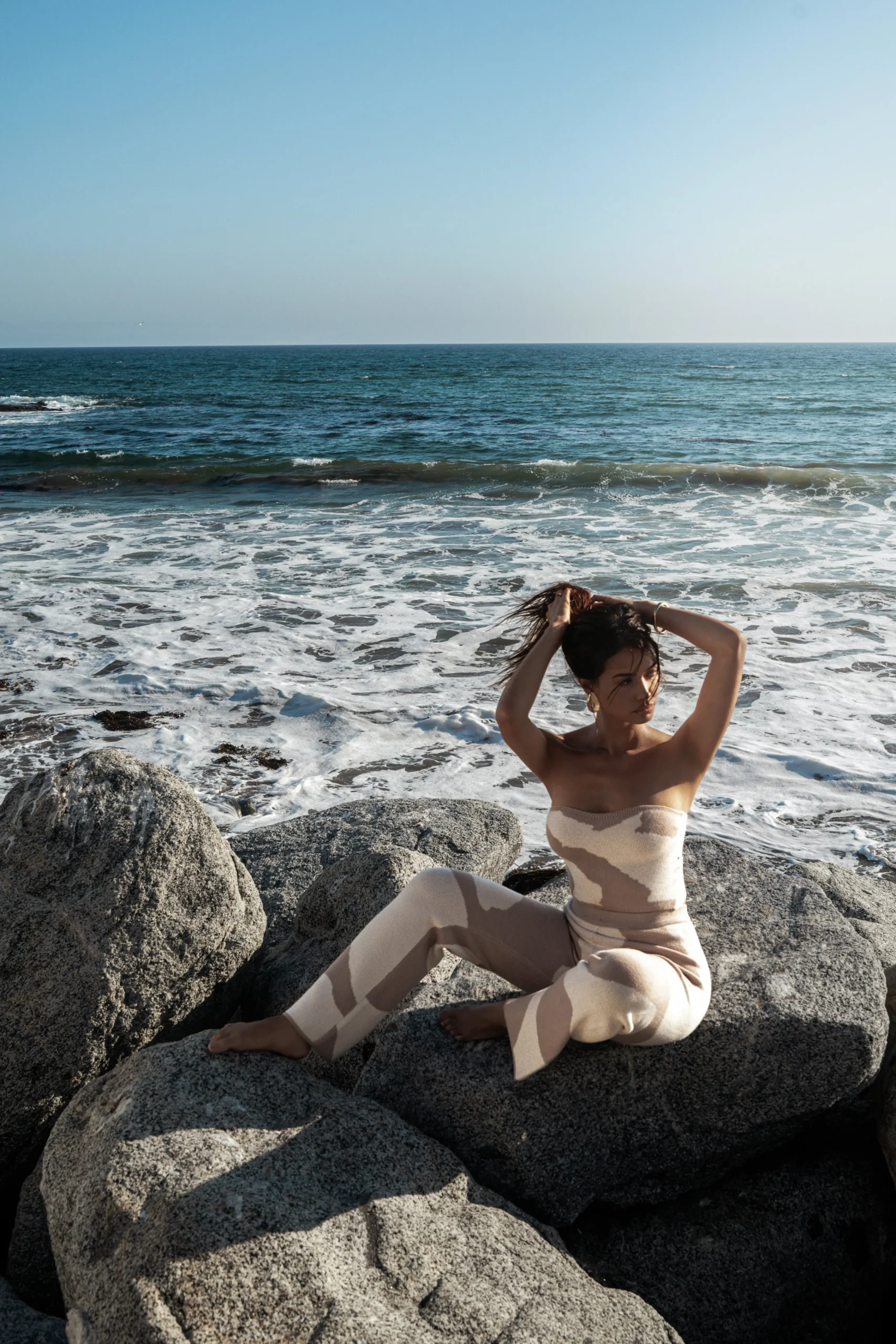 Our Beige Abstract Tiarra Pant is at the top of our list for vacation favorites. Crafted from an ultra soft knit, these comfy bottoms feature an elastic waistband with straight leg hems and a stylish two tone abstract print. Pair with our Tropic Oasis Print Top for the full look. Stretchy. Single lined.