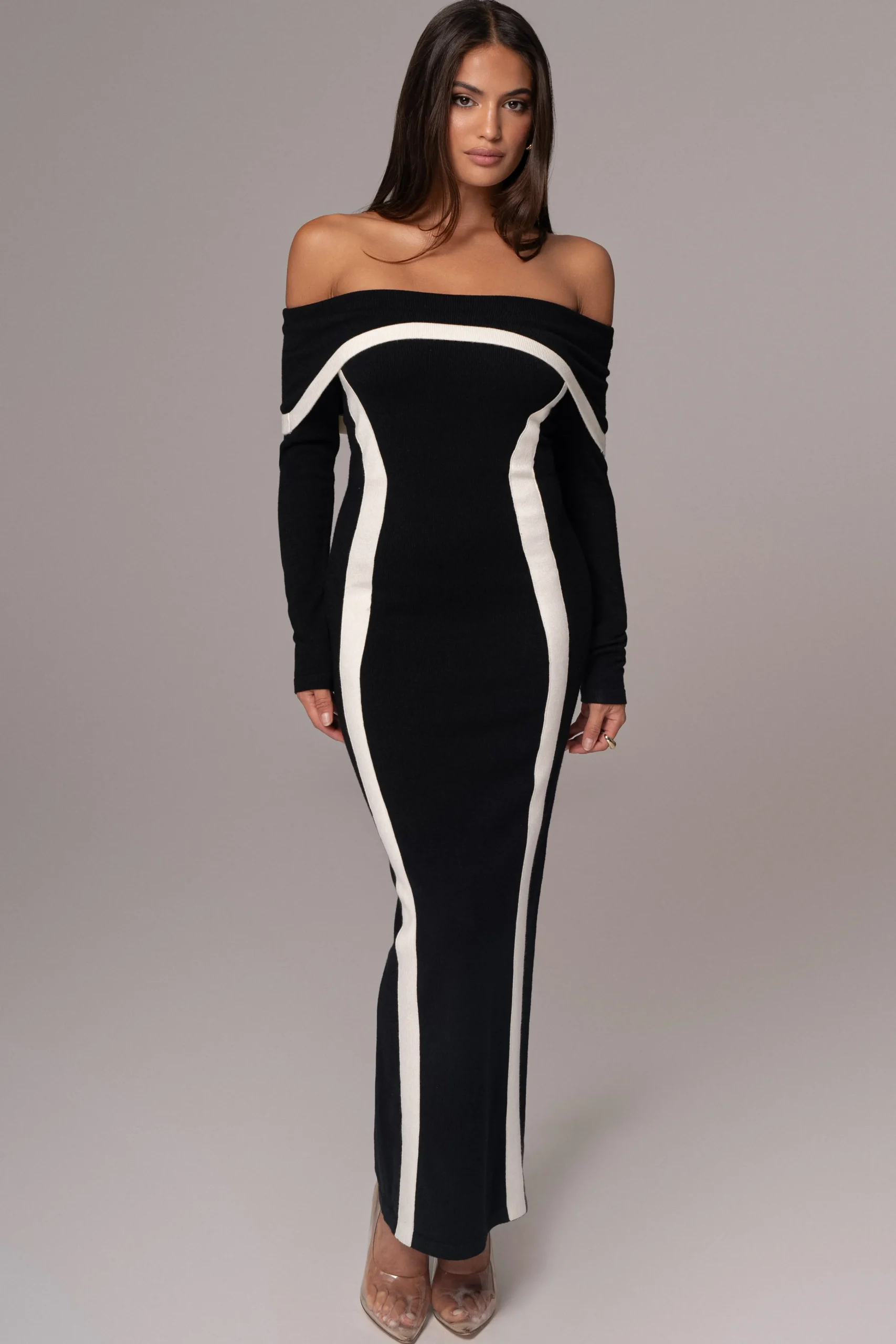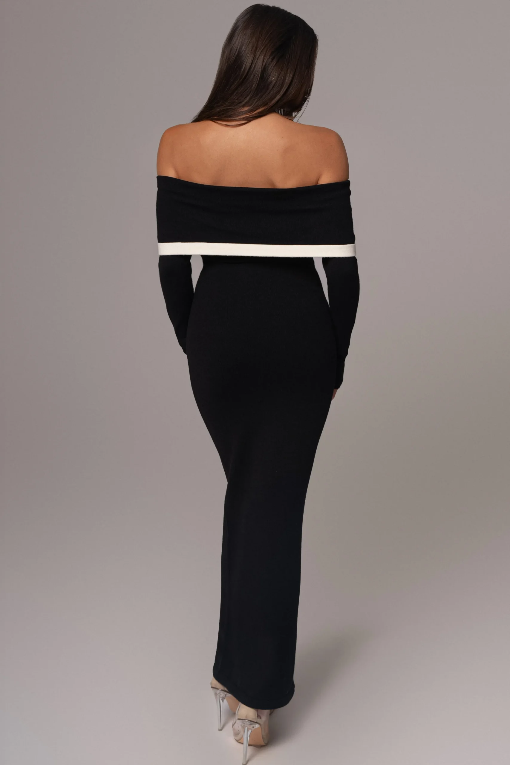 Be a vision of elegance and style in our Black Janet Off Shoulder Maxi Dress. Featuring a sophisticated contrast design with an off the shoulder neckline and fold-over edge. Crafted from a single lined knit fabric offering both comfort and style. Stretchy.