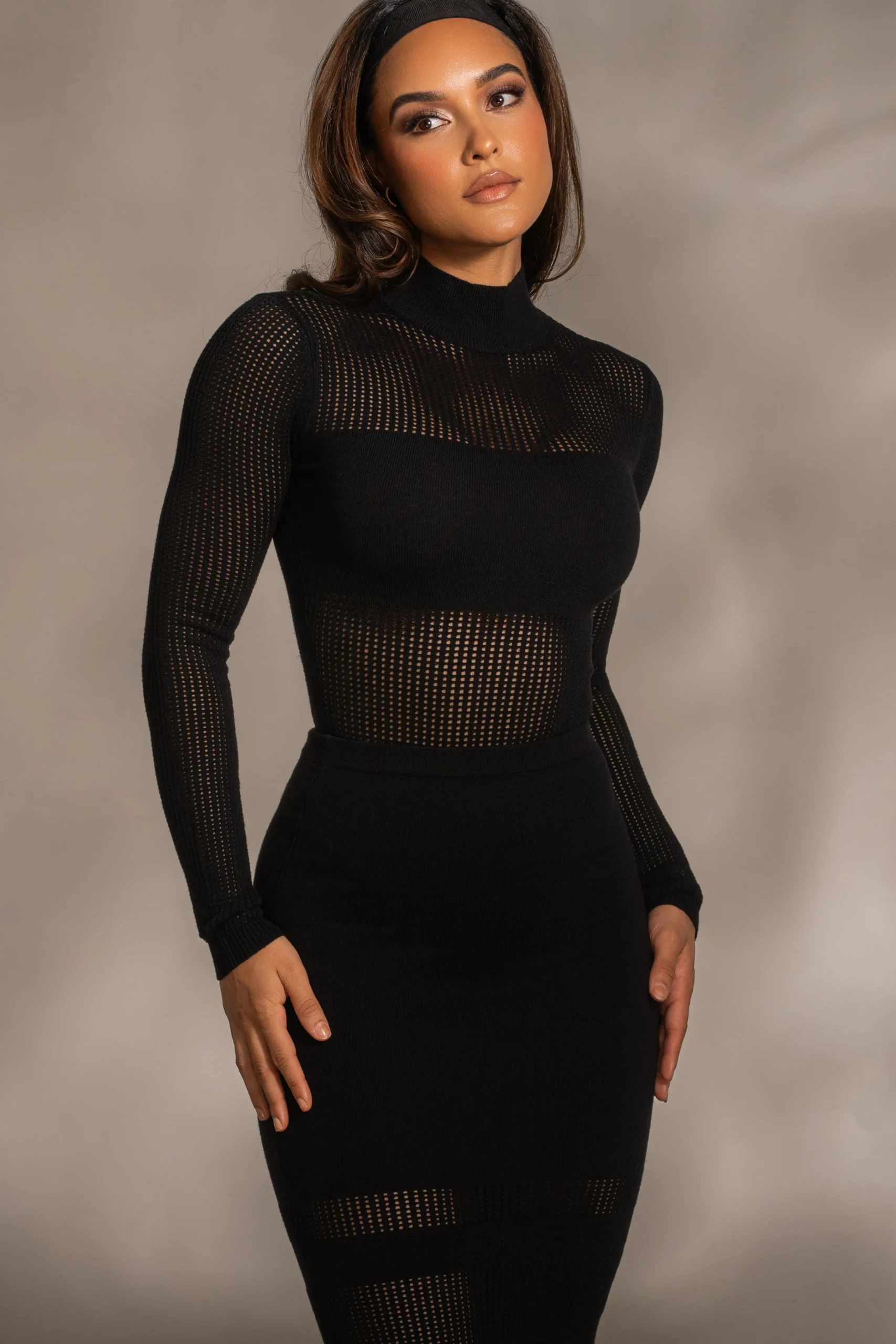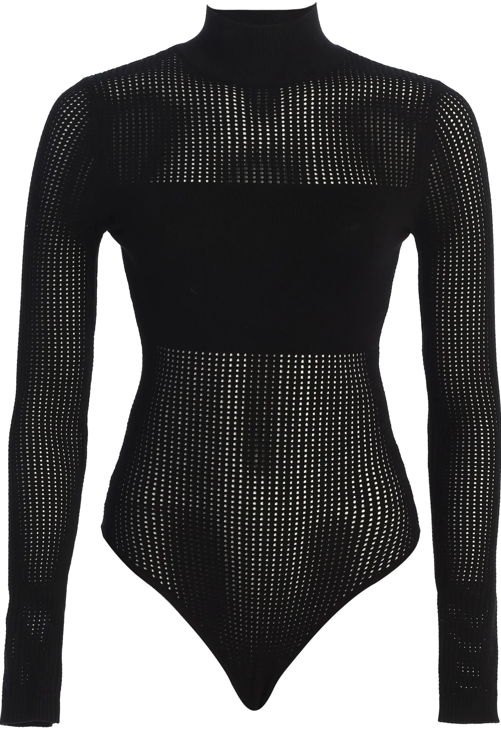 Introducing our Black Klaudette Knit Bodysuit. This captivating bodysuit showcases a semi-transparent design with a soft knit and contrasting pattern. Complete with a thong back and double snap closure. Pair with our Lina Knit Maxi Skirt for the full look. Single lined. Not sold as set.