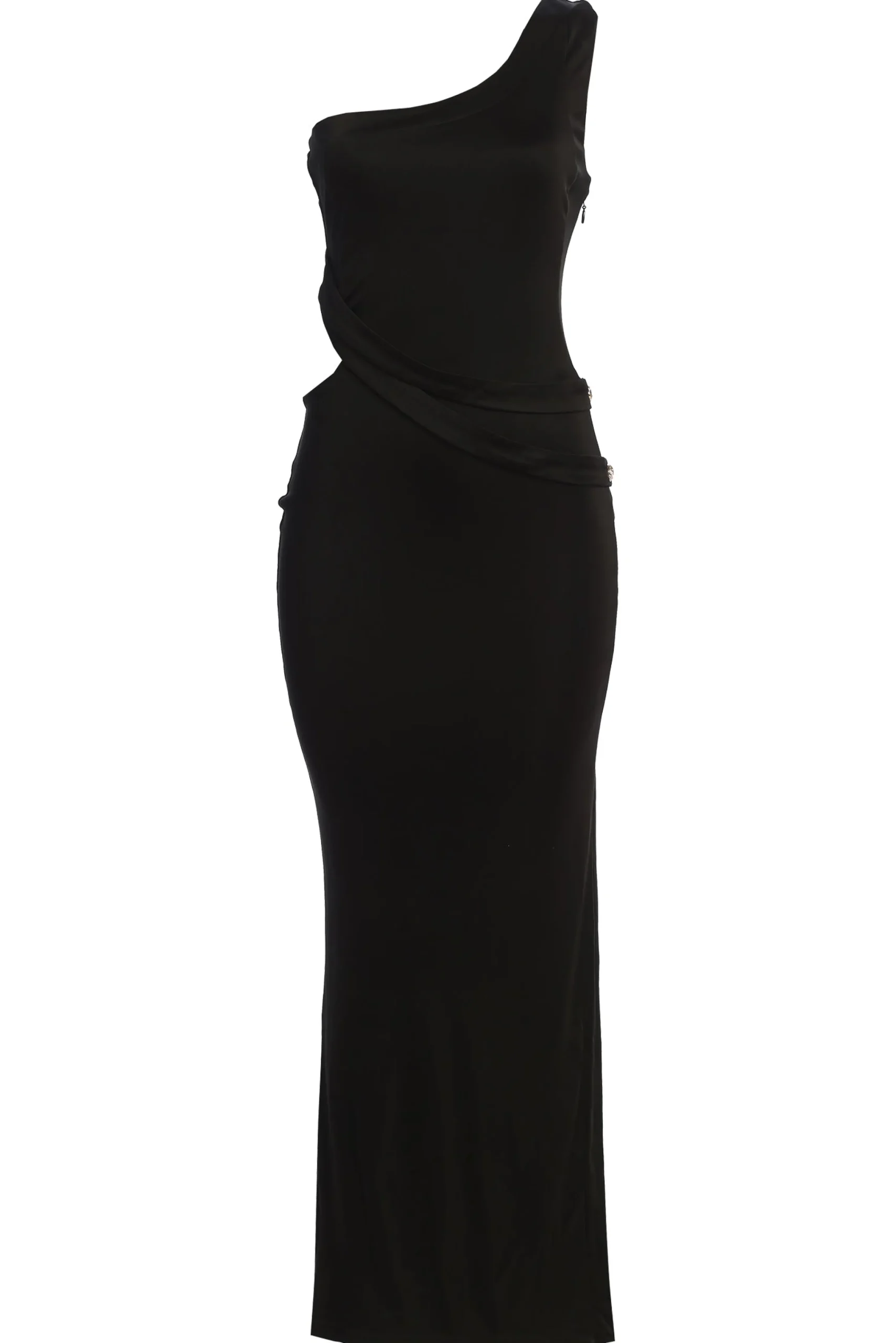 JLUXLABEL’s classics are reborn in the JAIDE Collection with a new, innovative twist. Radiate elegance in our Black Surrey Maxi Dress. This one-shoulder maxi dress features an elegant cutout at the side waist and luxurious golden button accents with a stylish side slit. Crafted from a double lined material for rich quality and comfort. Side zipper closure. Stretchy.