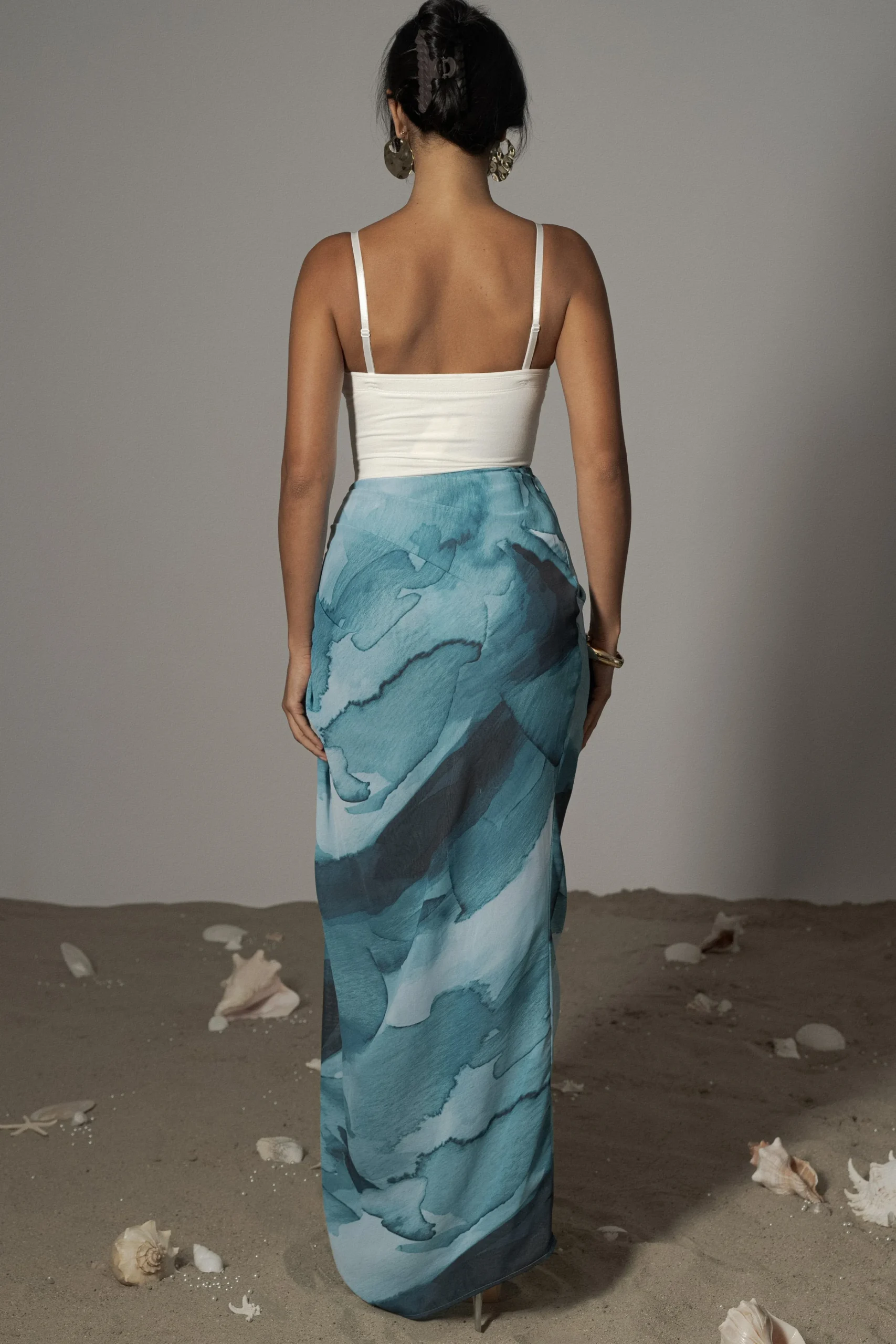 Draped to perfection with our Blue Noelia Printed Skirt. Our most loved skirt set has been redesigned in a stylish abstract print, adding a touch of modern flair to your wardrobe. Crafted from lightweight chiffon, this maxi skirt features a draped design with an abstract print, stylish drawstrings, and a side slit. Complete with a back zipper for closure and interior lining. No stretch.