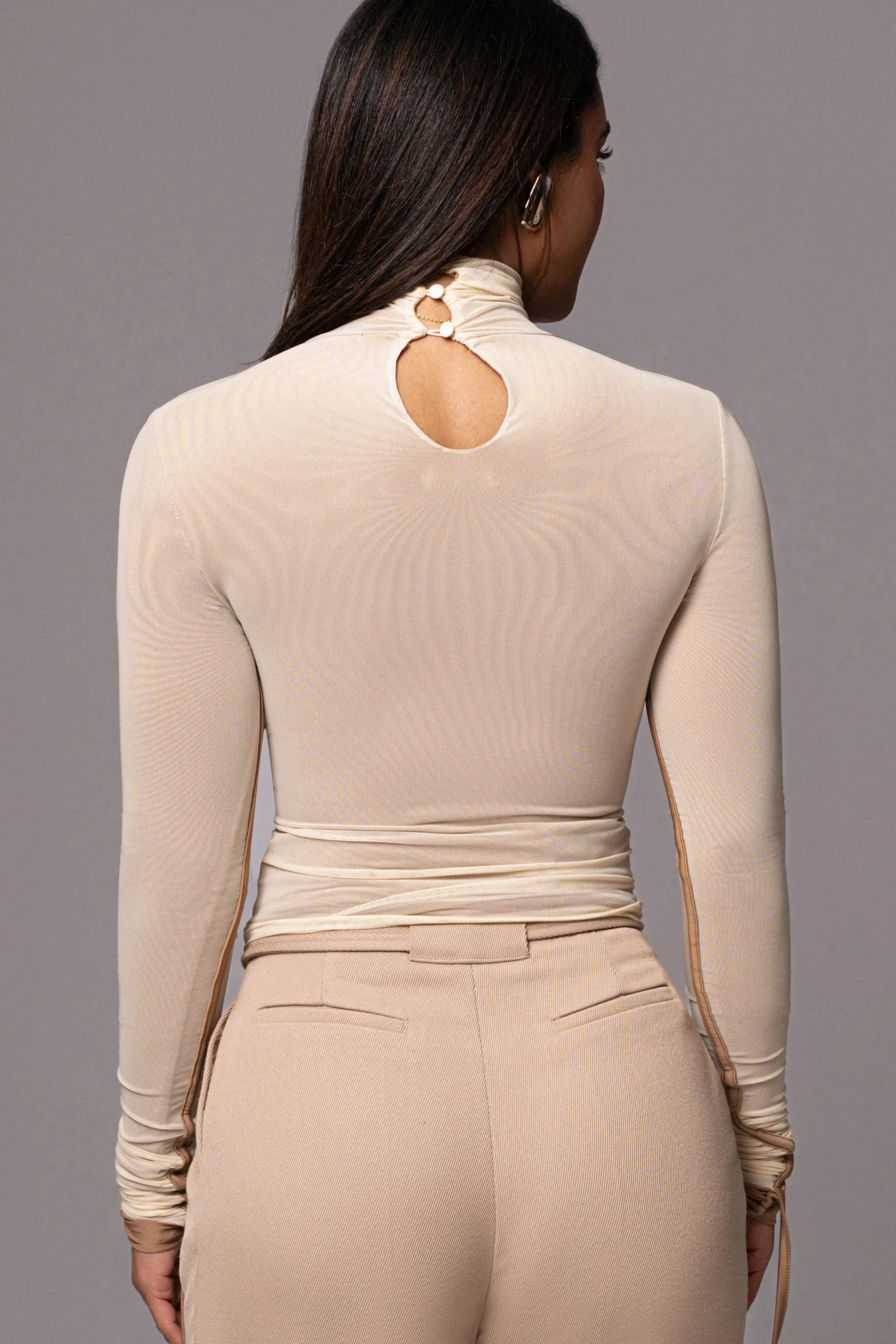 Introducing our Buttercream Santiana Turtleneck Top, a must-have for your winter wardrobe. Crafted in mesh fabric with nude underlining, this long sleeve top features a turtle neckline with intricate gathering detail throughout and non-functional drawstrings. A back keyhole with neck button closure complete the look. Pair with our Revival Belted High Waist Pants for the full look. Stretchy. Double lined.