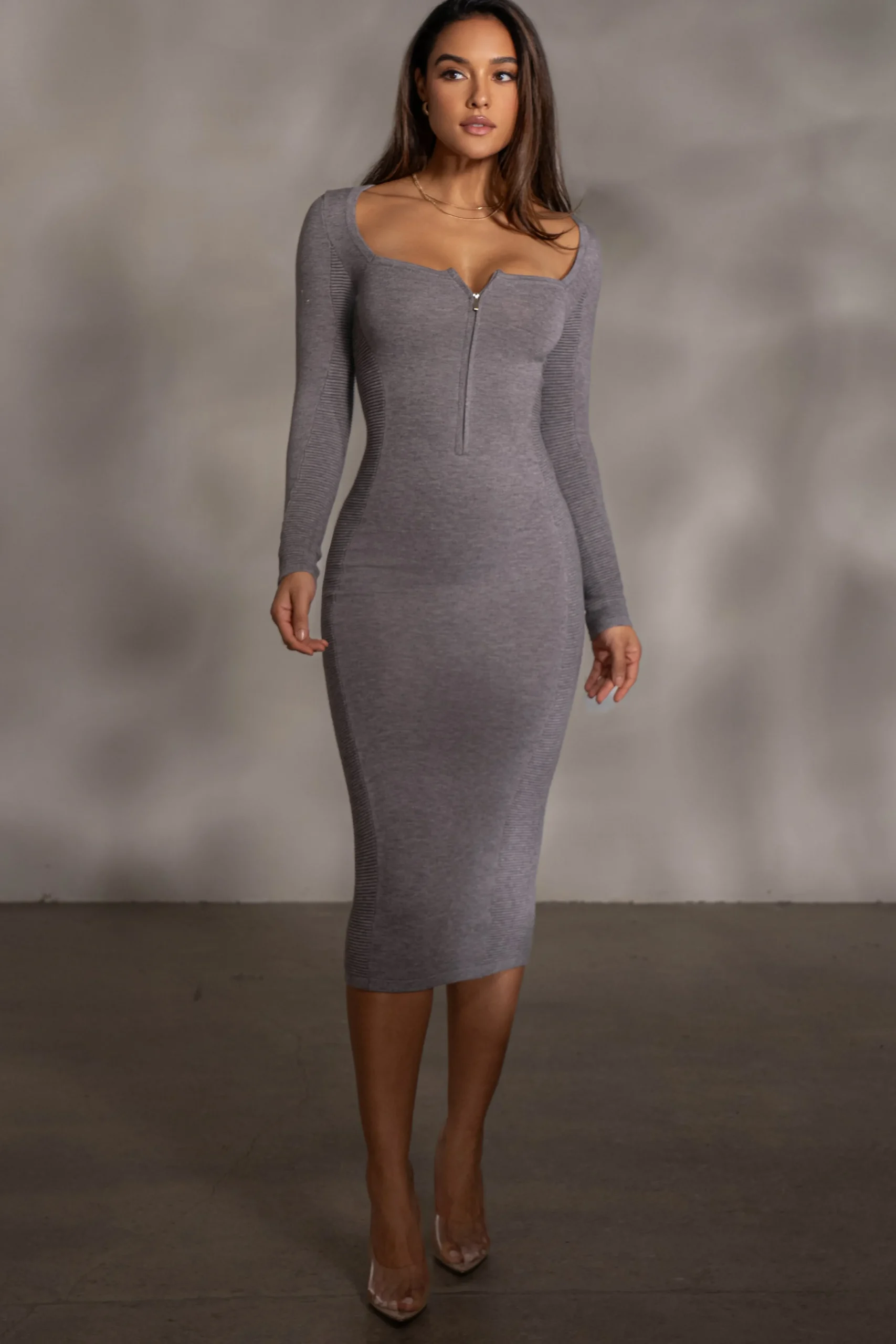 Stay stylish and cozy in the cold weather with our Grey Pollie Midi Dress. Crafted of soft knit material, this long sleeve dress comes with a square neckline, front zipper design, and ribbed detailing for extra style and function. Single lined. Stretchy.