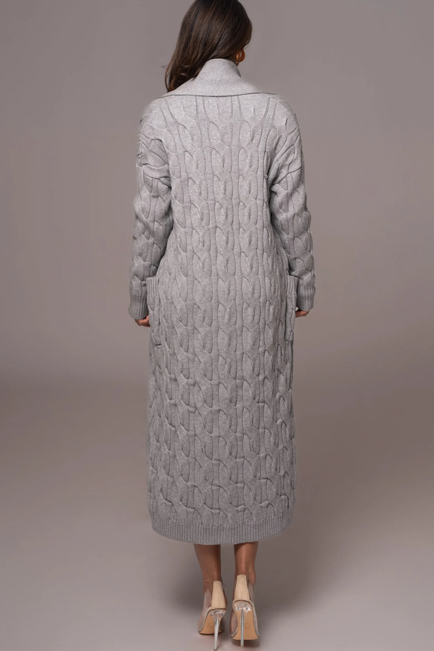 Wrap yourself in warmth and style with our Grey Stepping Out Sweater Cardigan. This longline cardigan features a luxurious cable-knit pattern with shawl collar, ribbed cuff sleeves, and two functional welt pockets. Pair with our Take Notice Top and Timeless Midi Skirt for the full look. Stretchy. Oversized.