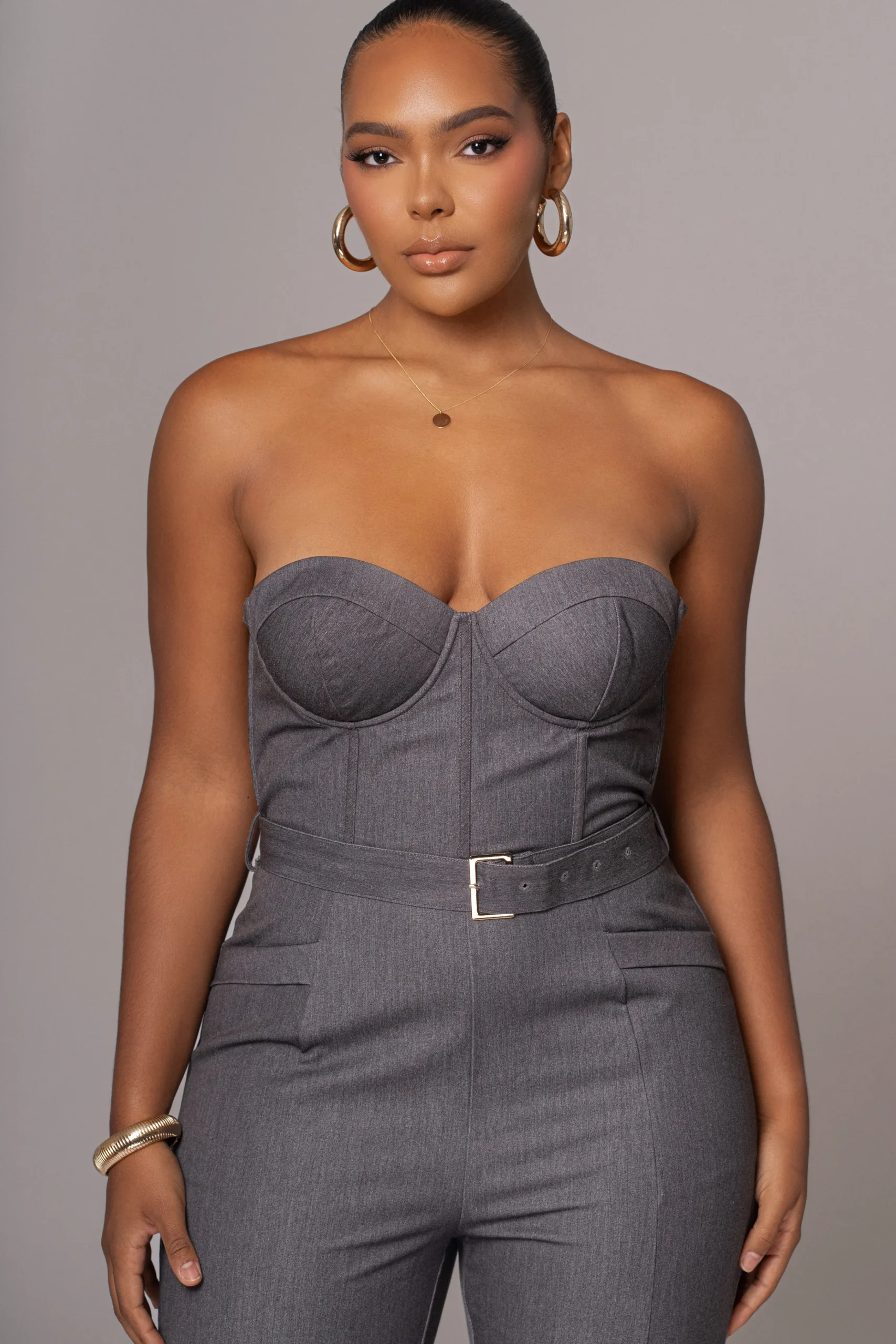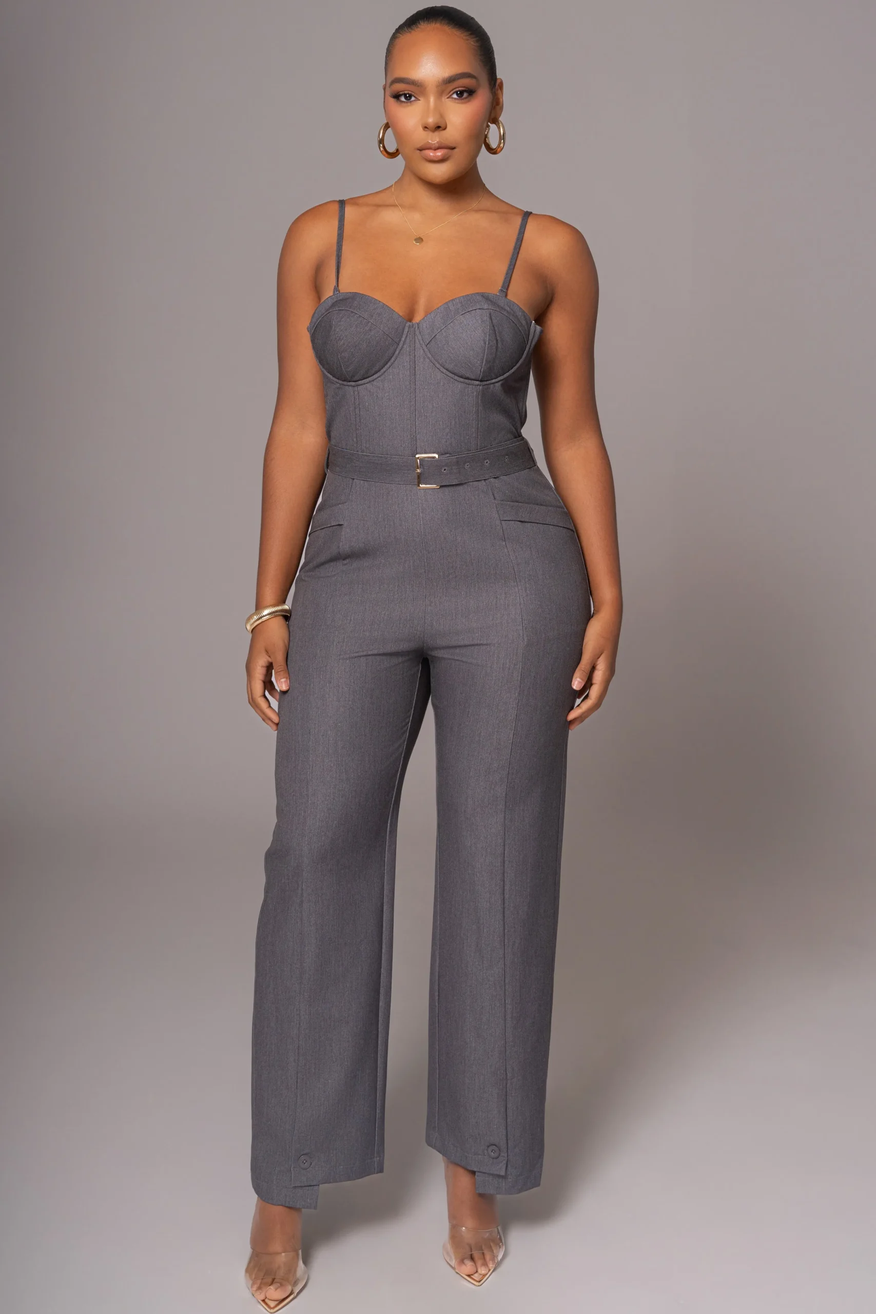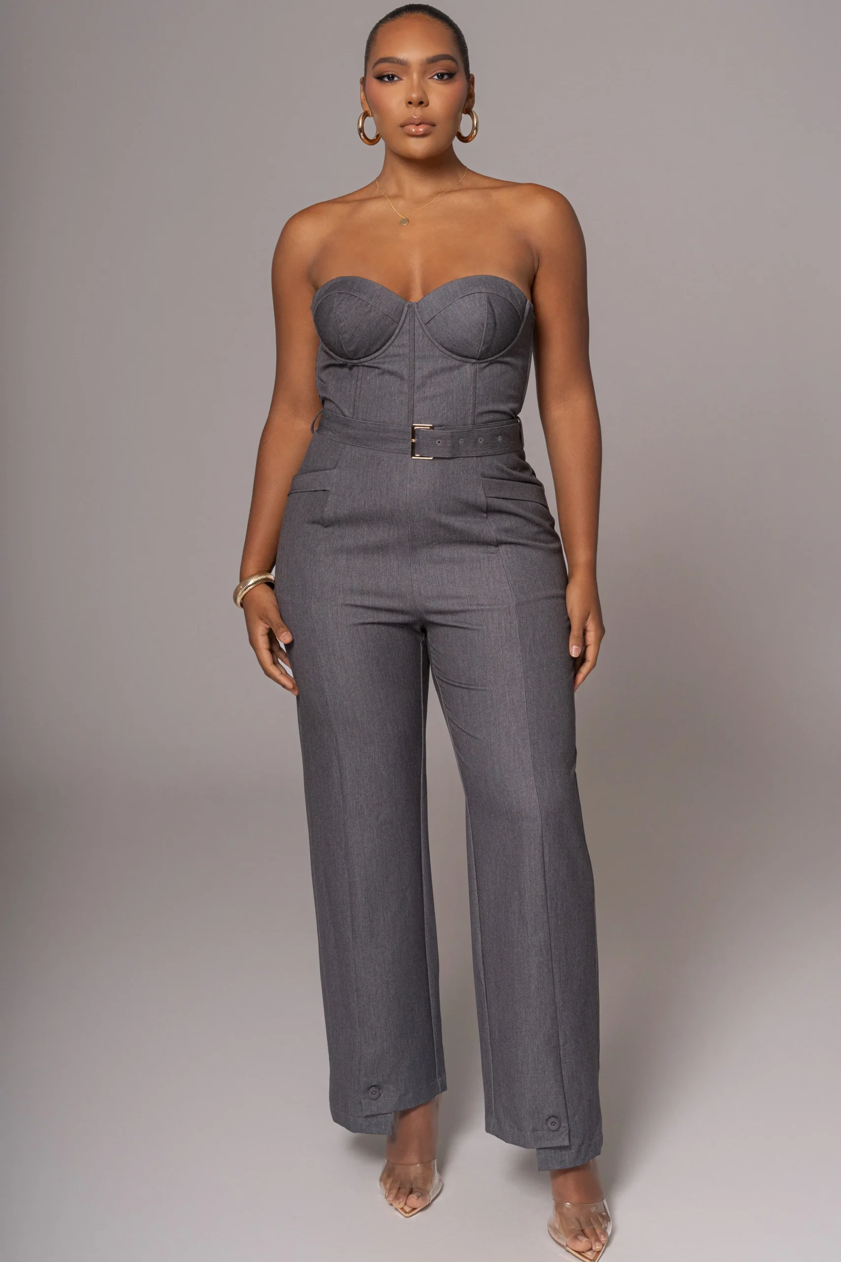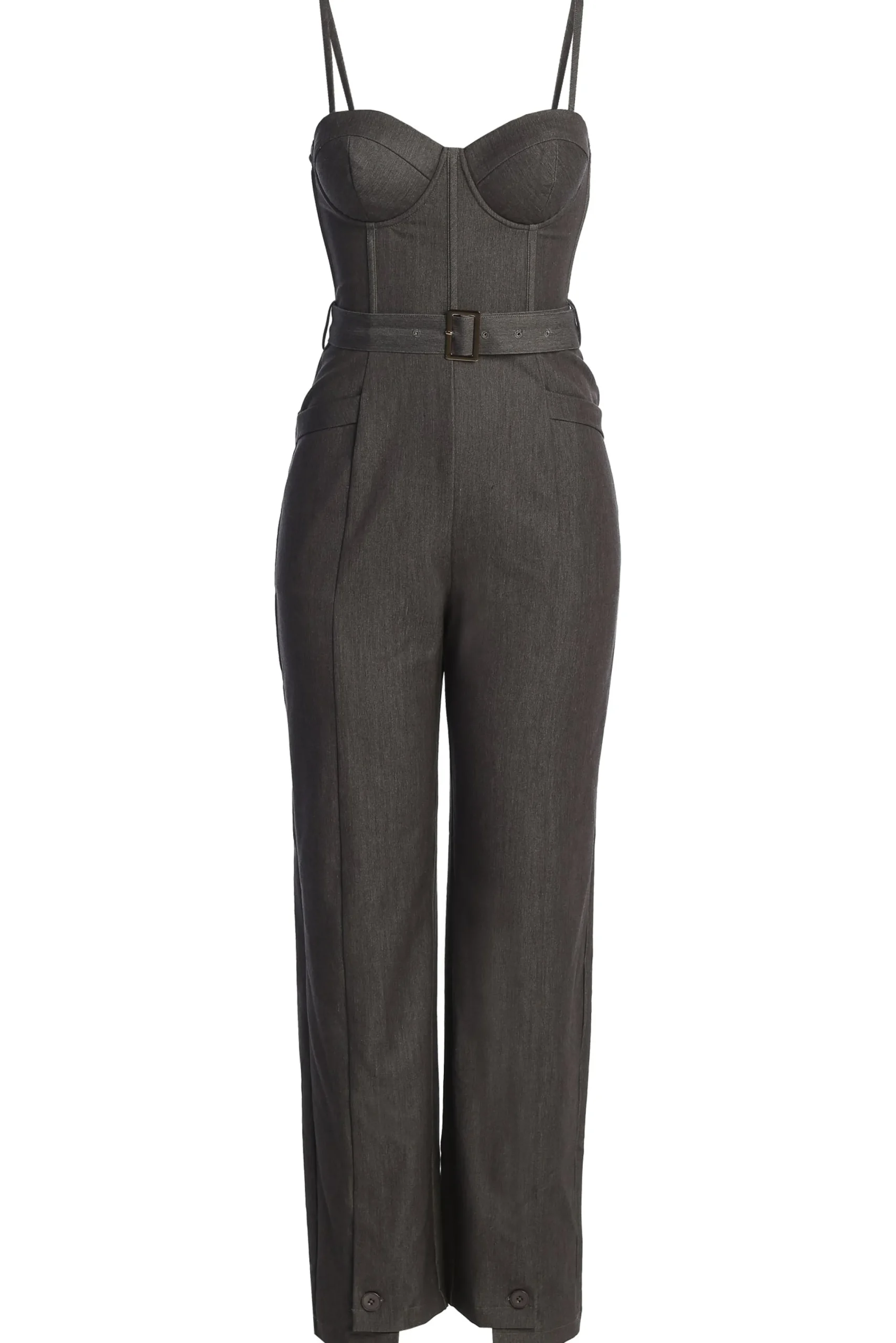 Power meets elegance with our luxurious Grey Sweetheart Aroma Jumpsuit. This suit-inspired design features a bustier-style bodice with thin removable/adjustable shoulder straps, padded wired cups, and boning for added structure. Functional side pockets offer convenience, while the back zipper closure ensures easy wear. Finished with a matching waist-belt featuring a sleek gold-tone squared buckle, and straight-leg hems adorned with functional side buttons. Complete with non-slip silicone at the bust for a secure hold. Back faux pockets. Minimal stretch. Single lined.