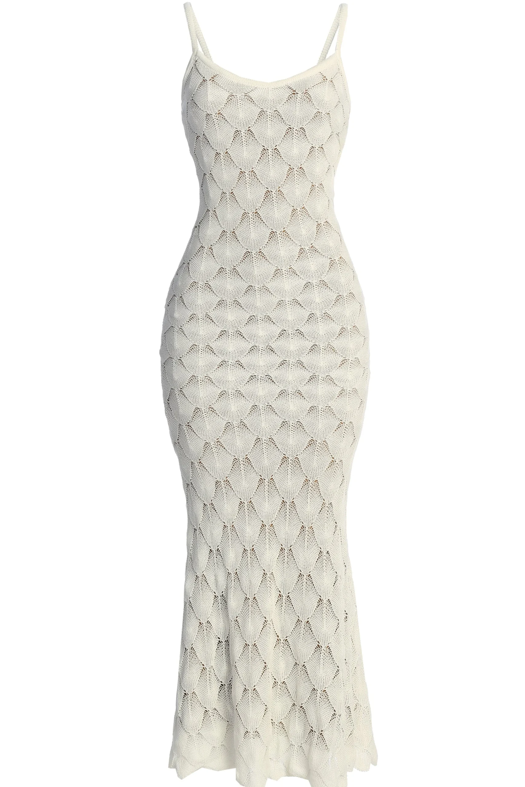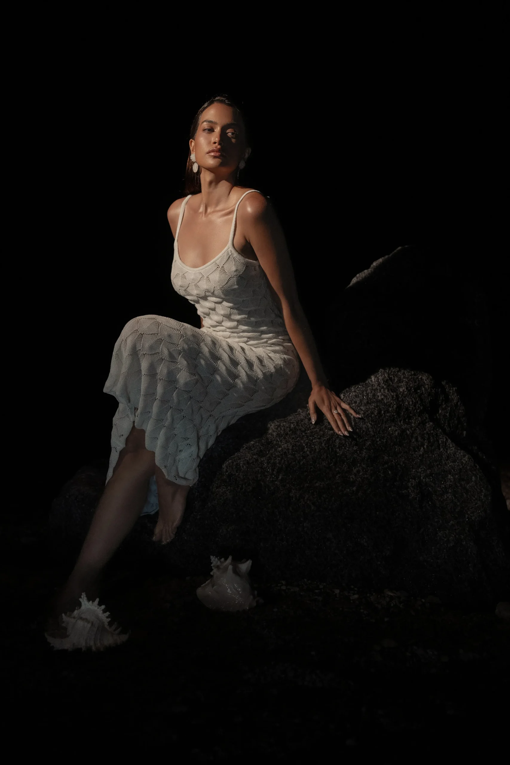 Create magical moments under the sun in our new Ivory Gabriela Knit Maxi Dress. Crafted in a knit fabric with seashell shaped pattern, this maxi dress features a fitted silhouette with a soft V neckline, and adjustable shoulder straps. A nude lined interior with flared sweep finishes the look. Double lined. Stretchy.