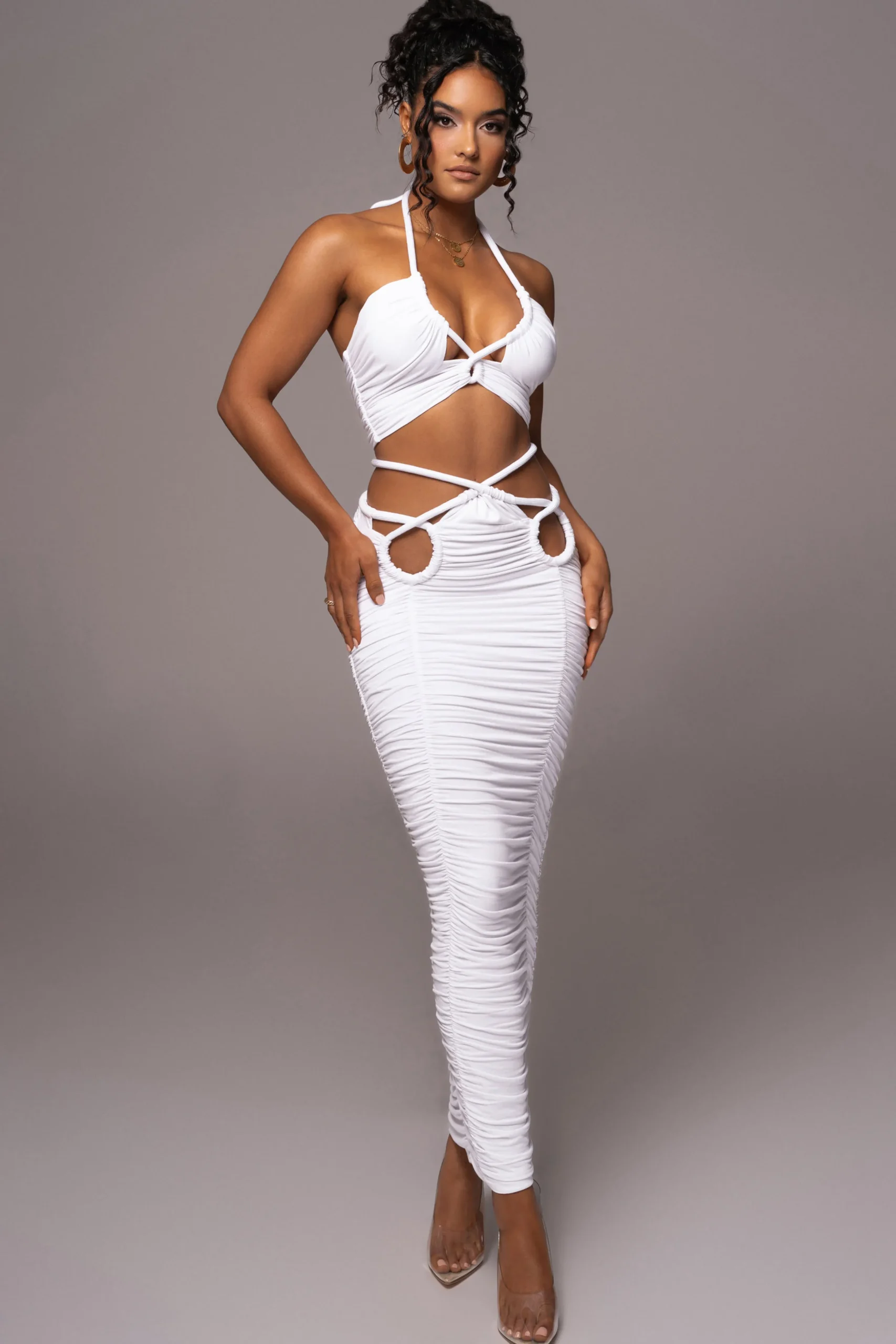The new Ivory Go The Distance Skirt Set is perfect for Summer’s most formal occasions. This dreamy skirt set features a halter top with a cutout design adorned with stylish rope-inspired tie closures. The matching maxi skirt comes with stylish rope-inspired ties with adjustable fitting for the perfect fit! Ruching throughout adds a flattering touch of texture. Sold as set. Double lined.