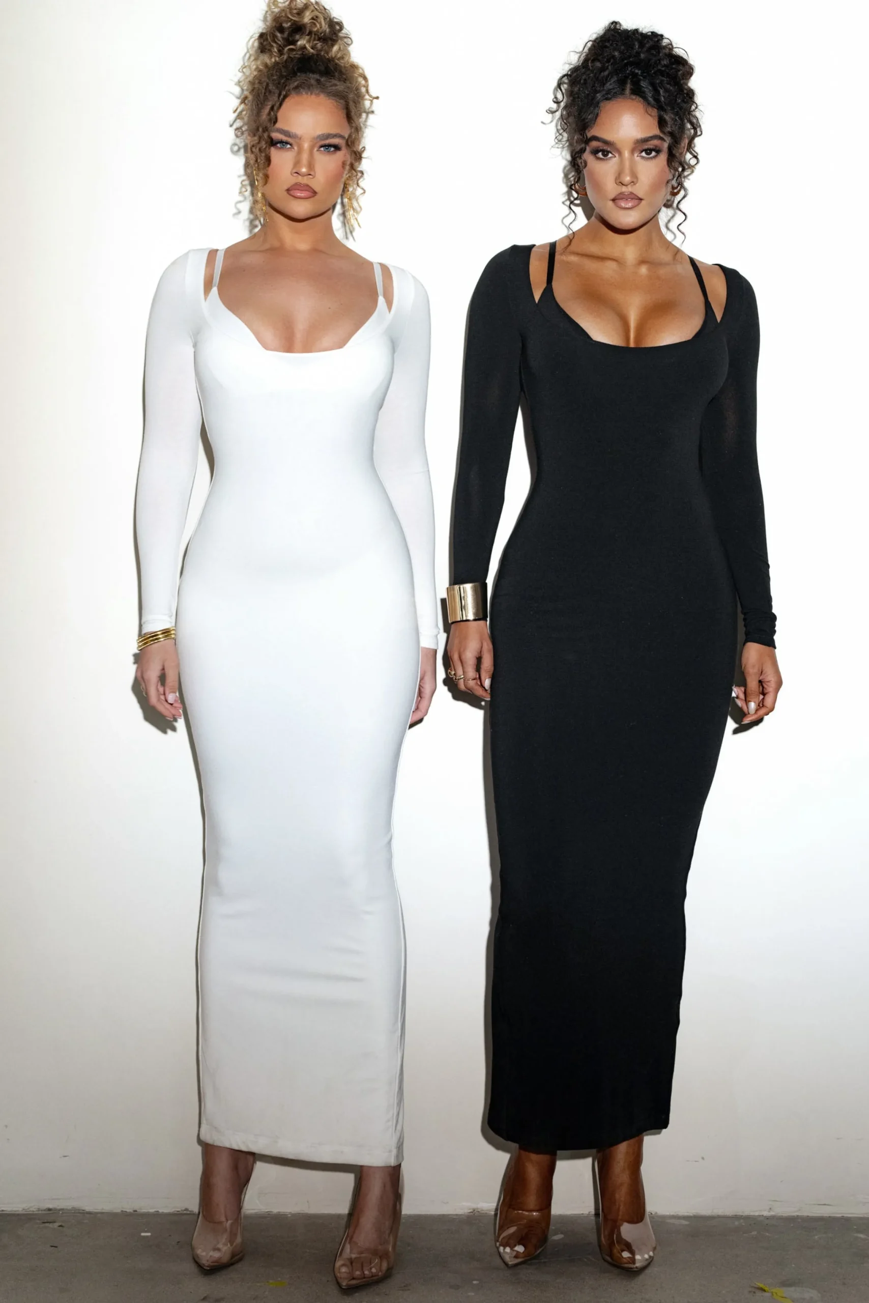 Achieve the perfect blend of classic with a touch of modern in our new Ivory Made You Look Maxi Dress. This gorgeous combo dress features a triangle bra top layered under a smooth, soft maxi dress with long-sleeves in a sleek body-con silhouette. Adjustable straps. Double lined with stretch.