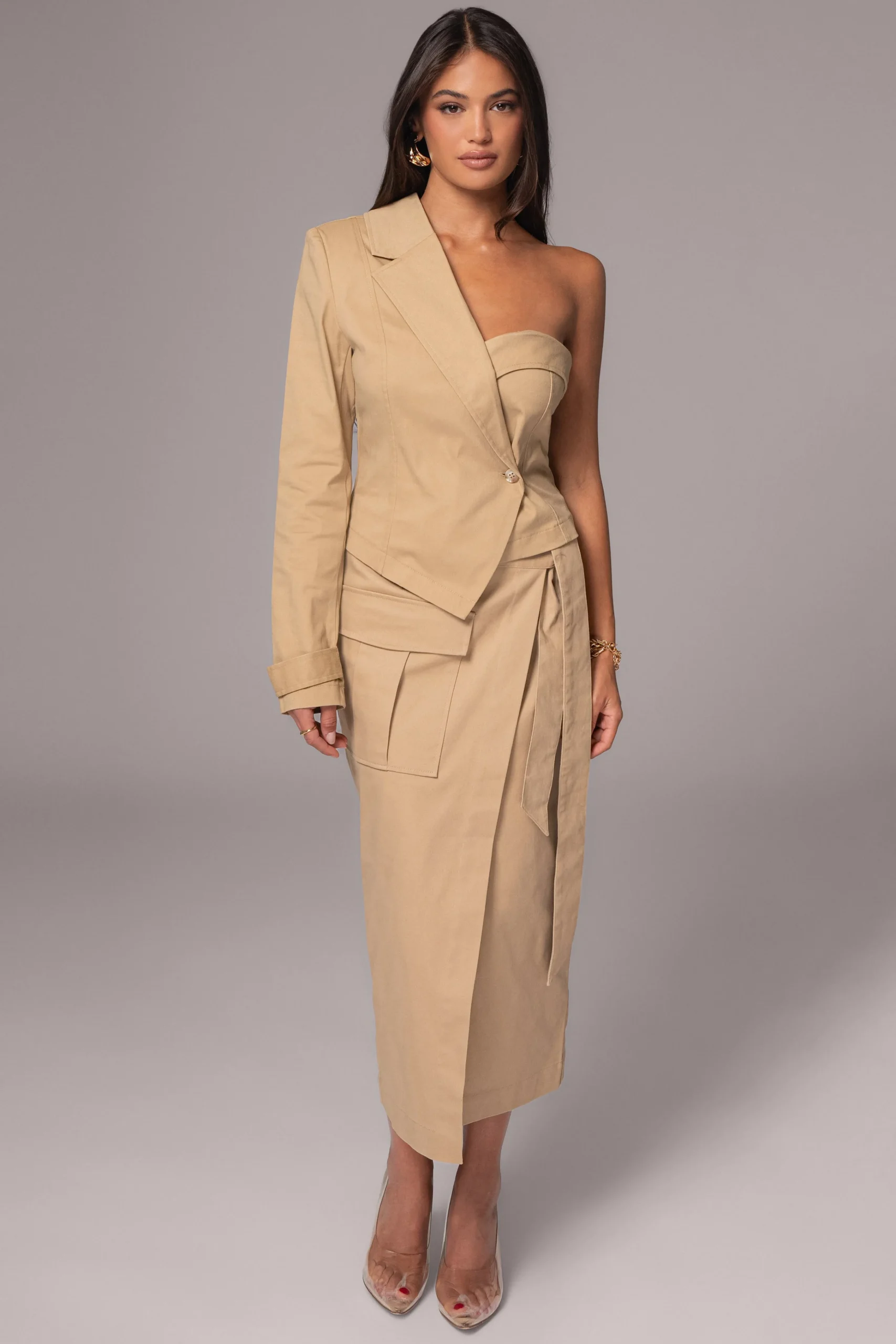 Unleash your style with our Khaki City Life Cargo Skirt. This versatile skirt features a stylish side slit with self tying bands and a cargo pocket to keep your essentials close at hand. Crafted from a single-lined material with a convenient back zipper for easy wear. Pair with our Amal One Shoulder Top for the full look. No stretch.