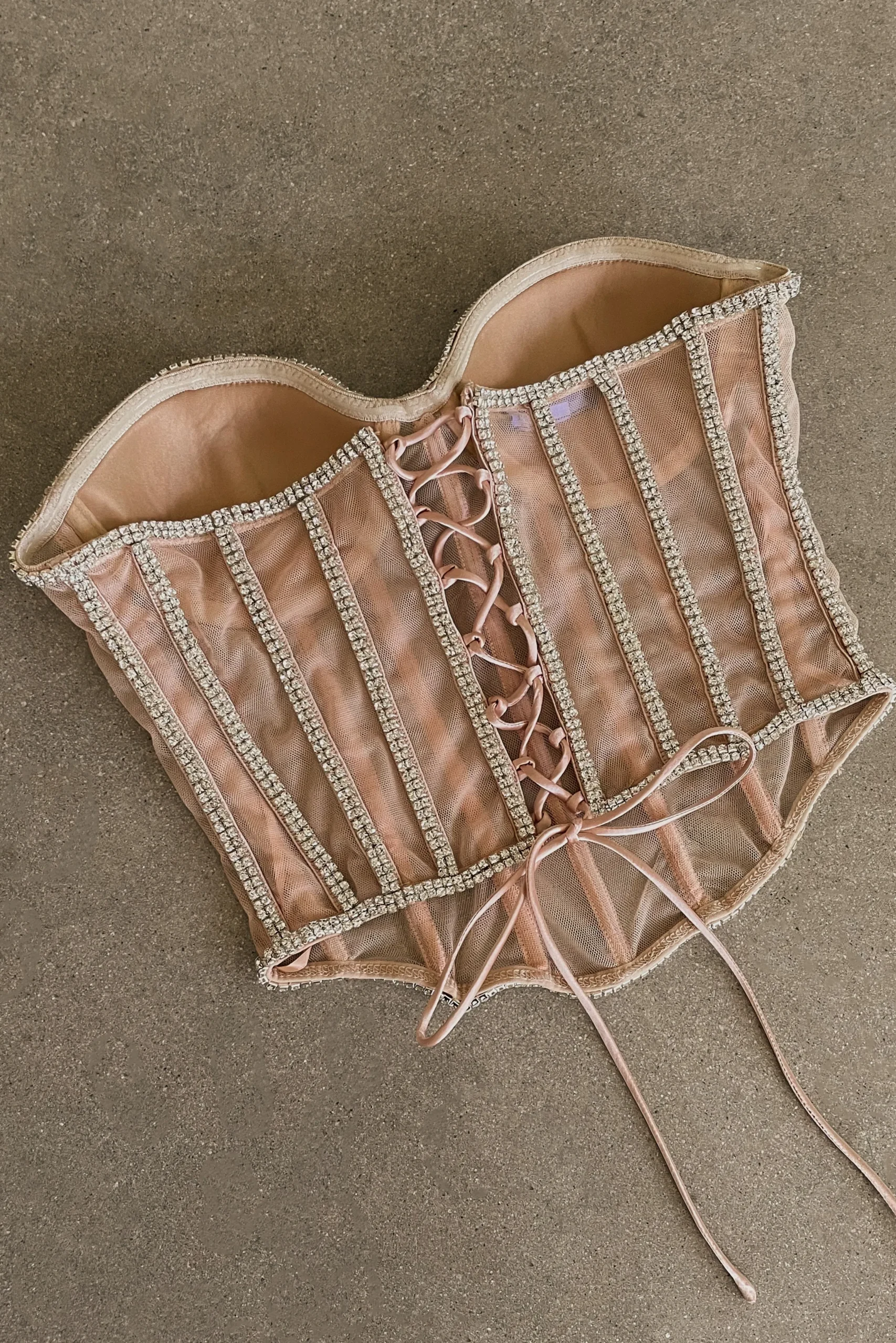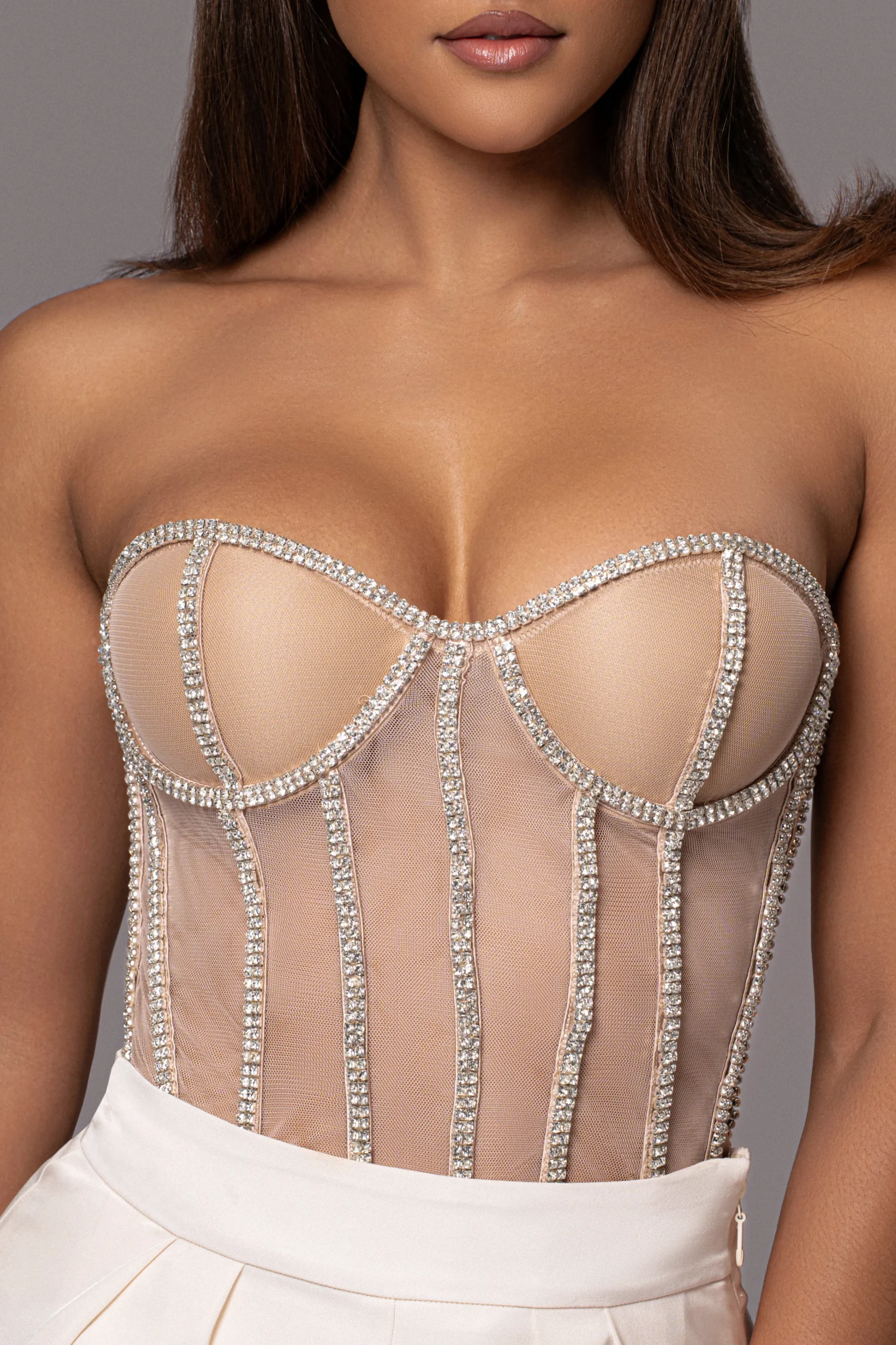 Add sparkle to every celebration in our lavish LIMITED EDITION Light Rhinestone Crystal Corset! This glamorous corset top is sure to command attention in a delicate design embellished with dreamy rhinestones throughout. Featuring a sweetheart neckline, this corset top comes with a boned bodice, padded/wired cups, and a stunning lace-up back with adjustability. Constructed of a see-through mesh netting material for a nude illusion. No Stretch.