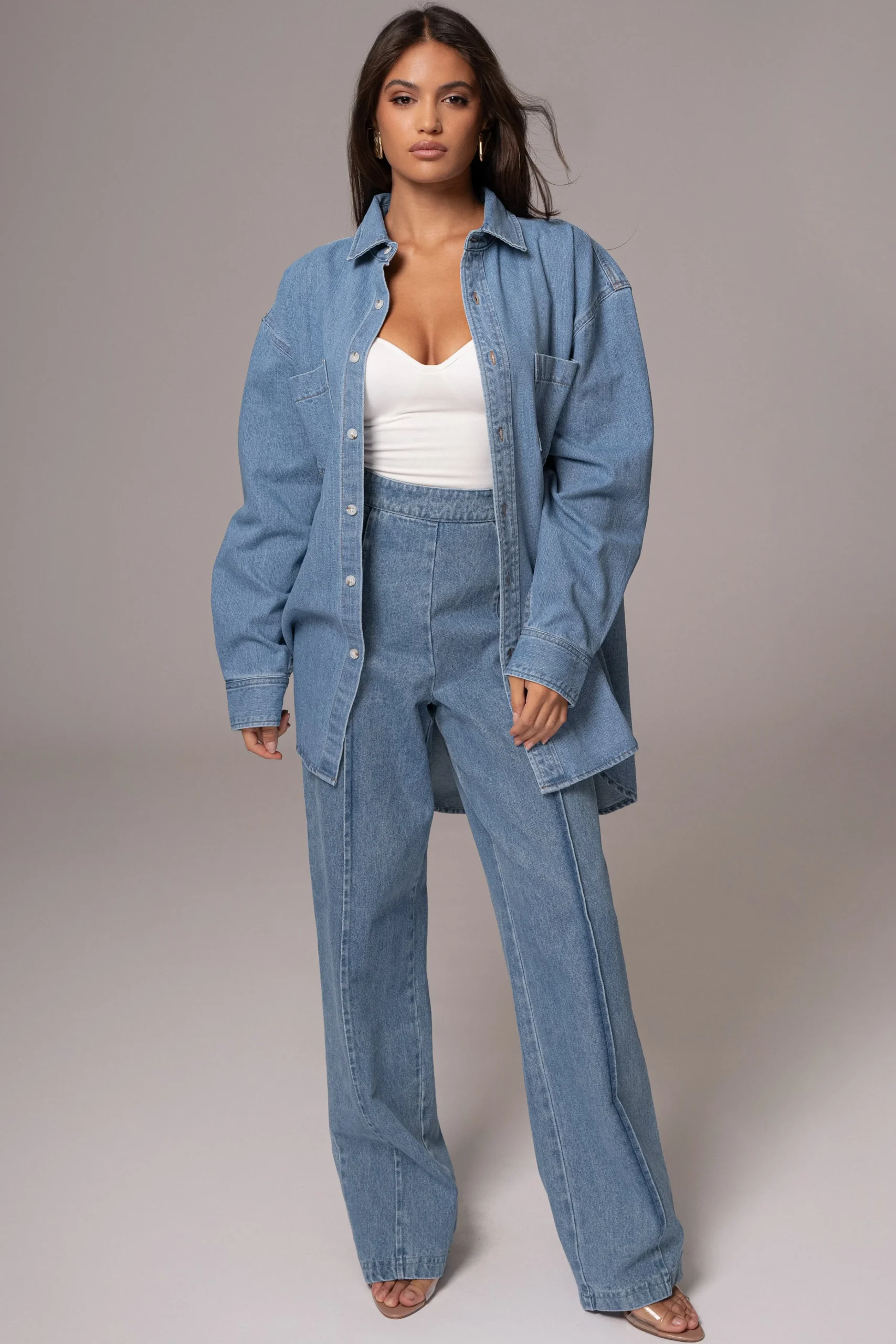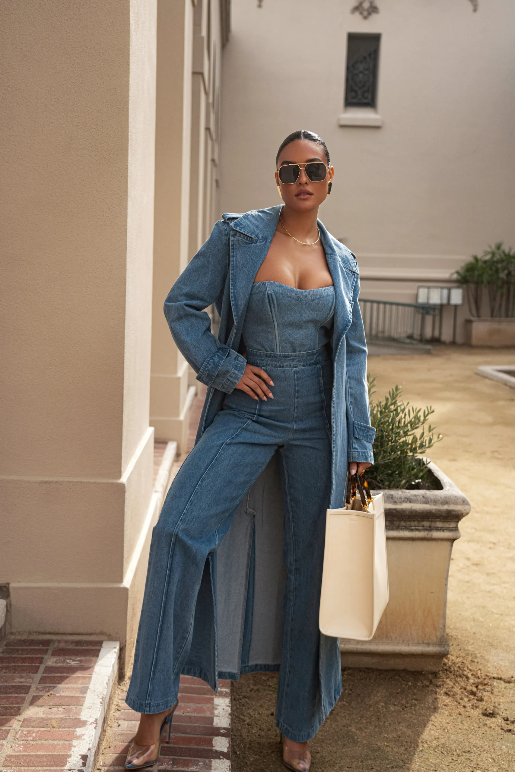 Our Medium Wash Stay Sharp Denim Trousers were designed for seamless transitions from work to the weekend. We took one of our most loved designs and reimagined it in premium denim, elevating its style with superior quality and a modern twist. The trousers feature a banded waistband with wide leg hems and elegant princess seams along the center front and back legs. Pair with our All You Need Denim Corset for the full look. No stretch. Back zipper closure.