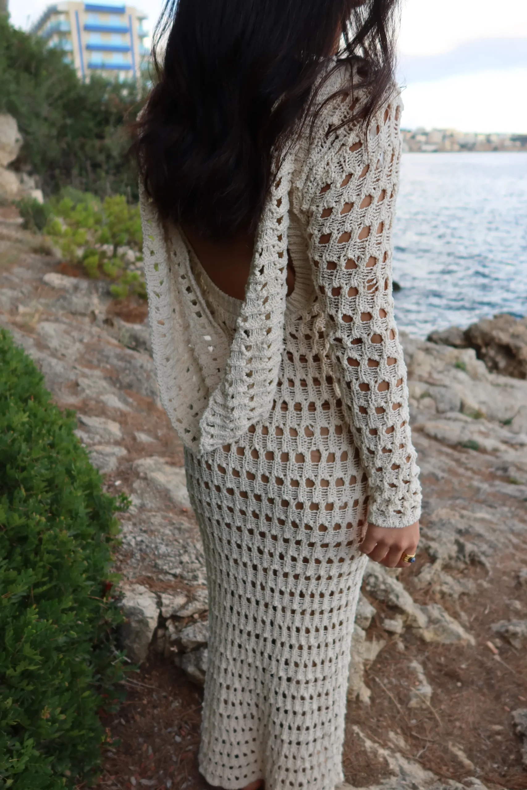 Step under the sun with our Milk Serene Wonders Crochet Dress. Designed with expert attention to detail, this mesmerizing maxi dress features a classic neckline, long sleeves, and a stunning draped cowl back that can be removed for more than one styling option. Crafted from an open knit material with nude interior lining. Stretchy.
