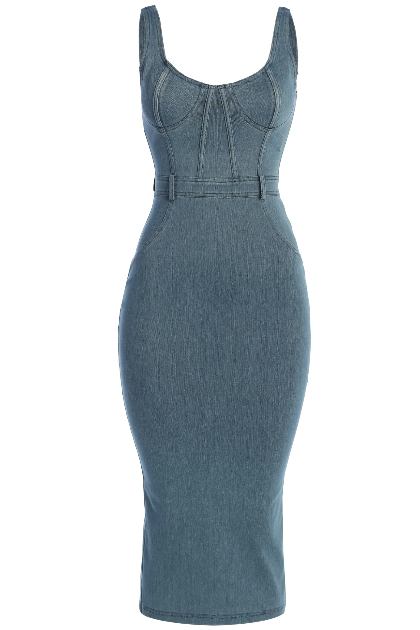 Introducing JLUXLABEL x NAT & LIV DENIM PT 2. The Malika Denim Midi Dress showcases an alluring bustier-style design with a u-neckline, padded cups, and boning detail for added structure and style. Crafted from high-quality stretch denim, this unique midi dress details belt loops at the waist, creating the illusion of a skirt/top combination. Complete with hidden back zipper closure. Stretch.