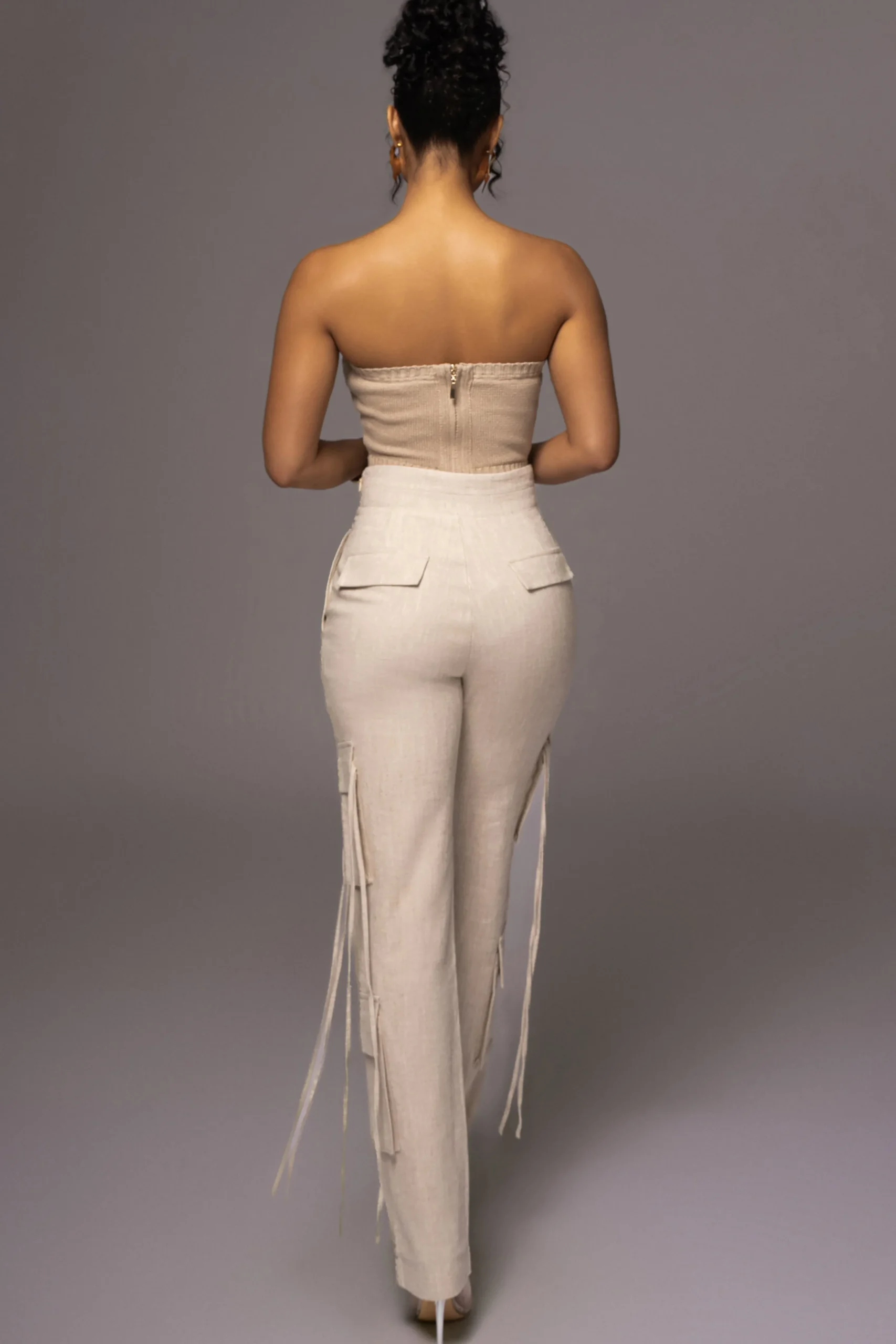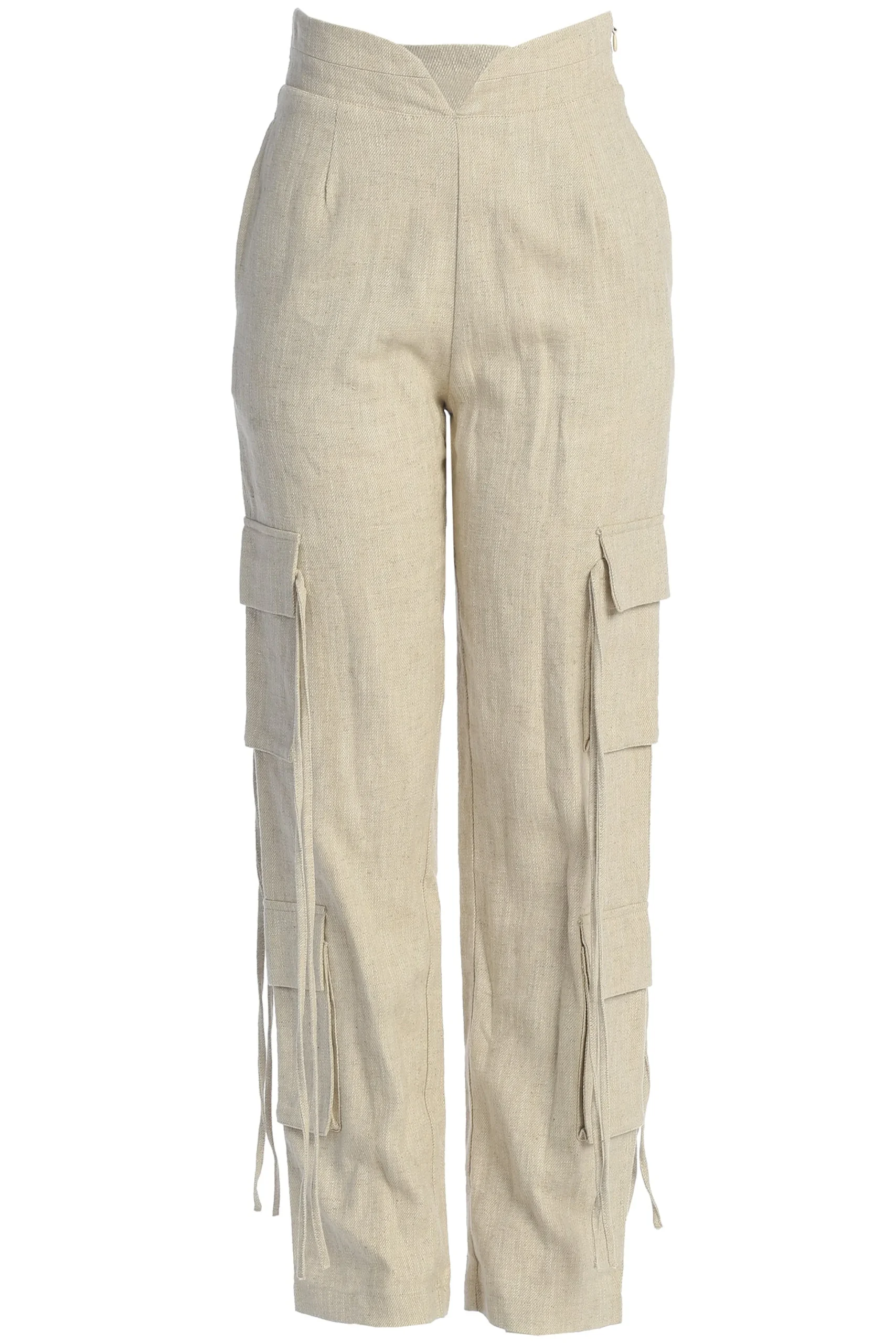 Add a modern twist to your usual cargos with our Natural Better Half Linen Utility Pants. Crafted from a lightweight linen fabric, these unique cargo pants showcase a front slit waistband with functional cargo pockets and adjustable drawstrings attached to the top pockets. Complete with lined interior and a hidden side zipper closure. Pair with our Stay In Touch Bustier for the full look. Minimal stretch.