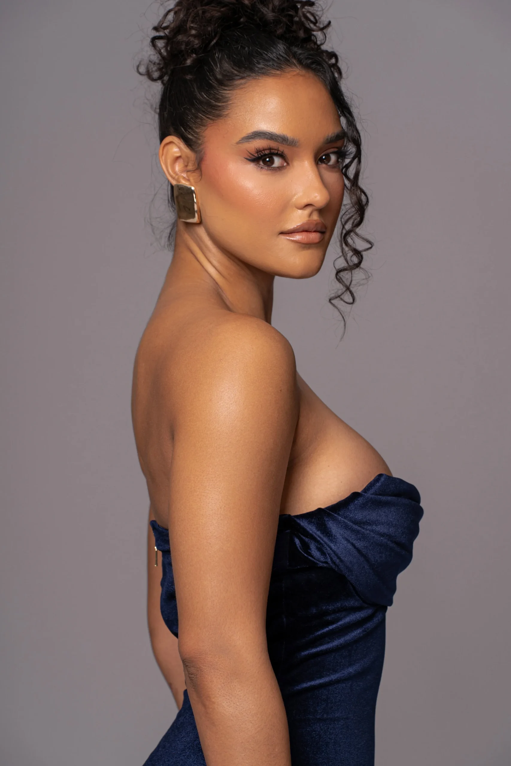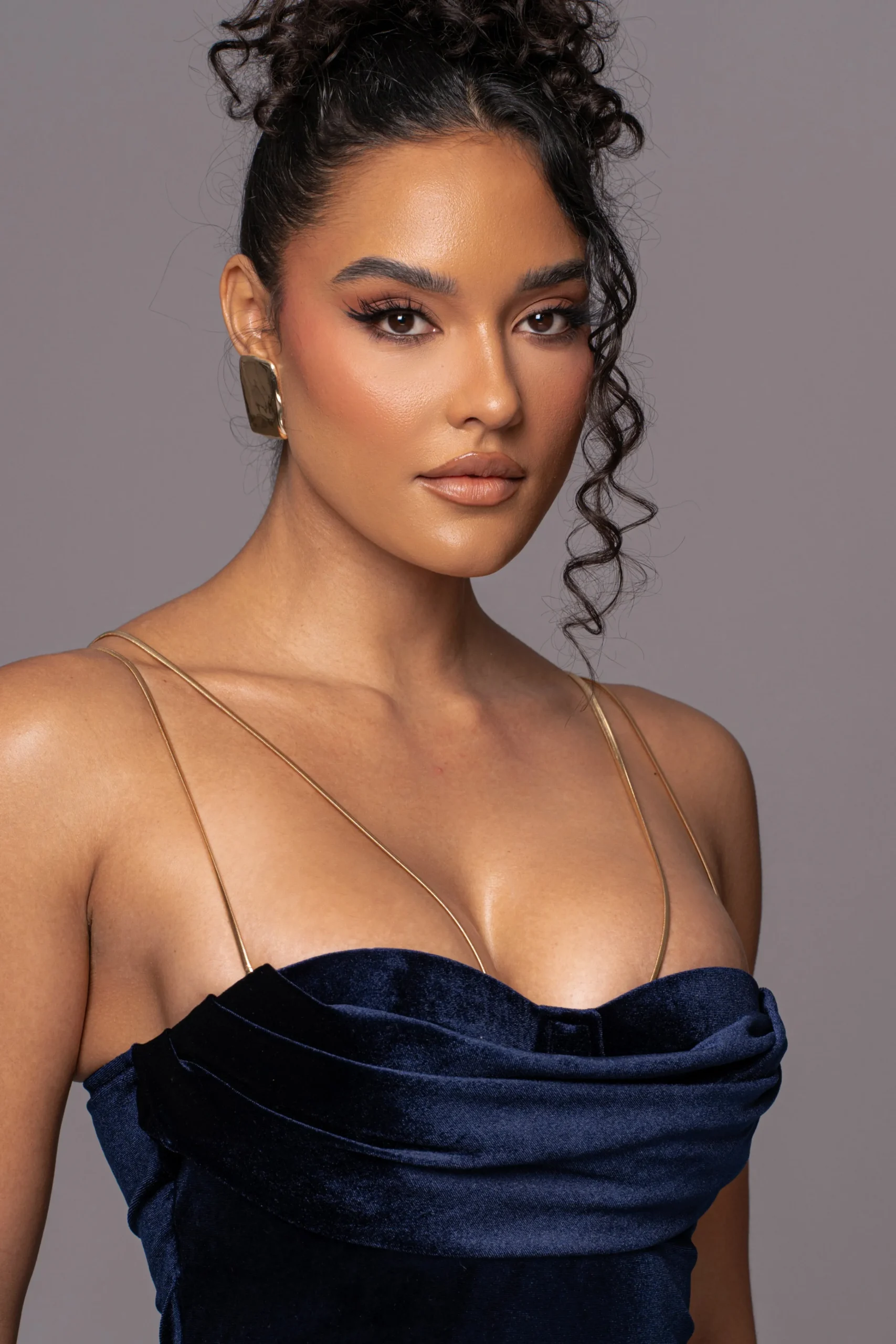 Our Navy JOSANNA VELVET MIDI DRESS is a statement on its own. We’ve taken one of our most loved designs “Visions Of You Midi Dress” and reimagined it in luxurious velvet, elevating its style for a modern twist. This midi dress features a sweetheart neckline with cowl detail, padded cup support, and grip silicone gel at the bust for a secure hold. Removable/adjustable chain shoulder straps dipped in a gold-tone elevate the look offering more than one styling options. Hidden back zipper closure. Stretchy. Double lined.