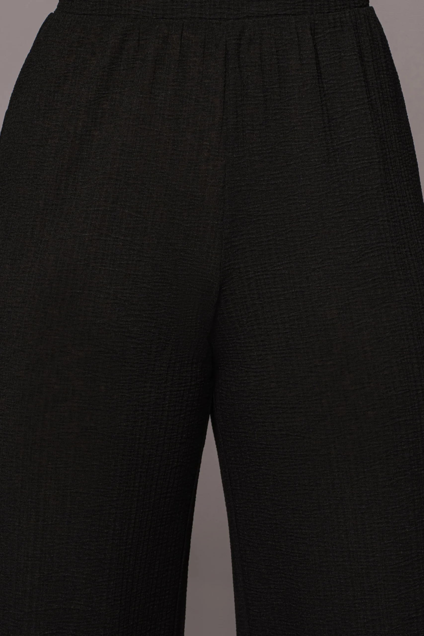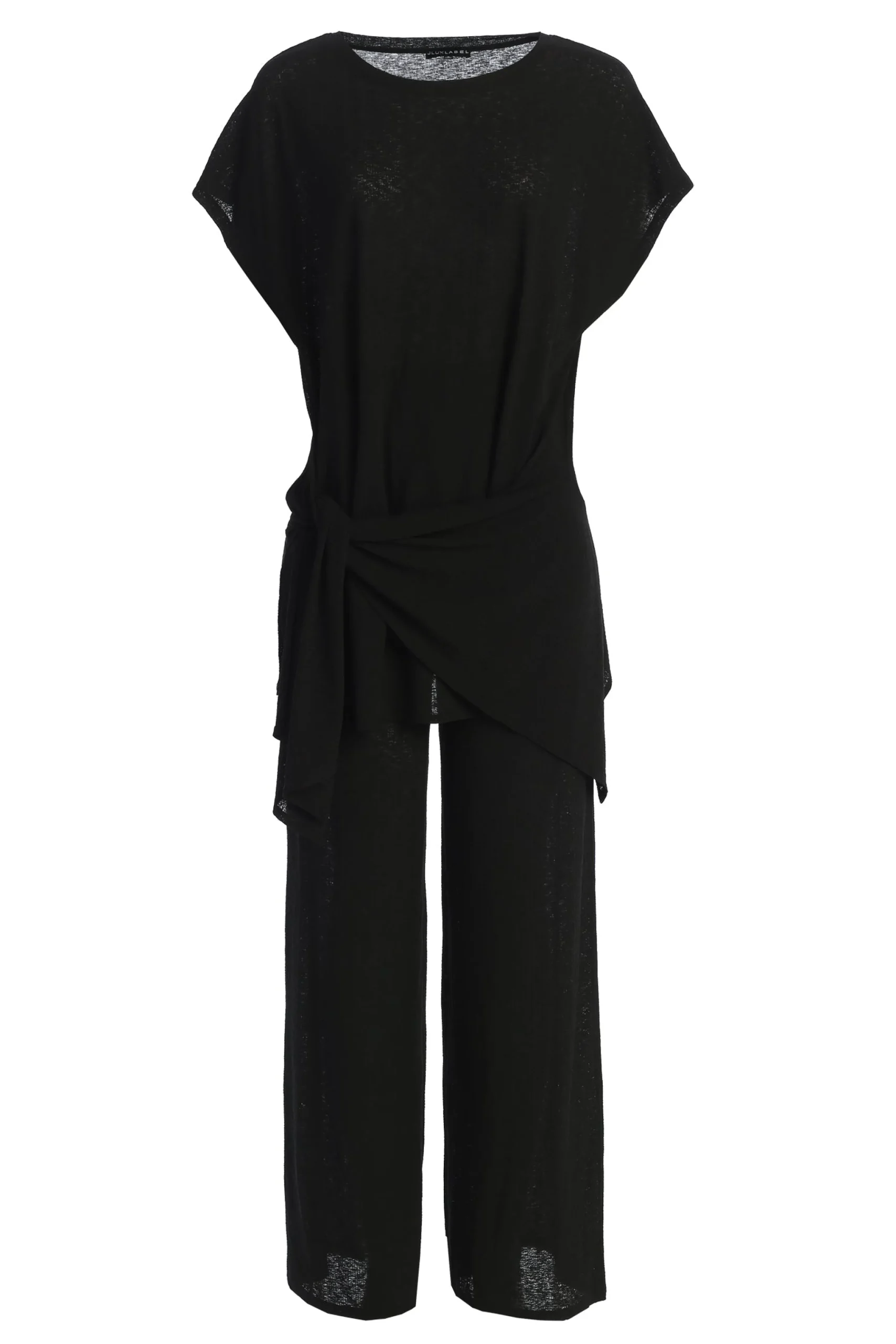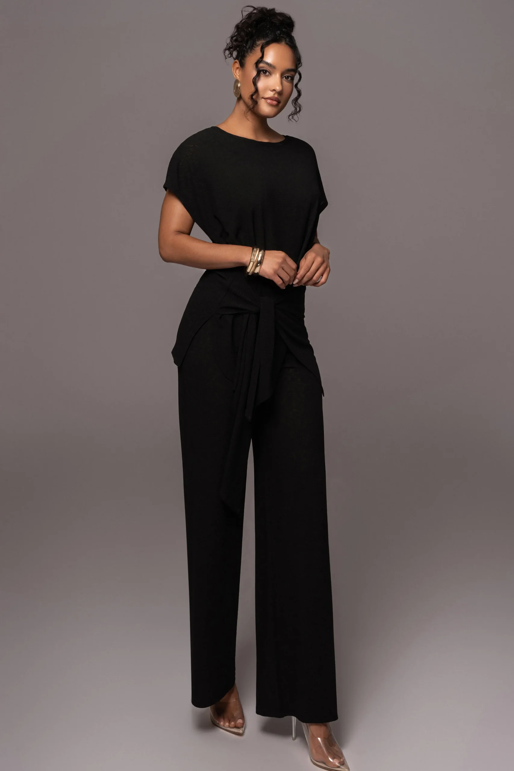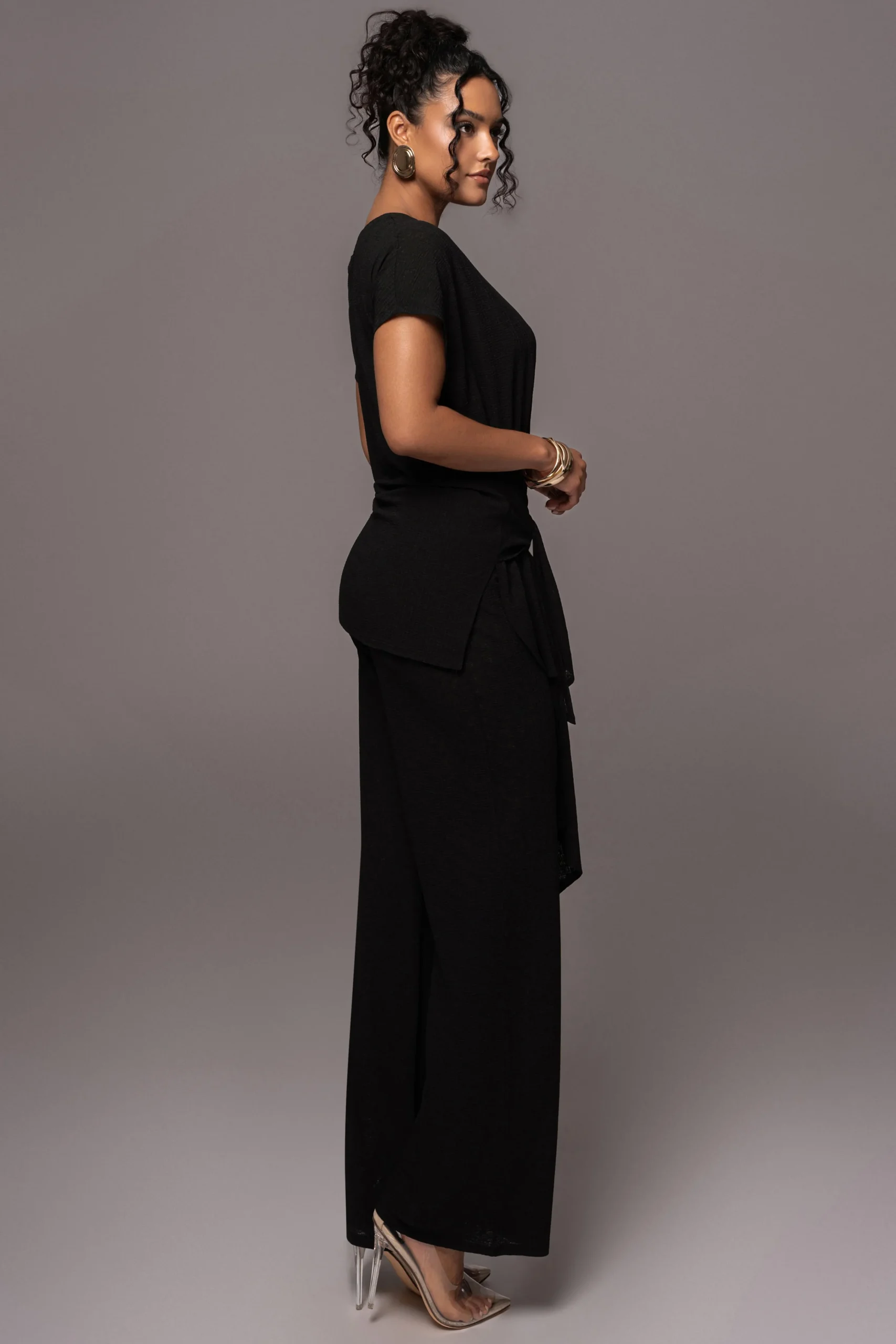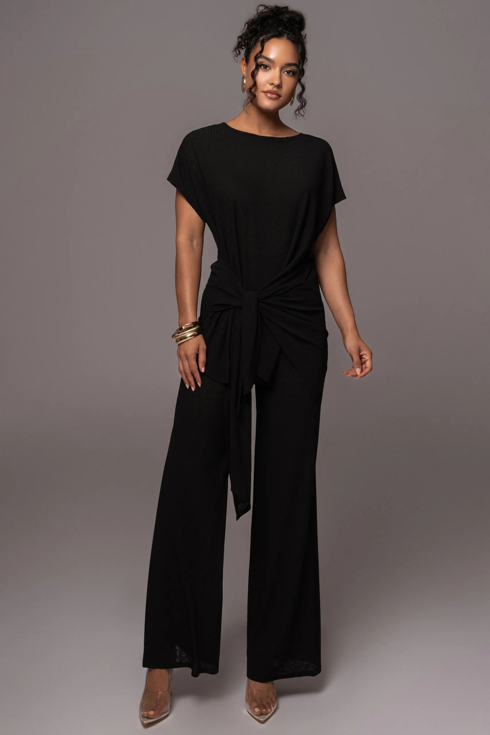 Our Noir Chase The Sun Two-Piece Set is here to stay all summer! This stylish pant set features an oversized sleeve top with front wrap design. The matching pants come with an elastic waistband and classic straight legs for an instant day to night look. Stretchy. Single lined. Sold as set.