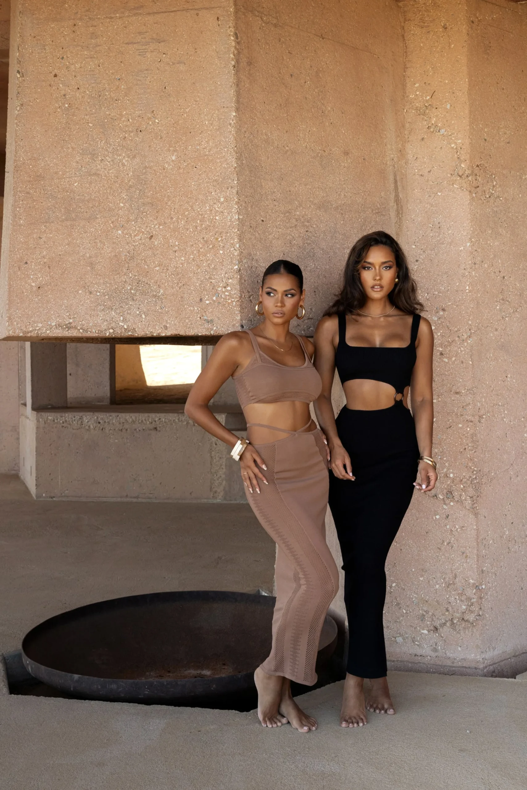 The Black Time After Time Dress is the definition of midsummer glamour! Showcasing a squared neckline with fixed shoulder straps, a trendy cut-out at the waist with tortoiseshell ring, and a center-back slit located at the lower hem. Designed in a ribbed knit fabric for a touch of texture. Stretchy.