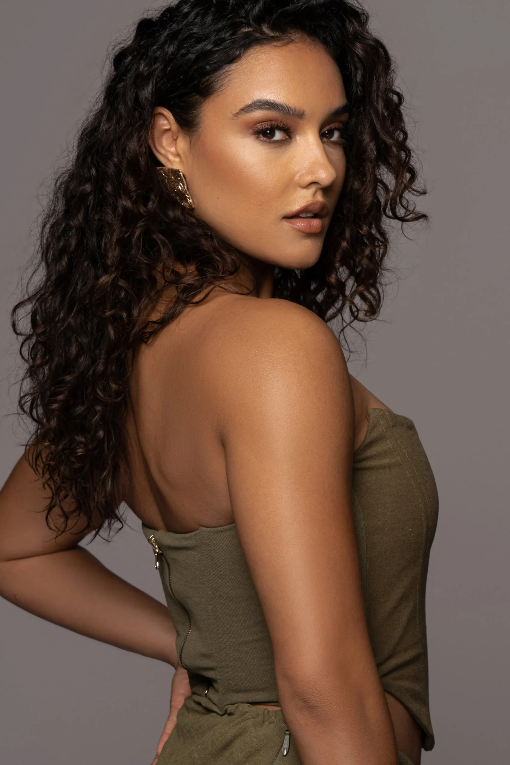 You’ll be the epitome of style when wearing our Olive Fenix Reversible Linen Corset. This eye catching corset showcases a strapless neckline with boning throughout the front and back for added structure and support. Crafted in a Cotton/Linen blend, this corset top is designed with a reversible feature consisting of a flattering front with boning detail and the other with a solid bodice for a smoother look. Complete with an elastic back for flexible fitting. Pair with our NOELIA LINEN SLIT SKIRT for the full look. Gold tone zipper closure. Stretchy.
