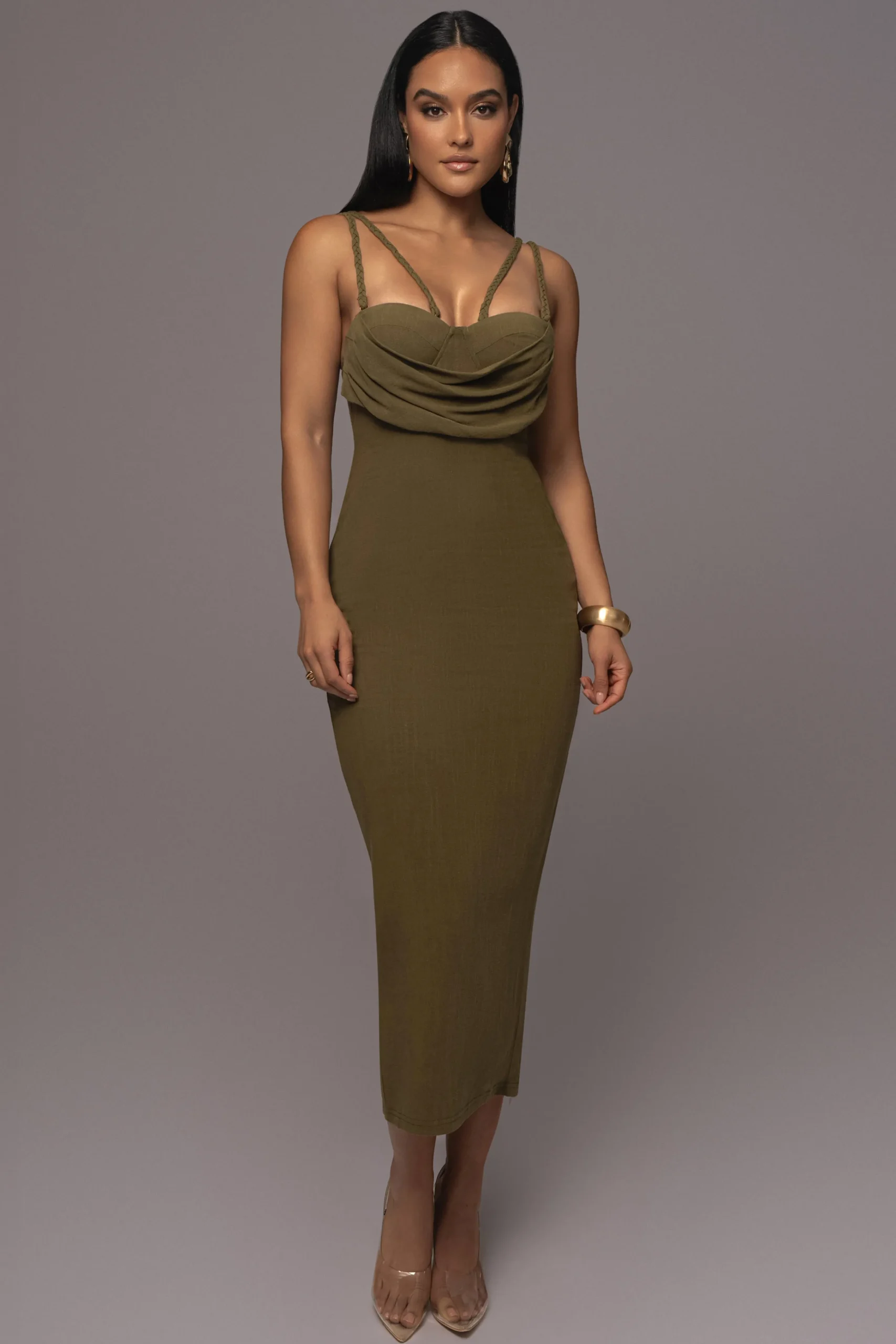 Our Olive Linen Visions Of You Dress is a statement on its own. We’ve taken one of our most loved designs and reimagined it in fresh linen fabric, elevating its allure. This stunning midi dress features a cowl neckline, padded bra cups, and adjustable/removable shoulder straps in a braided trim for extra style. Complete with a silicone gel grip at the top hem for a secure hold and a hidden back zipper for closure. Back slit hem. Double Lined.