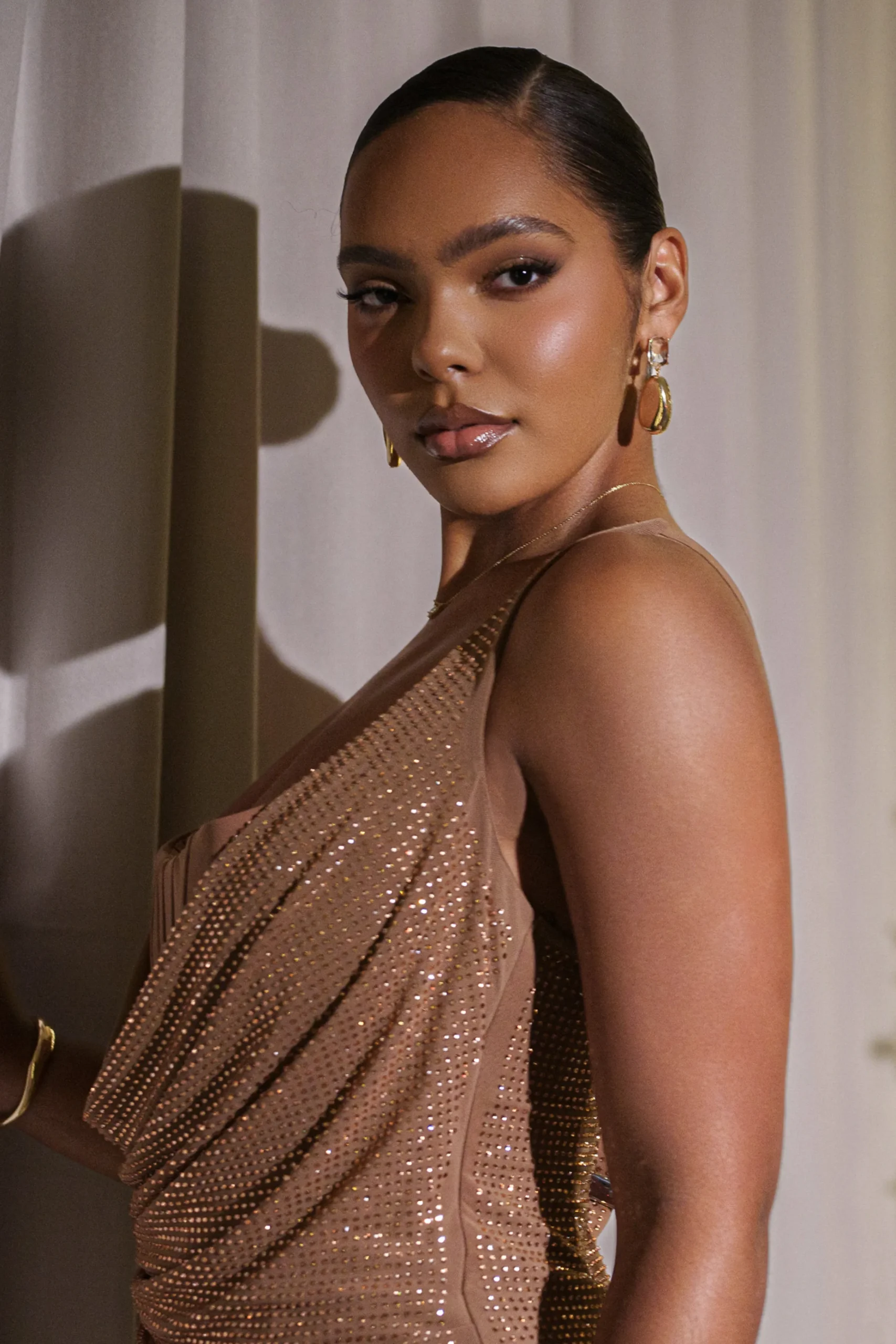 Step into winter elegance with our Pecan Hot Fix Krishna Maxi Dress. This stunning dress features a sleek one-shoulder design and a corset under-layer with structured boning for a cinched silhouette. A cascading front drape and pleated waist add to its refined look. Adorned with hot-fix for a dose of shimmer, this maxi dress is finished with a back zipper closure. Double lined.