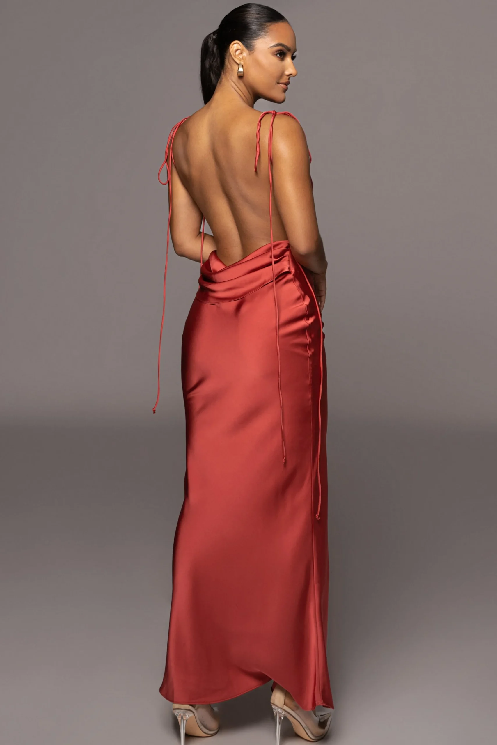 Our new Berry Irresistible Satin Maxi Dress serves timeless glamour in a sleek maxi design crafted of ultra smooth satin fabric. This dazzling satin dress features a chic cowl neckline with adjustable bow-tie shoulder straps and a low draped cowl back showing off some skin. Mermaid hem. No stretch. Single lined.