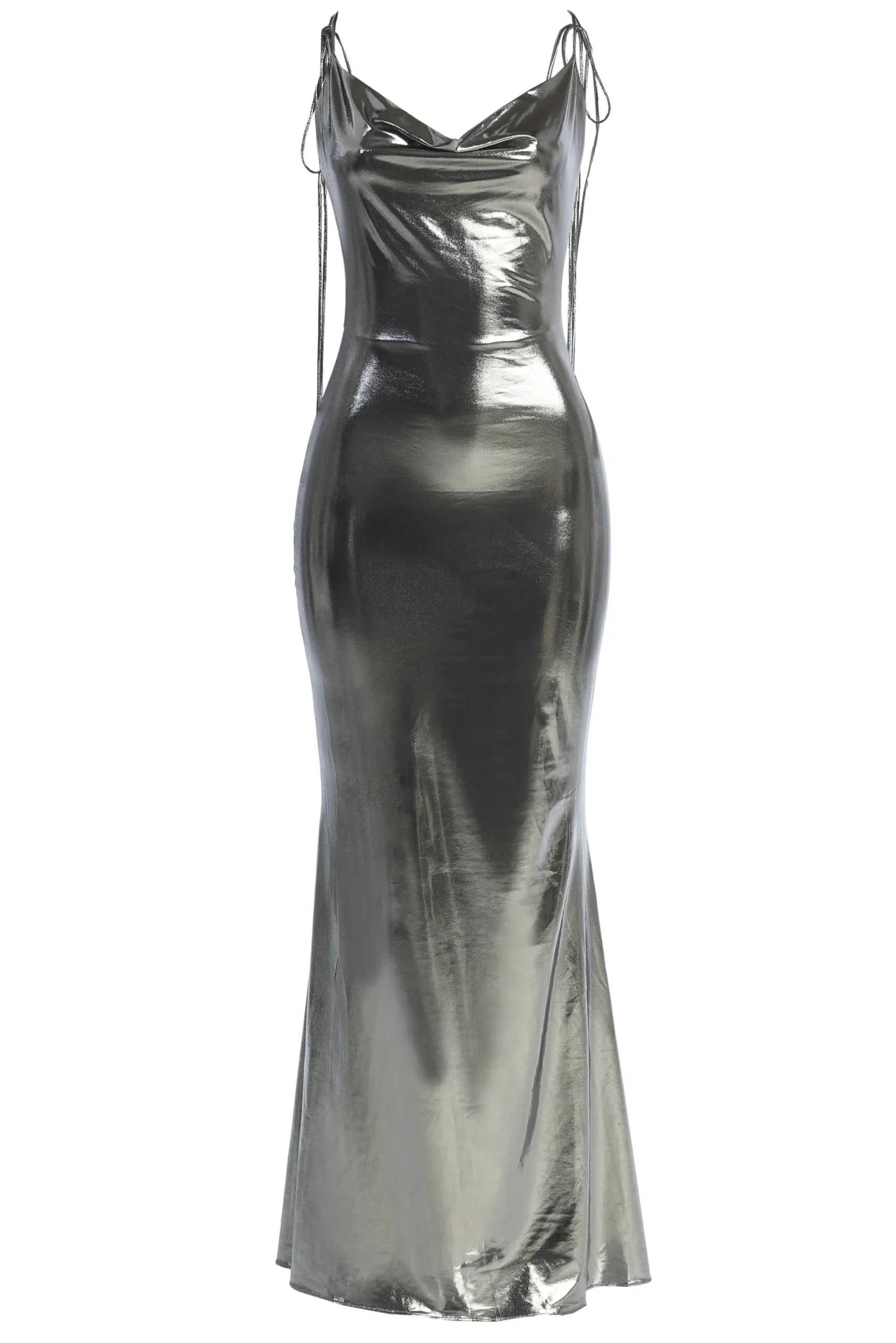 Our new Silver Heart of Gold Maxi Dress serves timeless glamour in a sleek maxi dress design crafted of luxurious metallic fabric. Showcasing a cowl neckline with adjustable bow-tie shoulder straps, a dreamy mermaid hem, and a low-draped cowl back for a touch of allure. Stretchy. Single lined.