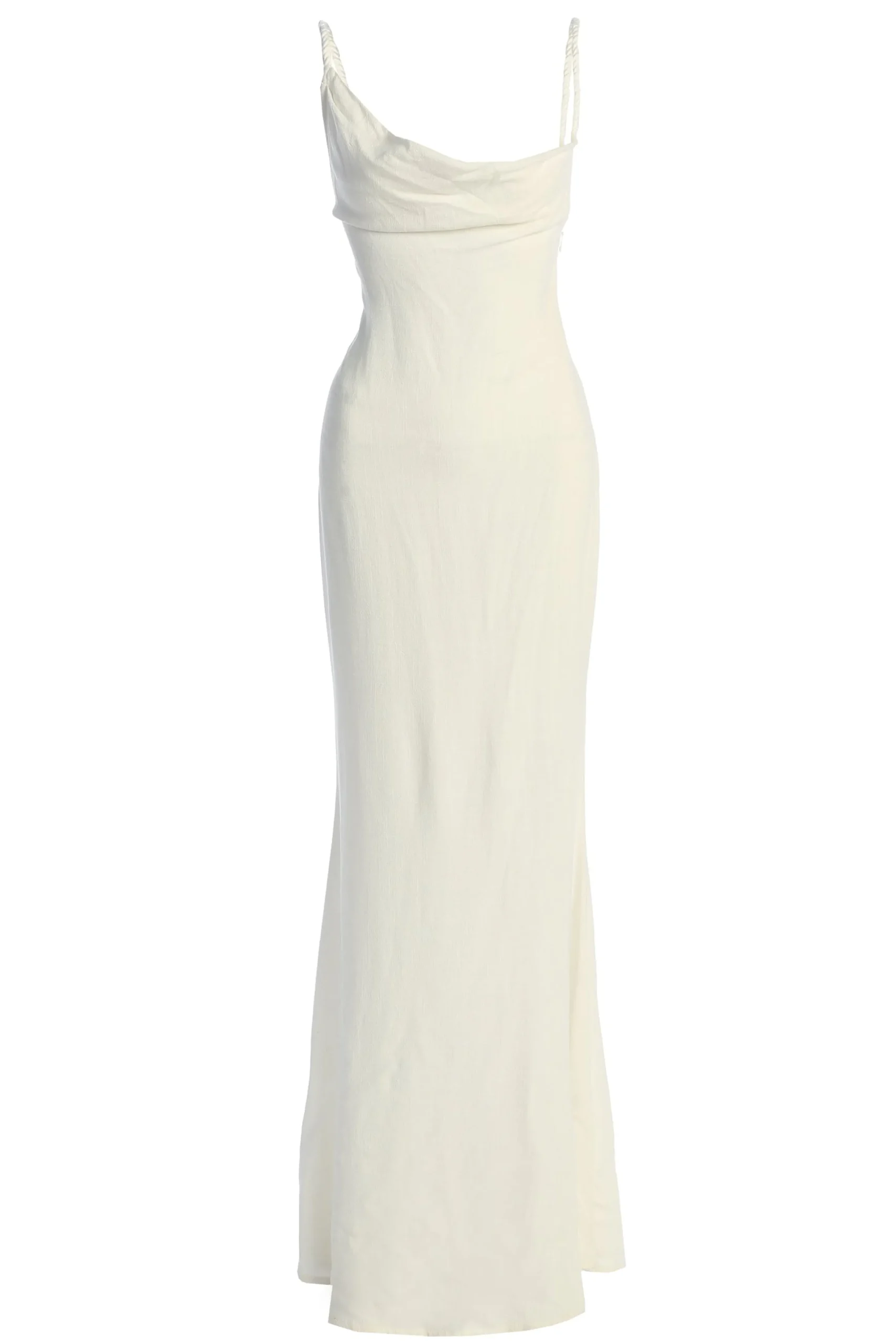 Our new White Adventure Awaits Linen Maxi Dress exceeds all summer wear expectations. Crafted in a premium linen blend, this stunning maxi dress features a relaxed silhouette with a cowl neckline and is adorned with adjustable rope straps that lead towards the back, providing a flexible fit. Minimal stretch. Double lined.