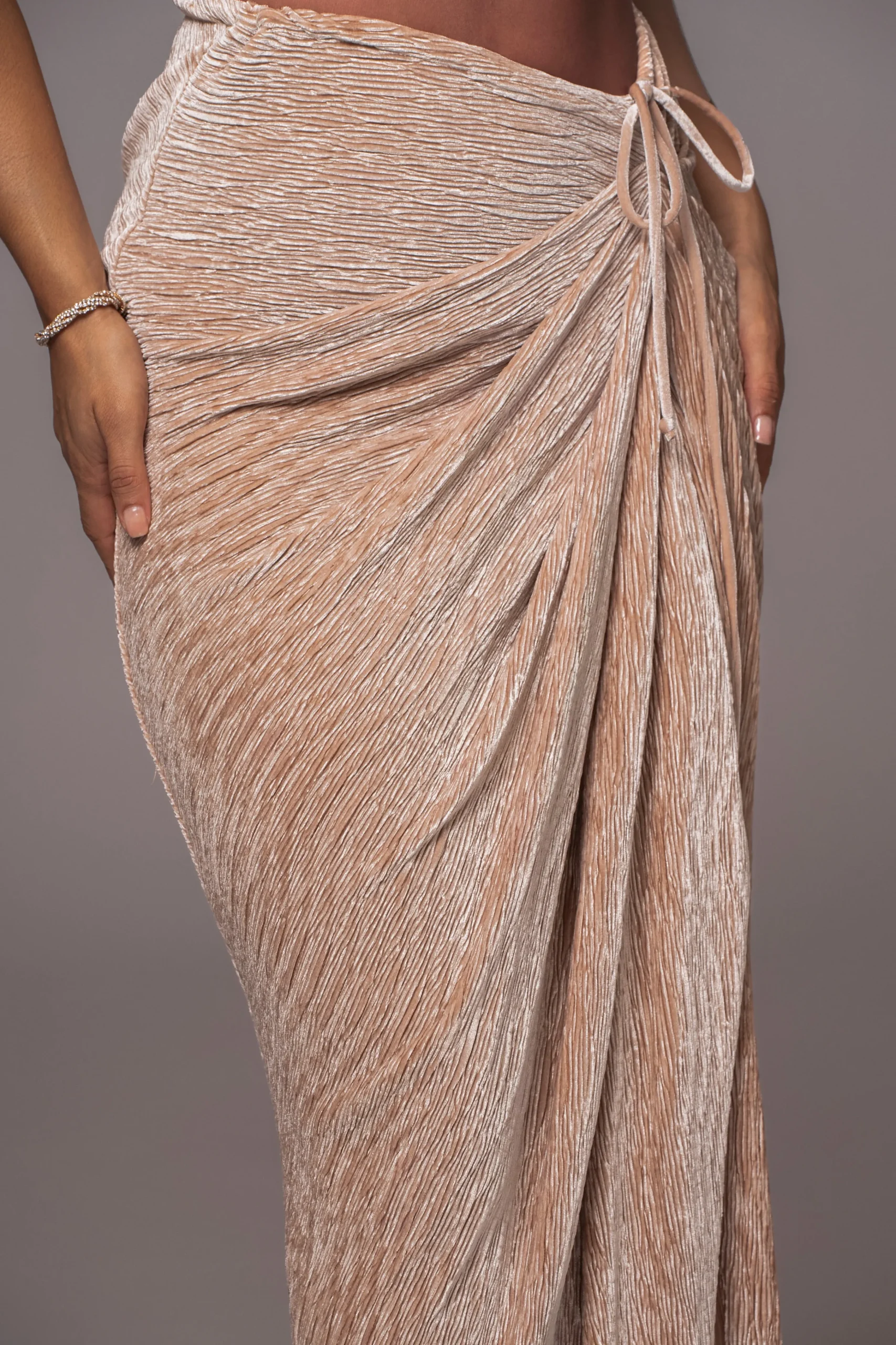 Our Beige Chosen One Velvet Skirt Set makes styling your next night out effortless! Crinkled velvet fabric shapes this romantic two-piece set featuring a sleeveless crop top with a turtleneck and an under-bust cut with structured wiring. The matching skirt is cut with a high waist and details a beautiful drape and side slit. Single-lined with stretch. Sold as set.