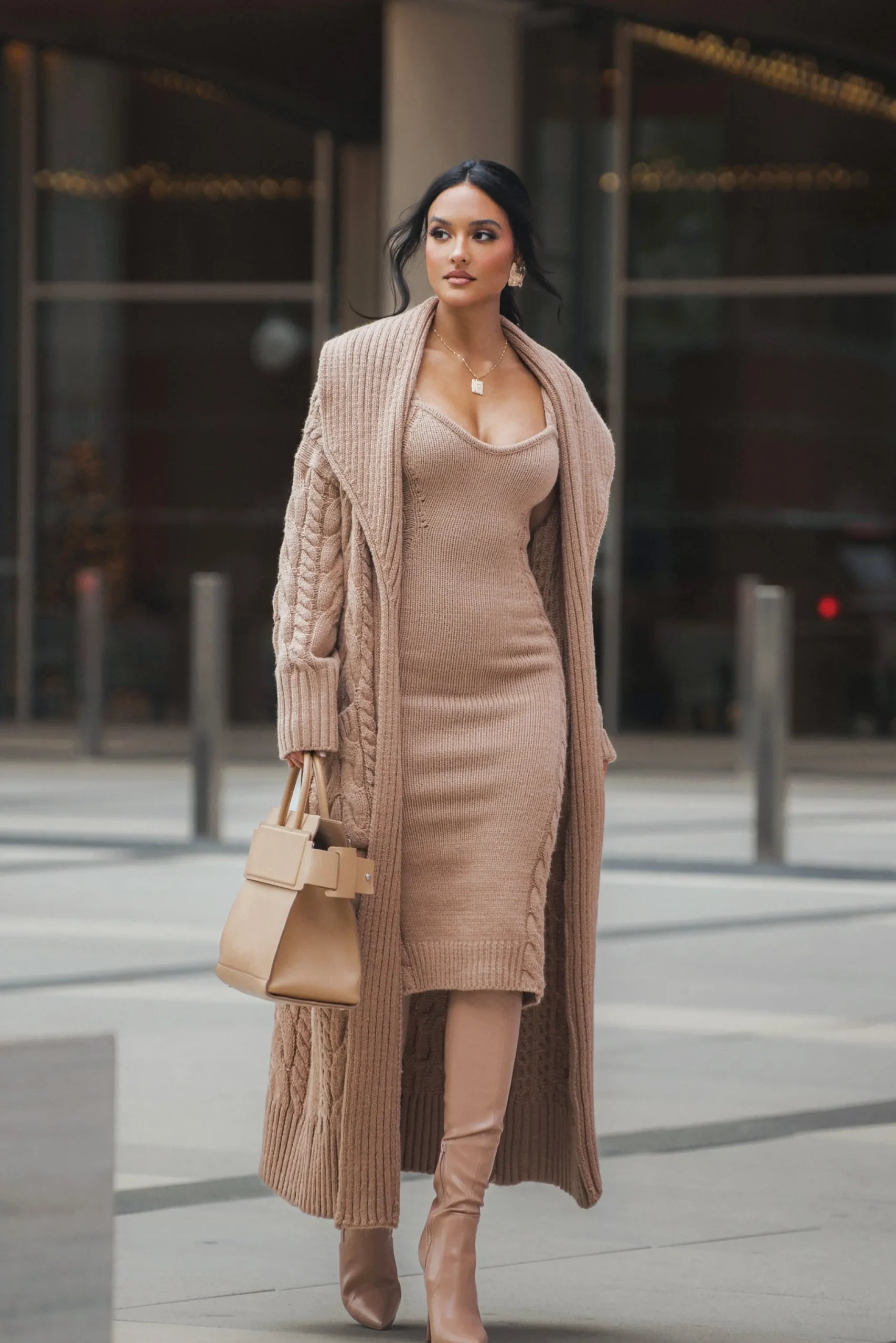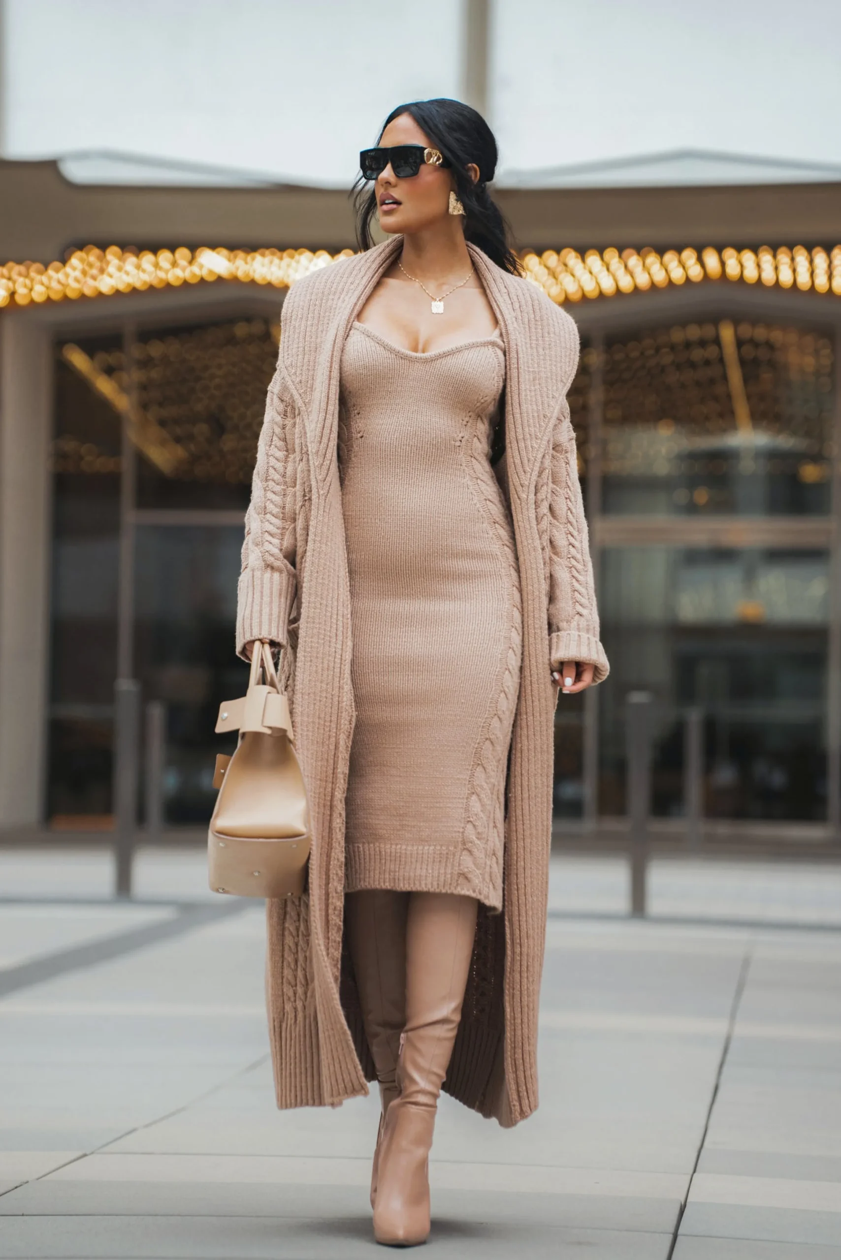 Slip into cozy luxury with our new Beige Daria Sweater Knit Dress. Showcasing a gorgeous sweetheart neckline, this knitted midi dress features a solid front with cable knit texture at the sides and fitted shoulder straps. Pair with our Upstate Cable Knit Cardigan for the full look. Back slit hem. Stretchy.