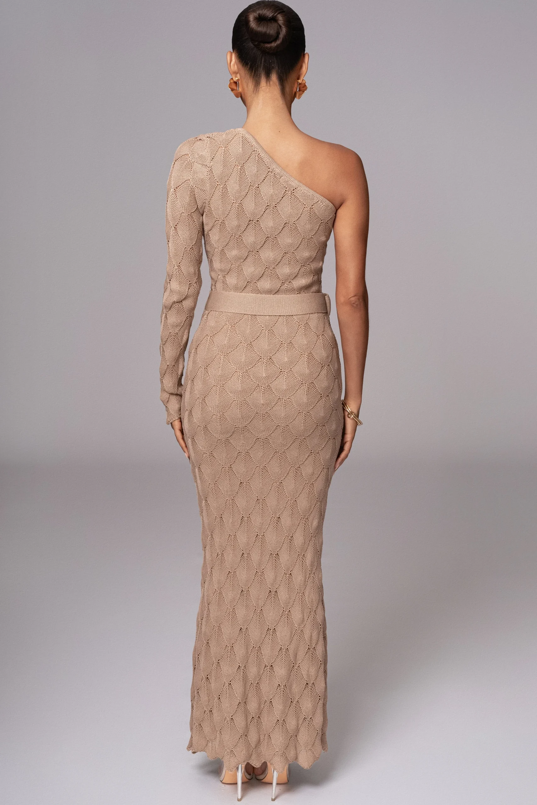 Indulge in luxury with our Beige La Costa One Shoulder Dress. This stunning maxi dress features a one-shoulder neckline with a long sleeve arm and a matching belt with marbled rectangle buckle. Crafted from a diamond shape knitting way with nude underlining, this dress is perfect for any occasion. Stretchy.