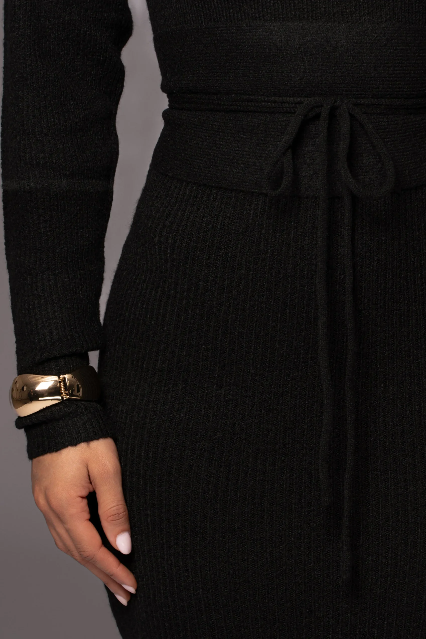 Rediscover the charm of our most loved Black Aubrey Turtleneck Sweater Dress. Stylishly versatile, this midi dress offers luxurious comfort in a soft material designed with a turtleneck, long sleeves, and exquisite ribbed detailing. Complete with a fabric waist belt for an extra cinched look, ensuring both style and coziness in every wear. Single lined. Stretchy.
