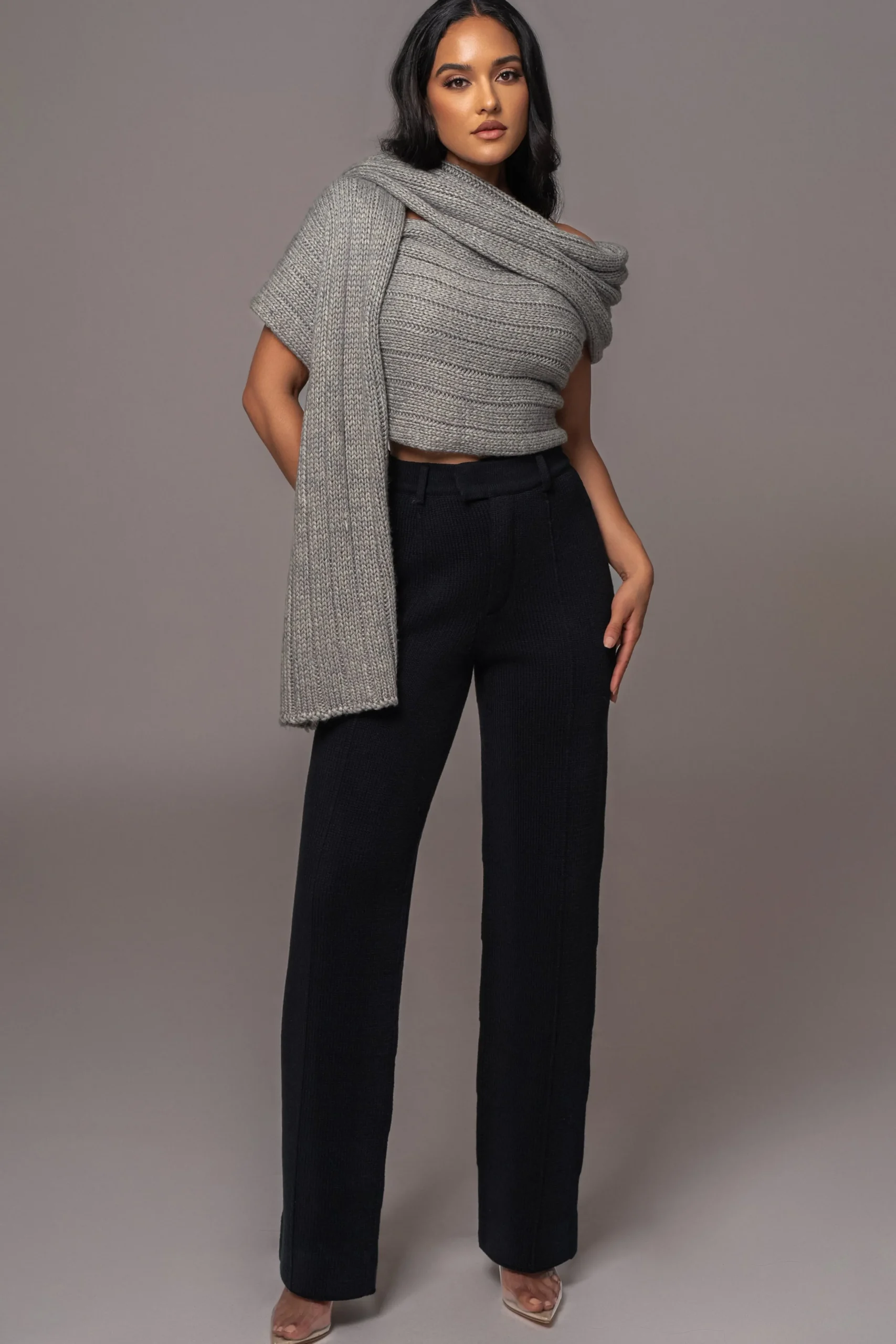 Elevate your Fall style with the Black Back In Business Knit Trousers. These sophisticated trousers pants feature a high waist with functional side pockets, faux back pockets, and a concealed zipper with a double hook and bar closure. The perfect bottoms to effortlessly transition from a work to the weekend look. Pair with our Soft Life Cable Knit Sweater Wrap for the full look. No stretch.