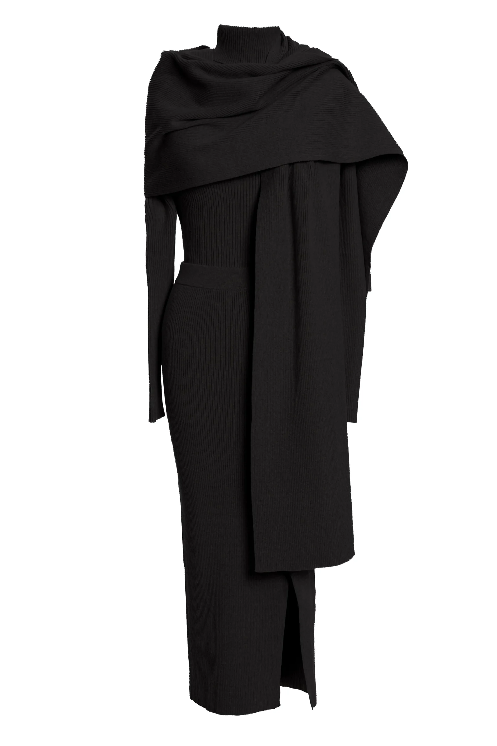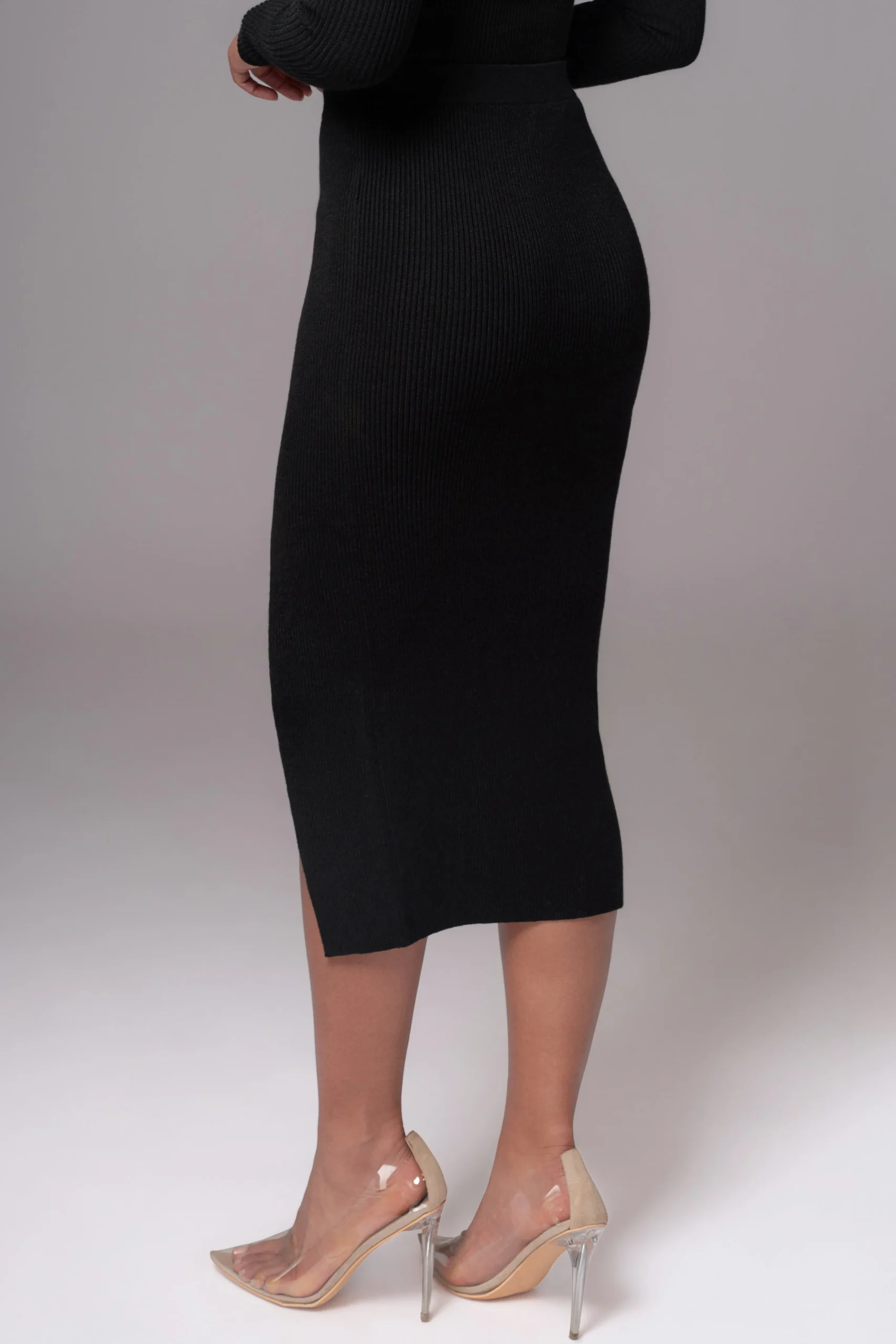 Our Black Cardinal Essential Knit Skirt combines warmth and simplicity. Designed with a high waist and a slit, this midi skirt is crafted from a soft micro ribbed material for a comfortable and flattering fit. Pair with our Black Arlett Turtleneck Bodysuit for the full look. Elastic waistband. Single lined. Stretchy.