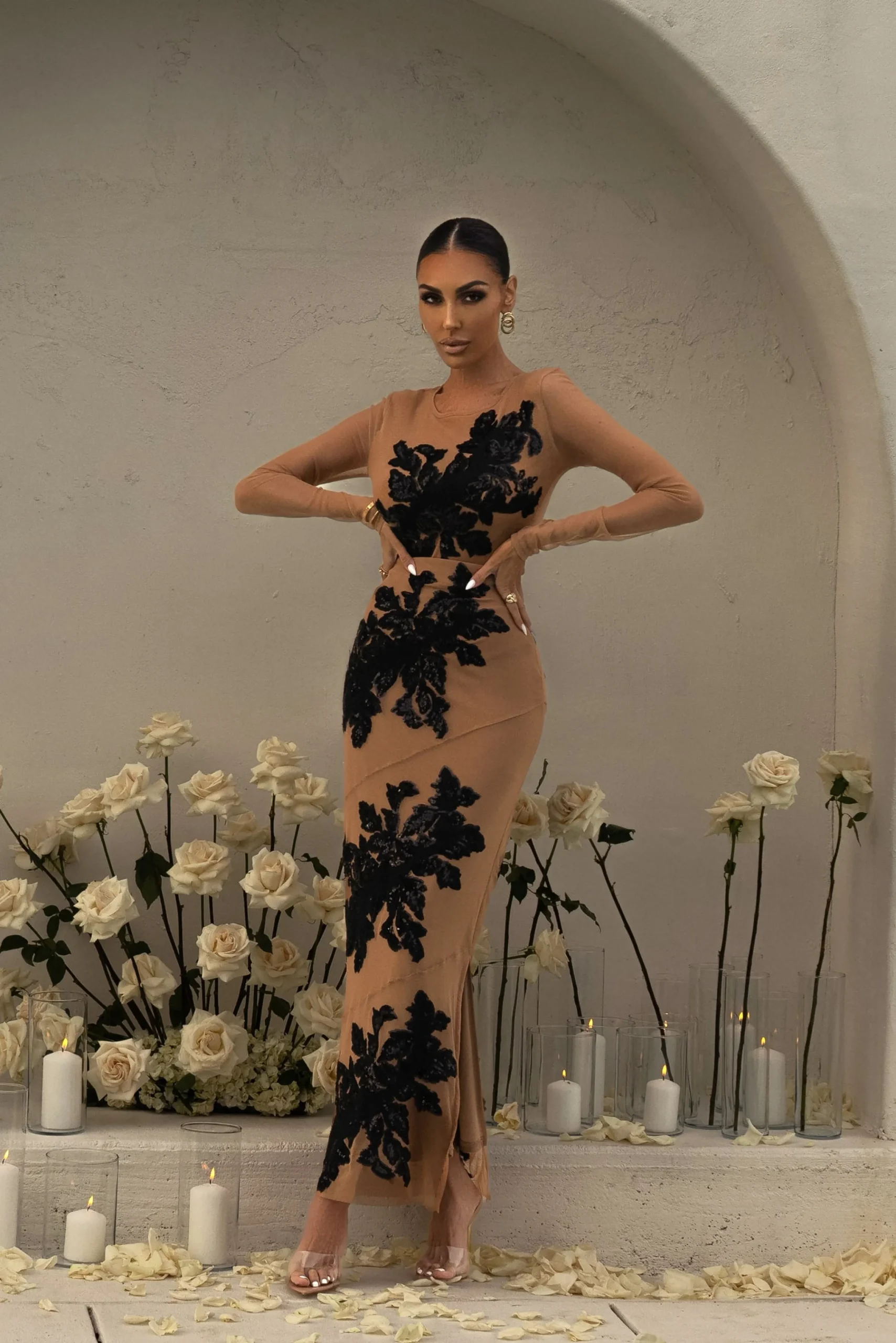 Embellishments are back in our Noir Edena Embroidered Midi Skirt. Our latest midi skirt is embroidered with overlays of lovely floral embellishments throughout. A side zipper closure and low slit on one side finish the look. Pair with our Charmed Embroidered Mesh Bodysuit for the full look. Double lined with stretch. Not sold as set.