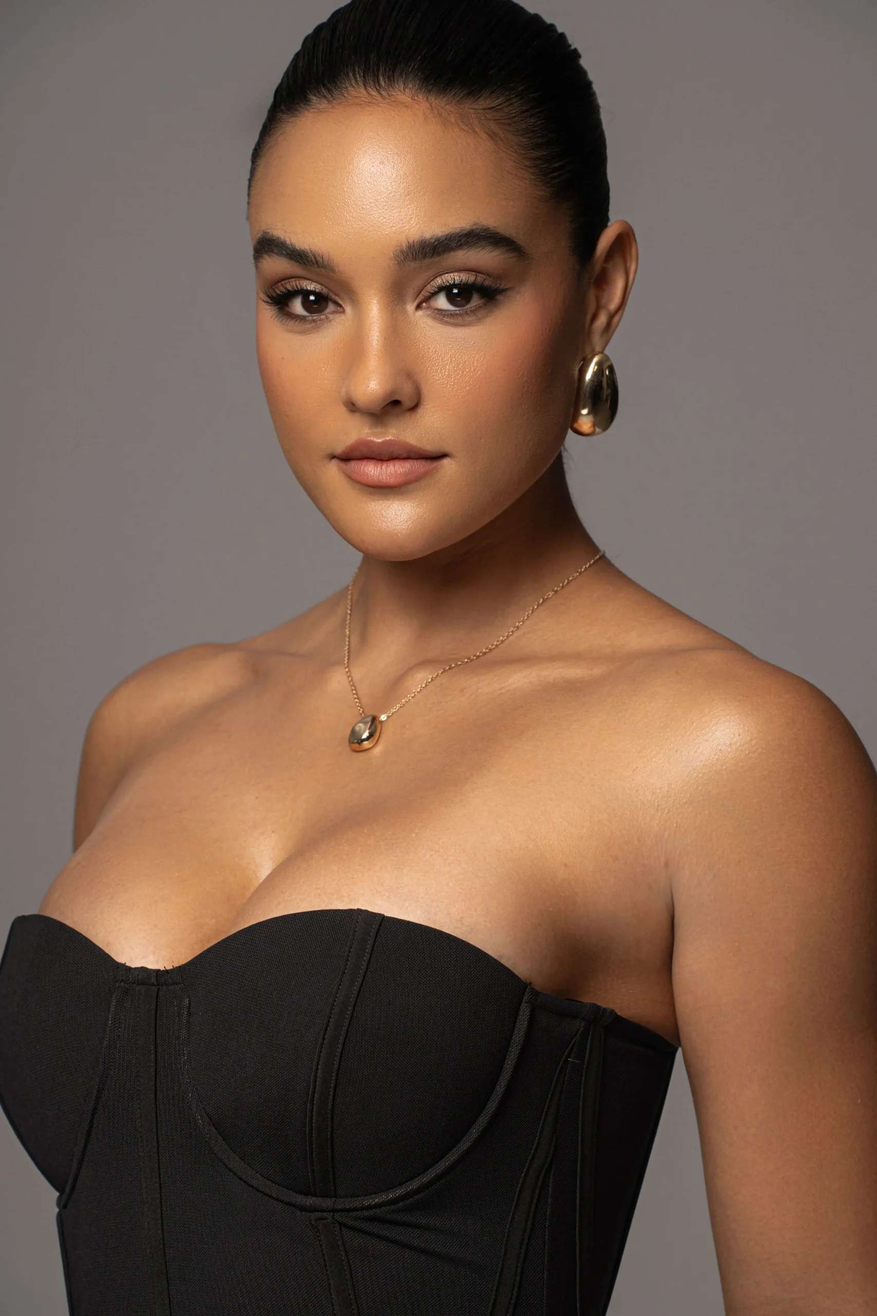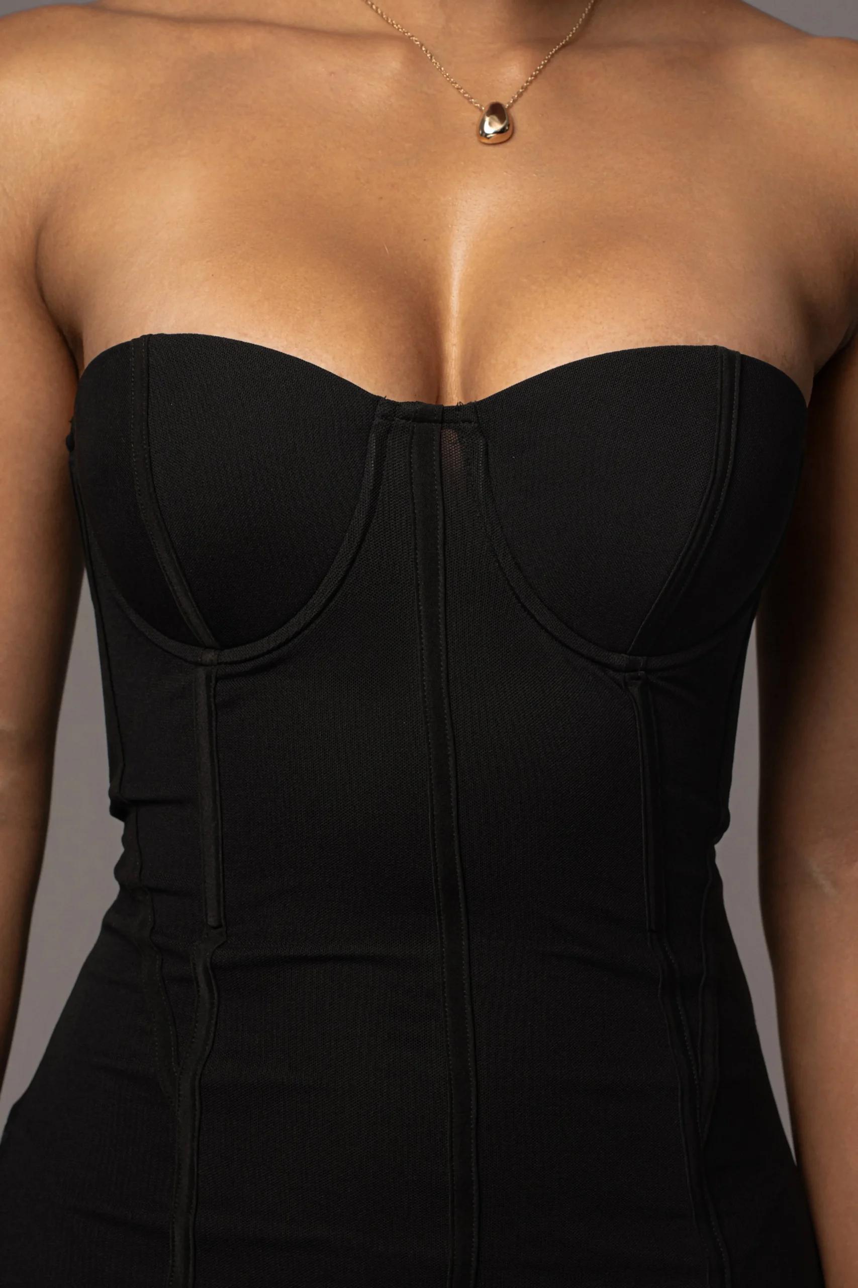 Indulge in luxury with our Black Timeless Escape Mesh Midi Dress. Crafted from premium mesh fabric, this fitted midi dress features chic style lines throughout with an elegant gold-tone back zipper closure and back slit hem. Complete with wired bra cups, gold-tone metal chain straps, and front/back boning for support and structure. Double-lined. Stretchy. Gold tone straps are included and removable.