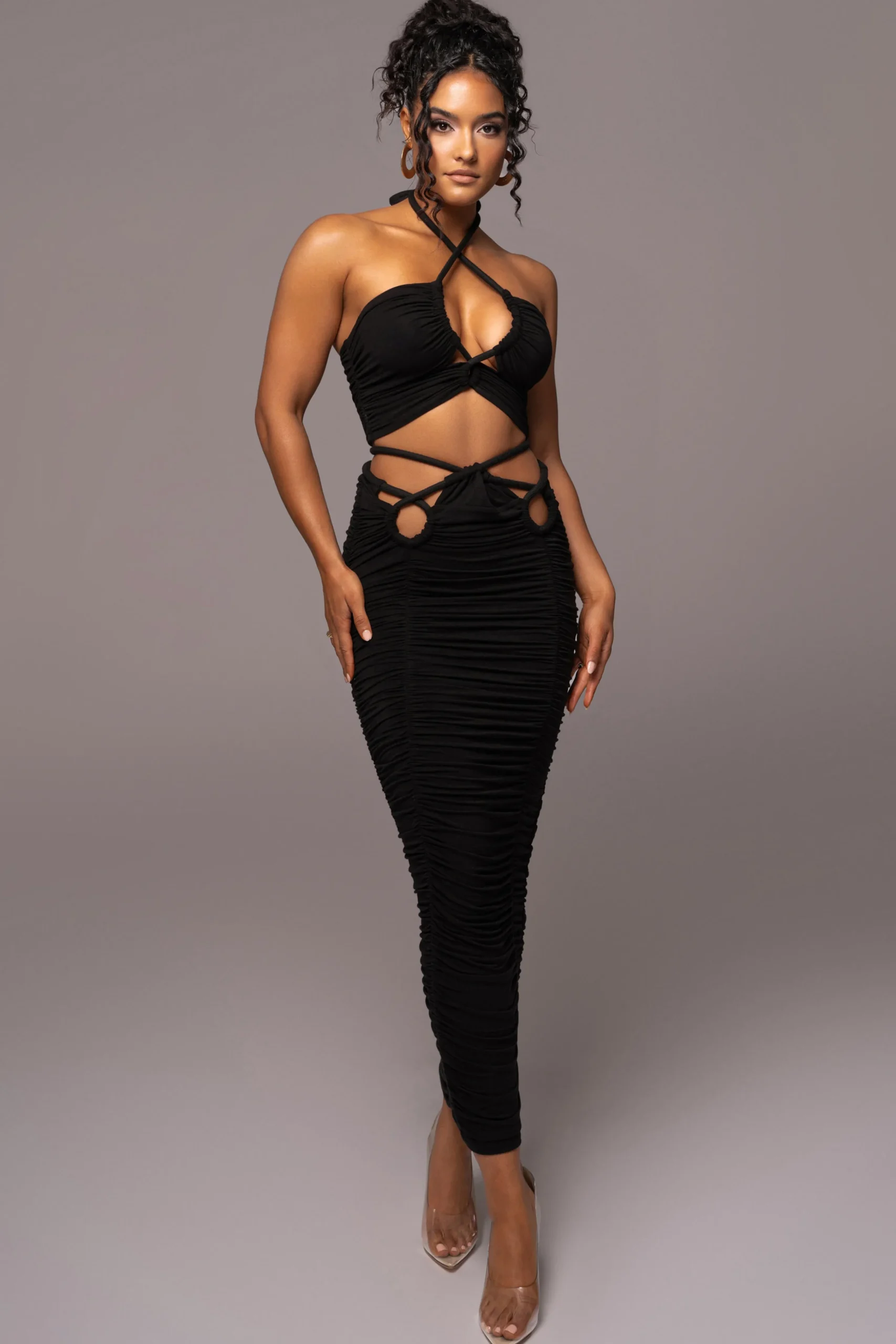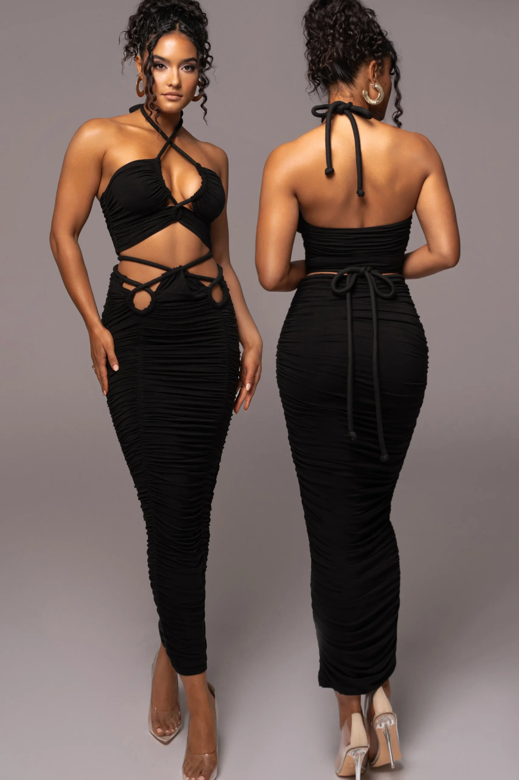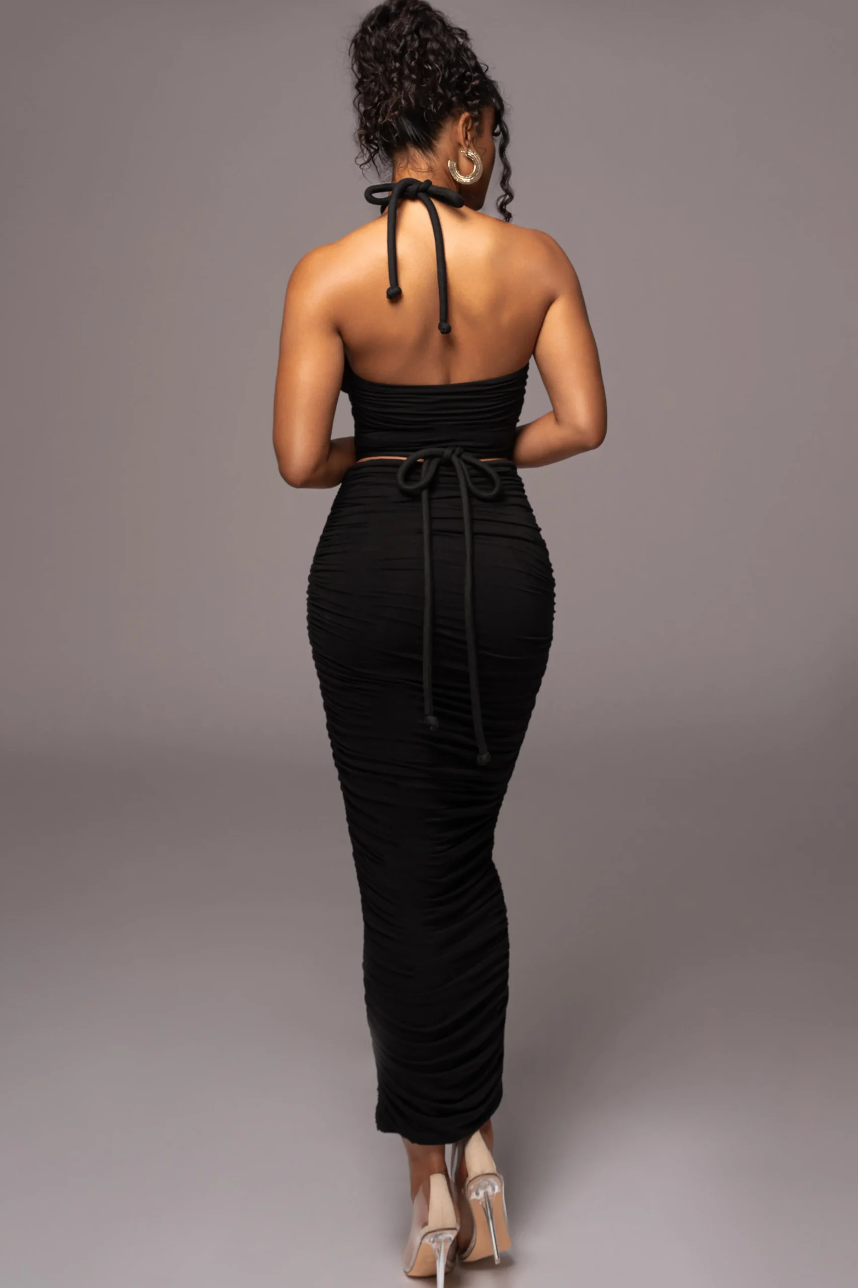 The new Black Go The Distance Skirt Set is perfect for Summer’s most formal occasions. This dreamy skirt set features a halter top with a cutout design adorned with stylish rope-inspired tie closures. The matching maxi skirt comes with stylish rope-inspired ties with adjustable fitting for the perfect fit! Ruching throughout adds a flattering touch of texture. Sold as set. Double lined.