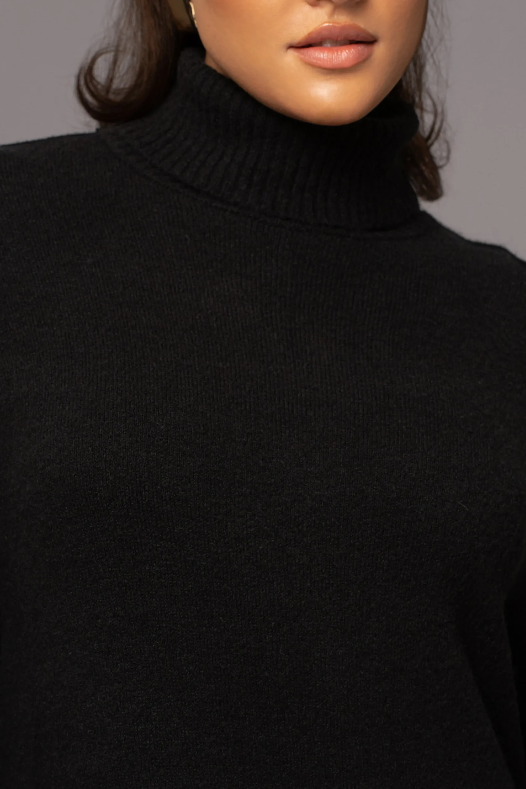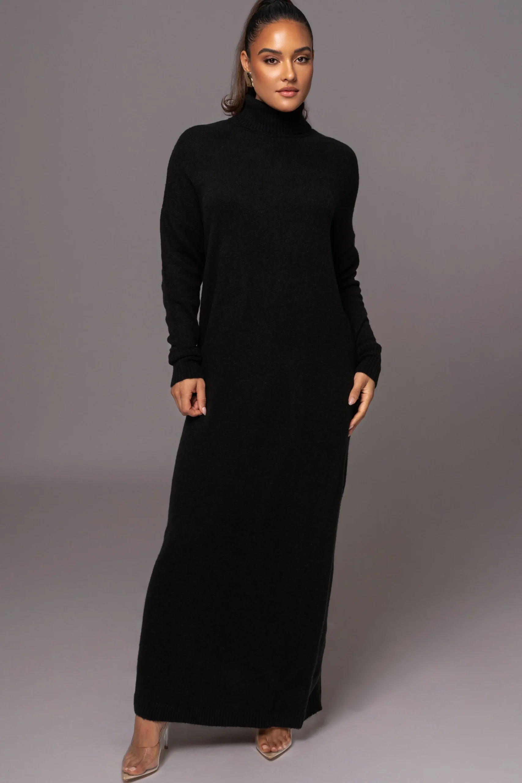 Warm up your wardrobe with modern elegance in our Black Hartley Knit Maxi Dress. This rib-knit masterpiece boasts a turtleneck, drop shoulders with long sleeves, and an oversized silhouette for versatile styling. Ribbed trims at the hems and rolled up sleeves add a flattering touch, making it a timeless addition to your collection. Single lined. Stretchy.