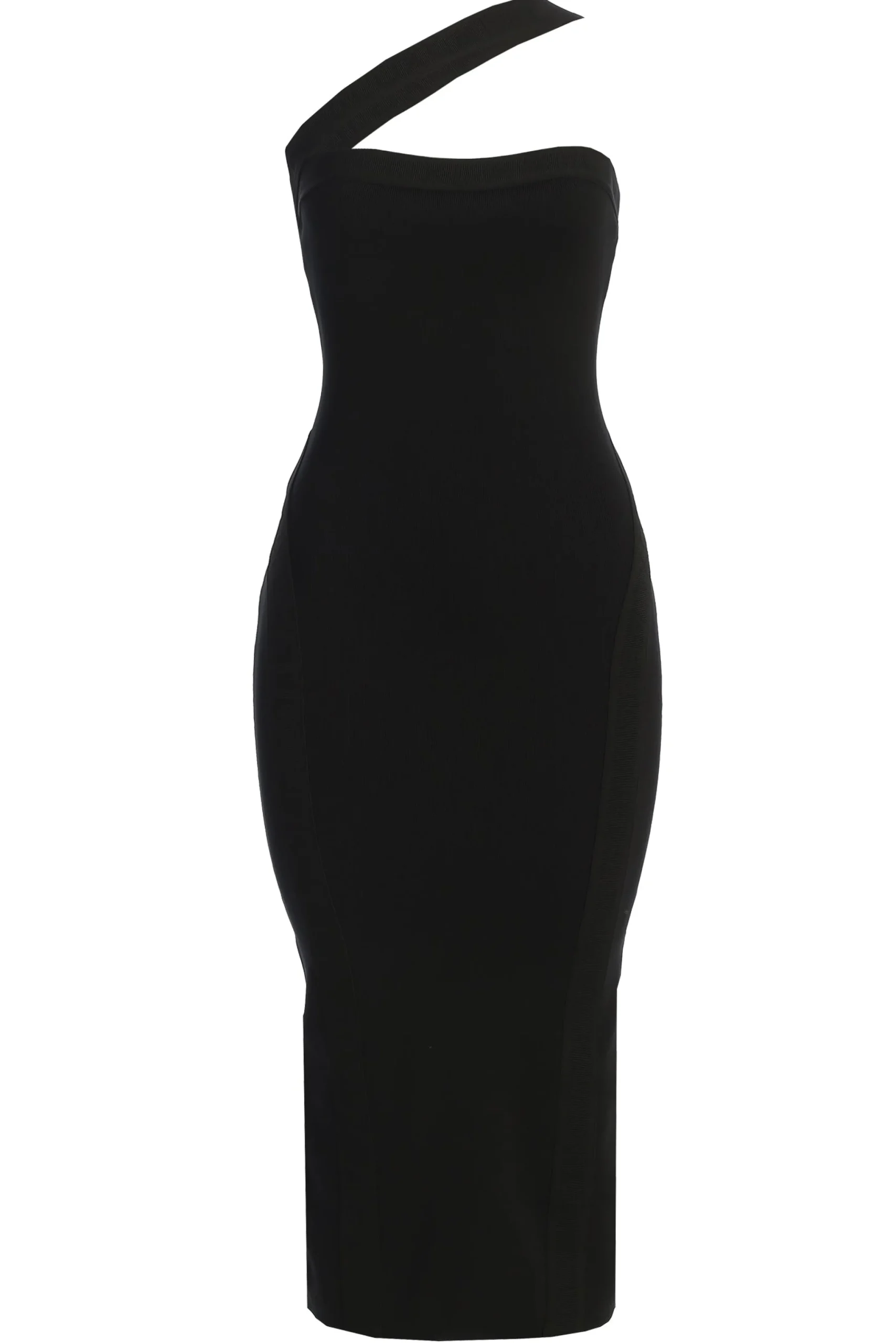 Step into a city state of mind with our Black Ivone Asymmetrical Midi Dress. Made with high-quality, bandage fabric, this midi dress features a unique asymmetrical design and is embossed with our signature logo throughout for a touch of luxury. Perfect for any occasion, make a statement and turn heads in this stunning bandage dress. Single lined. Stretchy.