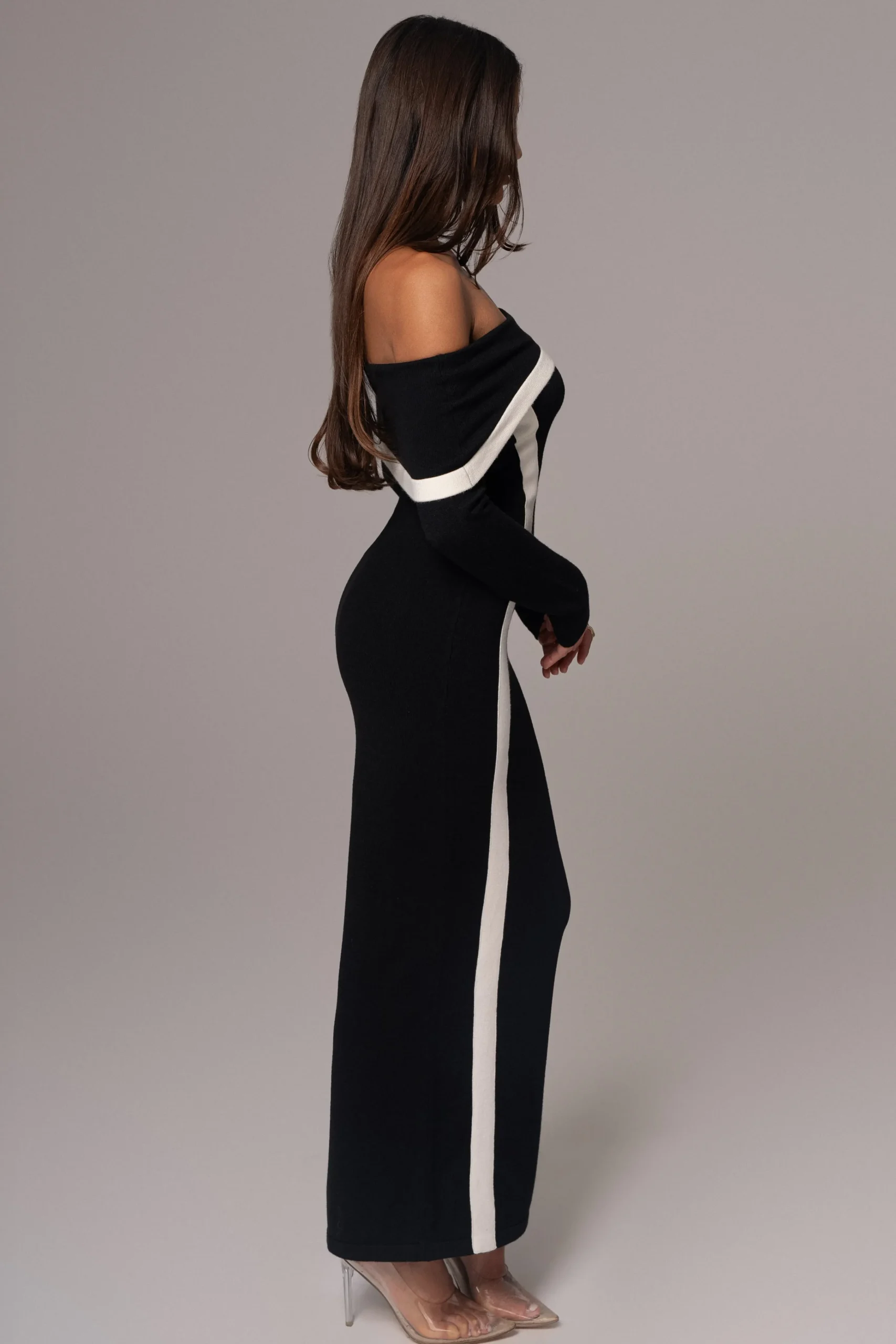 Be a vision of elegance and style in our Black Janet Off Shoulder Maxi Dress. Featuring a sophisticated contrast design with an off the shoulder neckline and fold-over edge. Crafted from a single lined knit fabric offering both comfort and style. Stretchy.