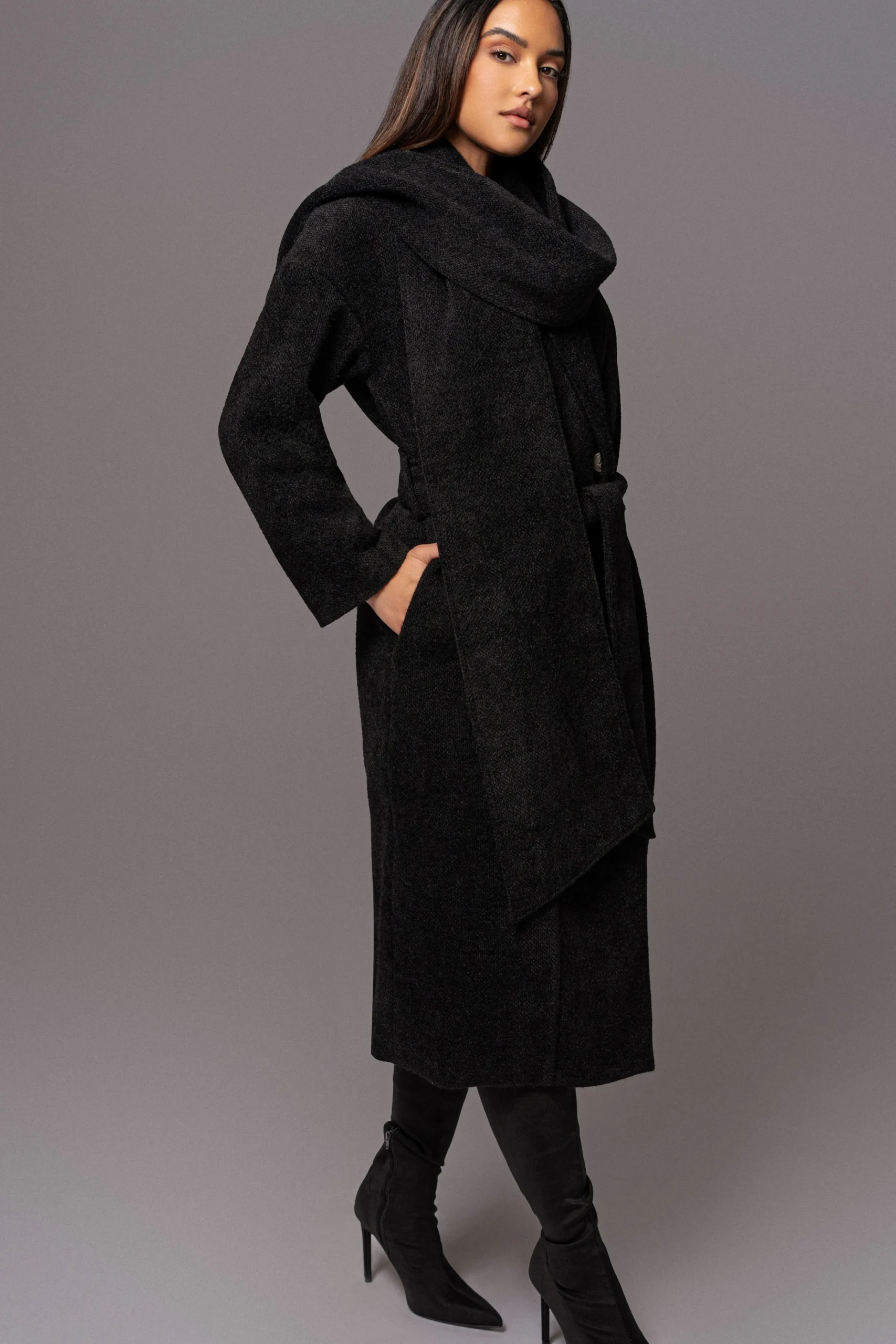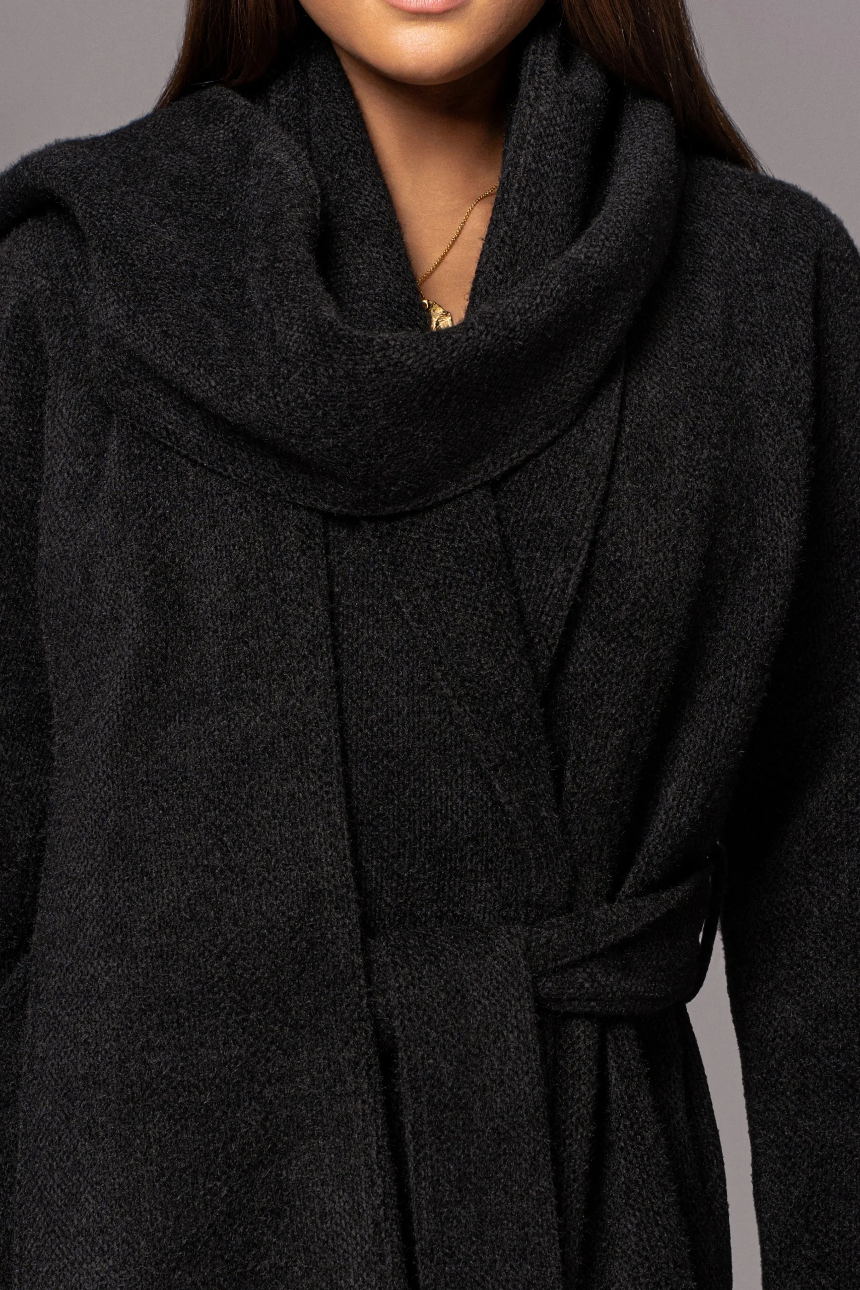 Make a statement while staying warm with our Black Jonah Coat! Crafted from soft fabric, this winter essential ensures coziness with long sleeves and a removable scarf that wraps effortlessly around the neck achieving innovative style. A matching self tie belt holds it all together for a sophisticated finish. Pair with our Ivy Sweater Knit Pant Set for the full look. Back slit hem. Double lined. No stretch.