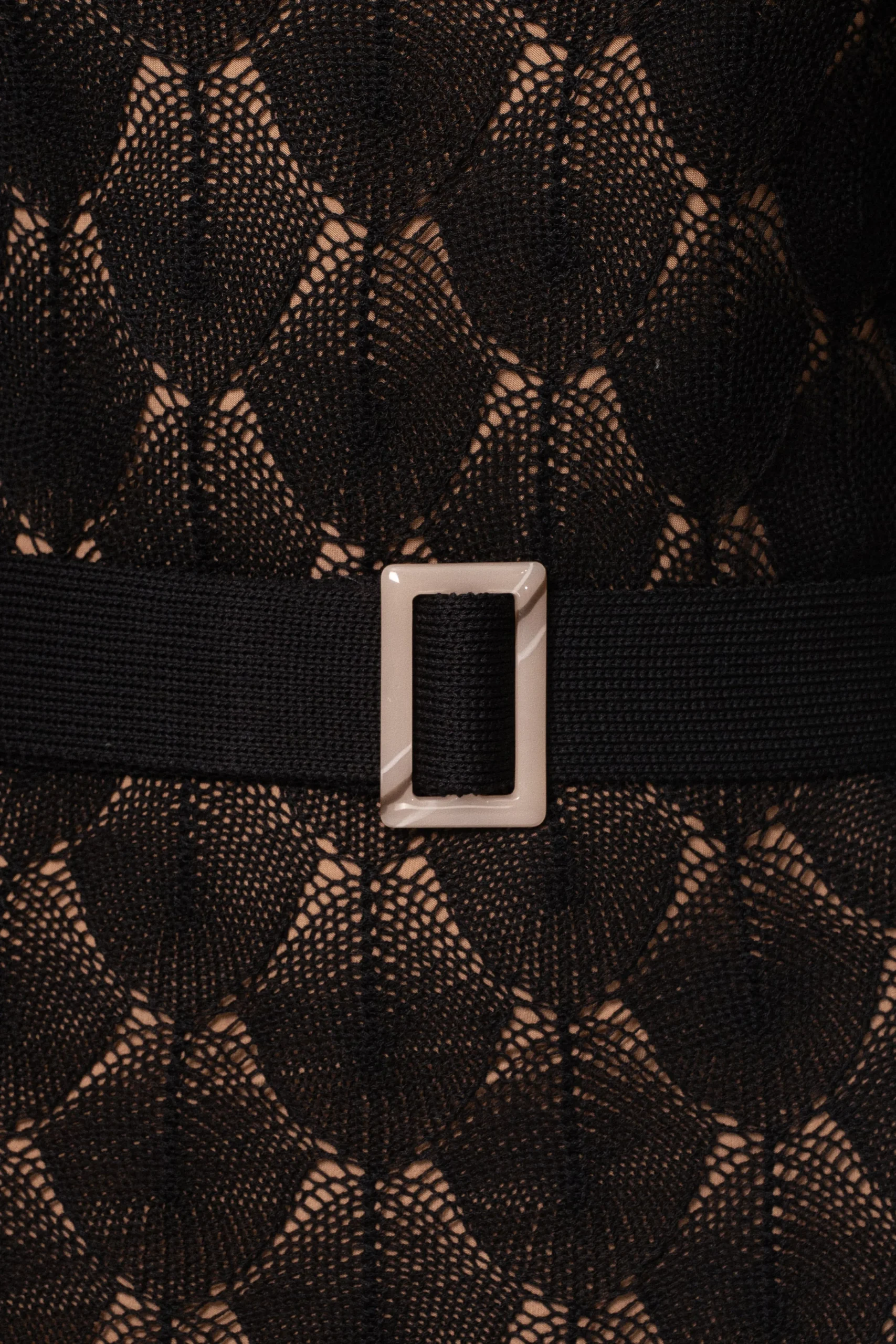 Indulge in luxury with our Black La Costa One Shoulder Dress. This stunning maxi dress features a one-shoulder neckline with a long sleeve arm and a matching belt with marbled rectangle buckle. Crafted from a diamond shape knitting way with nude underlining, this dress is perfect for any occasion. Stretchy.