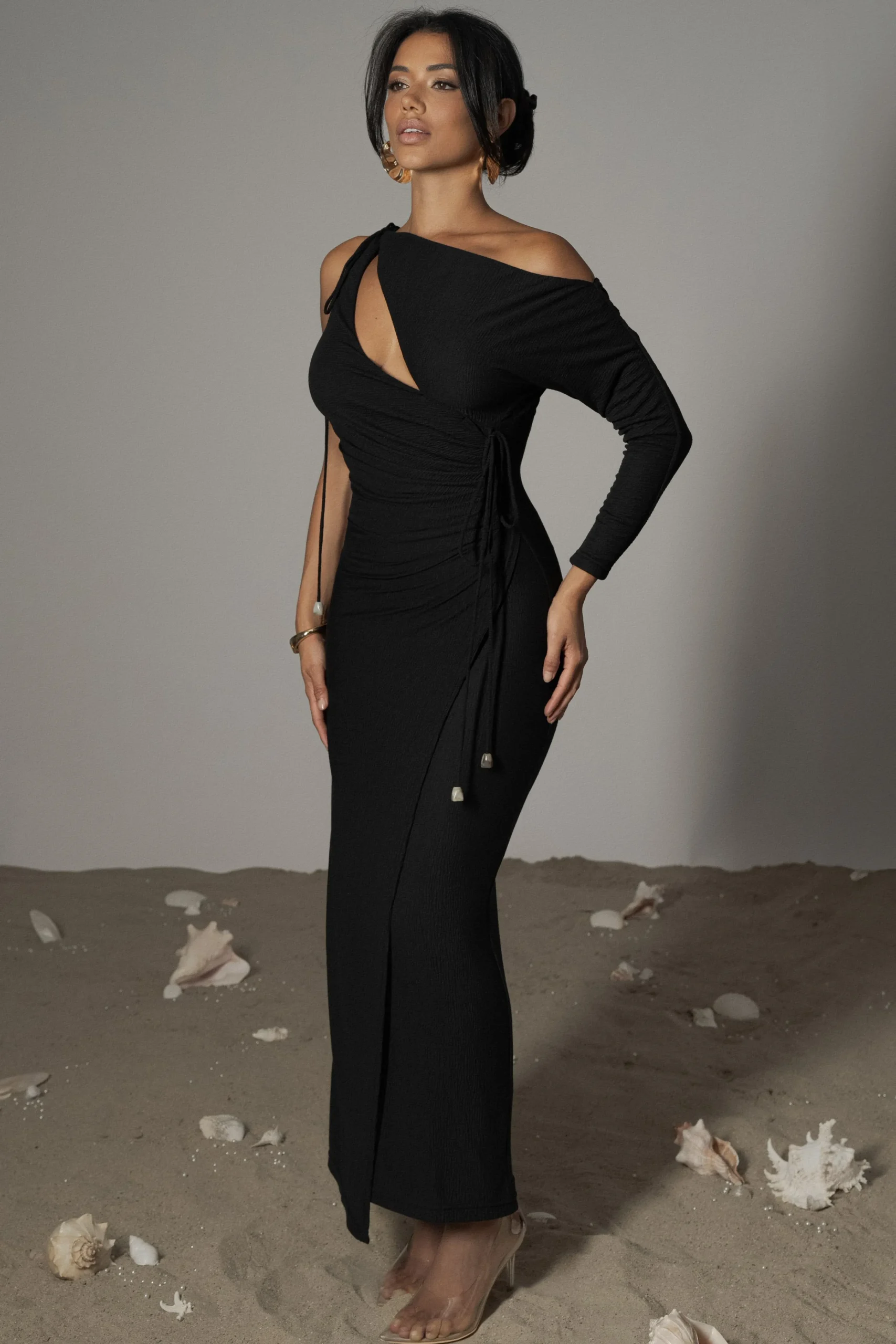 Indulge in the luxurious sophistication of our Black Odelia Crinkled Maxi Dress. This one-shoulder maxi dress features a chest cutout with stylish shirring and drawstring ties with marble accents at the shoulder and side waist. Double lined. Stretchy.
