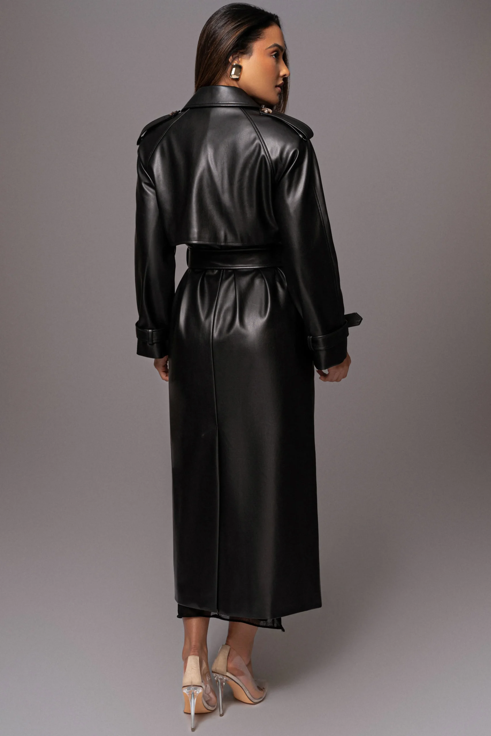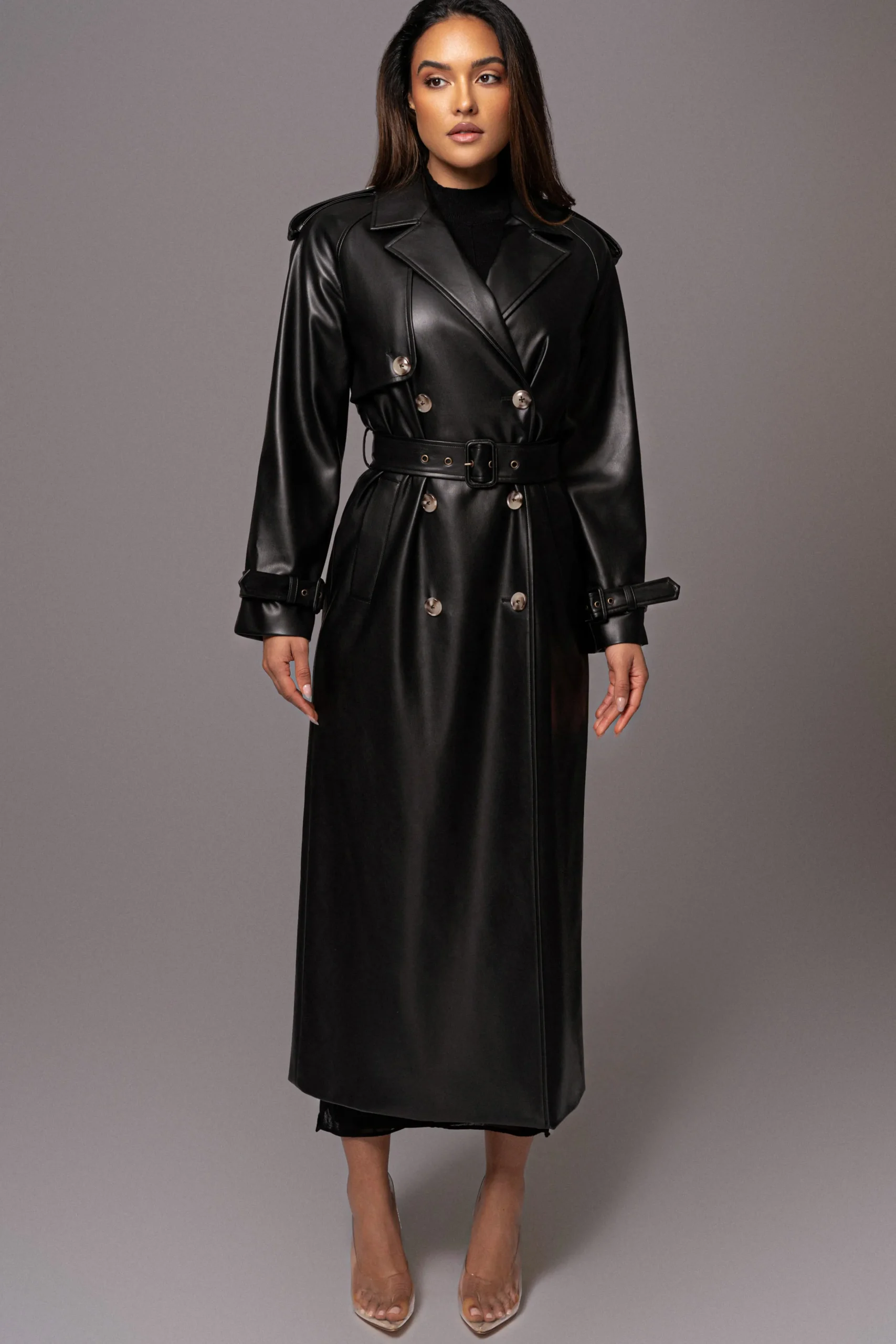 Treat yourself to a timeless classic with our Black Odin Faux Leather Coat. Crafted from quality faux leather, this longline trench coat features double breasted closures with a tie belt, creating a sophisticated and sleek silhouette that promises to elevate any ensemble. Adorned with button detail shoulder tabs, button cuffs, and shoulder padding. Double lined. Minimal stretch.