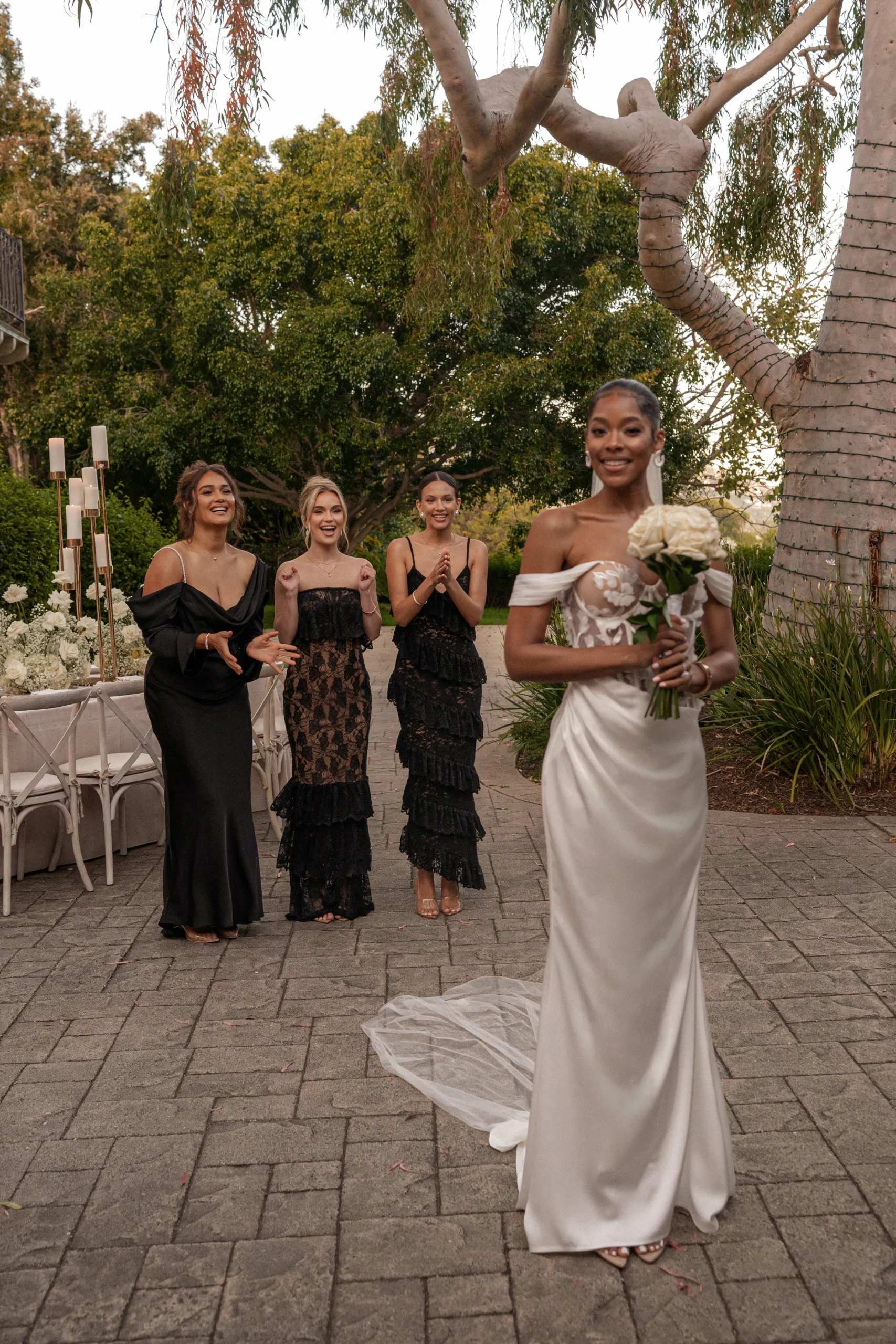 Designed for the JLUXLABEL Bridal Collection. Embrace the romance in every stitch of the Black One And Only Satin Dress, carefully crafted from luxurious satin fabric, radiating shimmer and shine. This breathtaking maxi dress features effortless drape across the bodice creating a flattering silhouette that flows into a mermaid hem. Adjustable rhinestone straps adorn one shoulder for extra elegance. Hidden side zipper. Double lined. No Stretch.