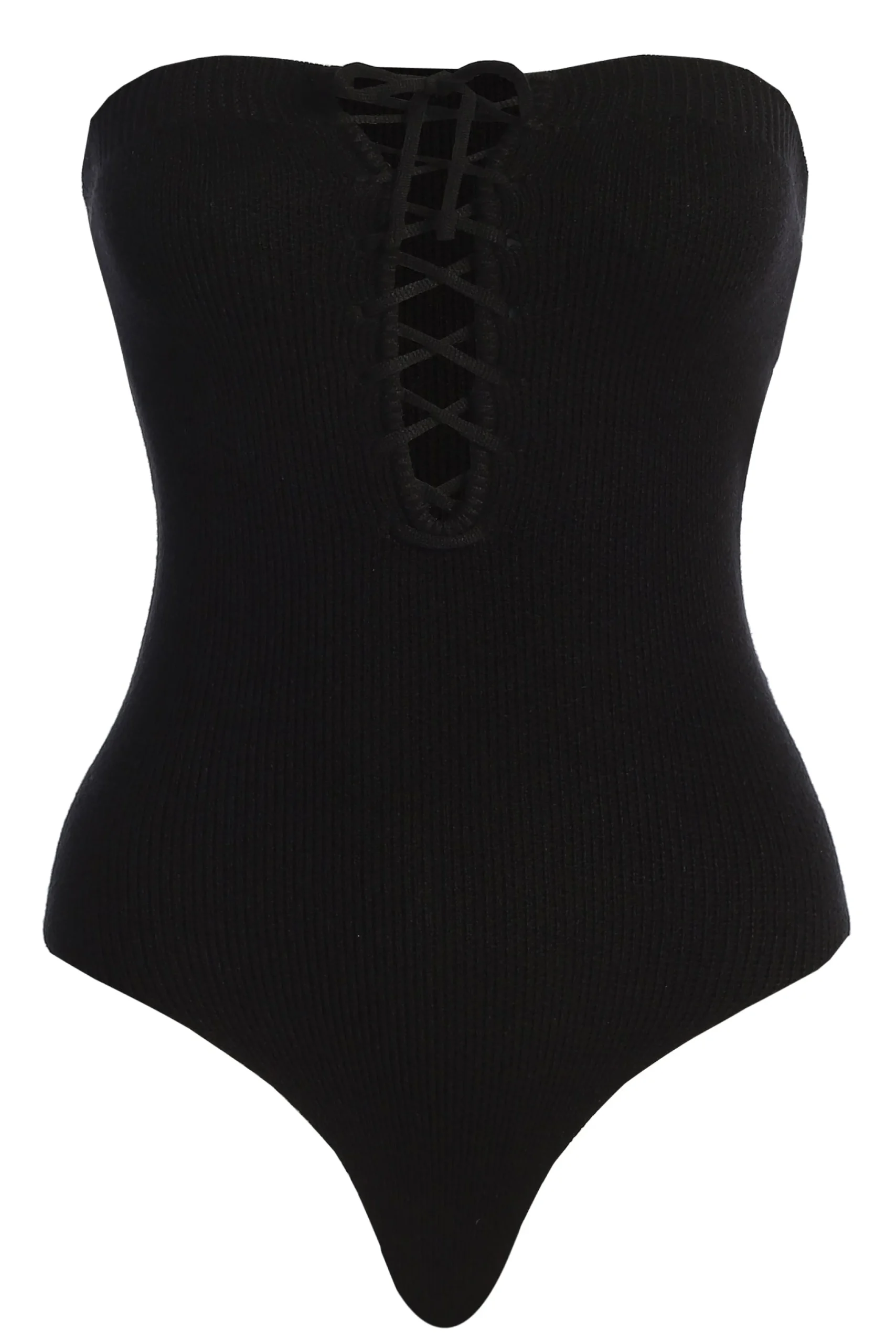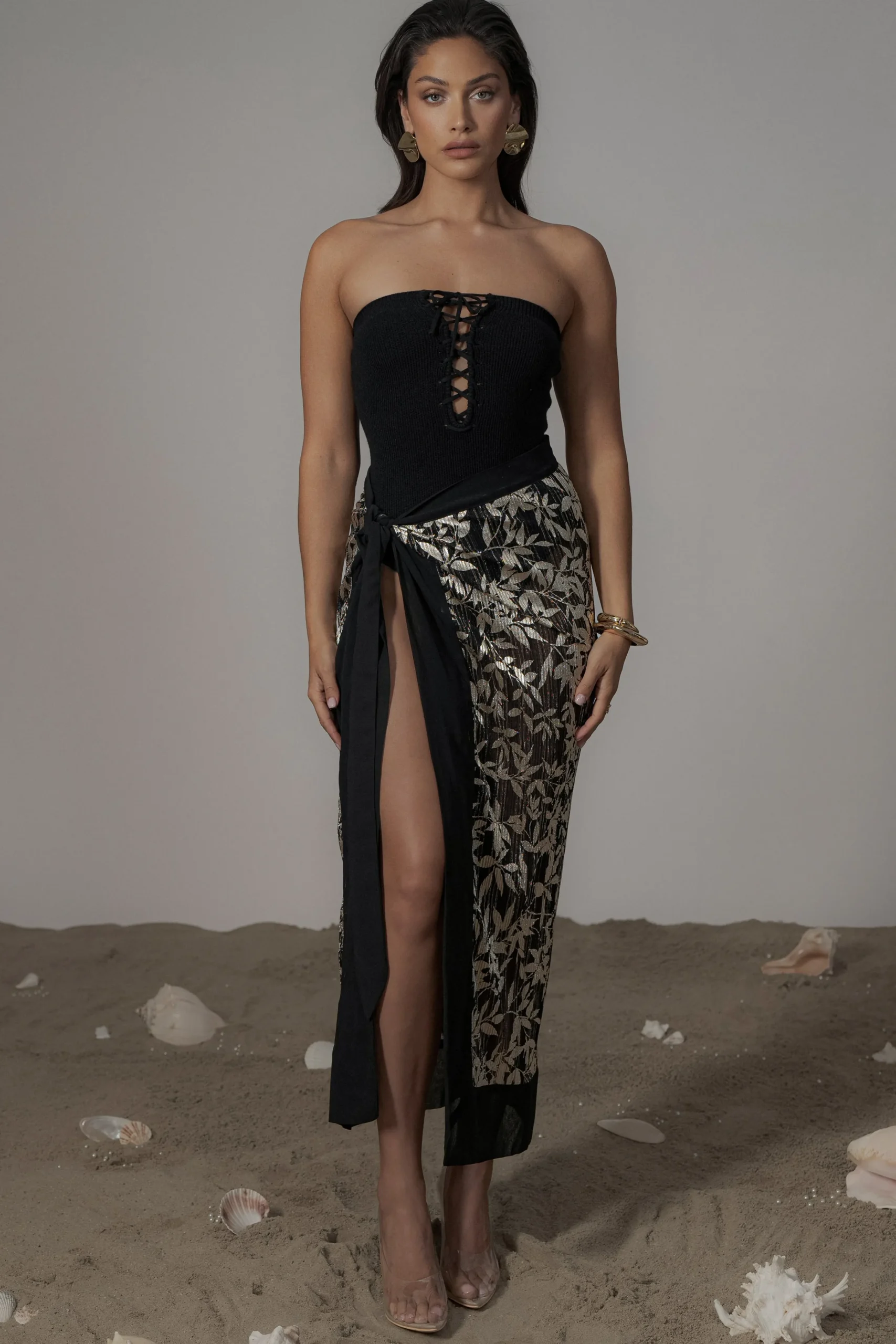 Indulge in the artful elegance of our Black Seabound Bodysuit. Featuring a lace-up front with a strapless neckline, this bodysuit is a stunning blend of form and function. Complete with a thong back and double snap closure. Pair with our Positano Printed Sarong Skirt for the full look. Stretchy. Single lined.
