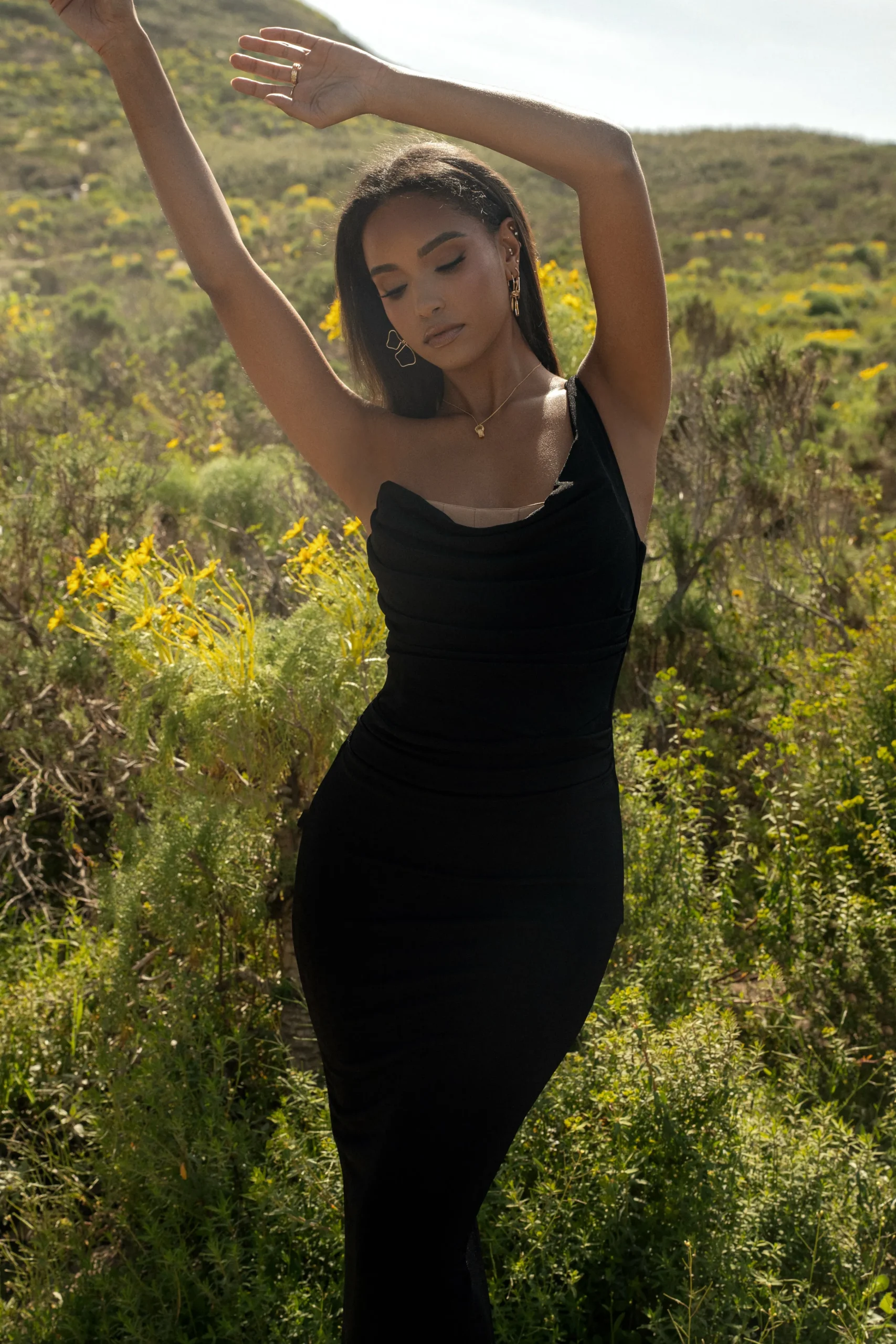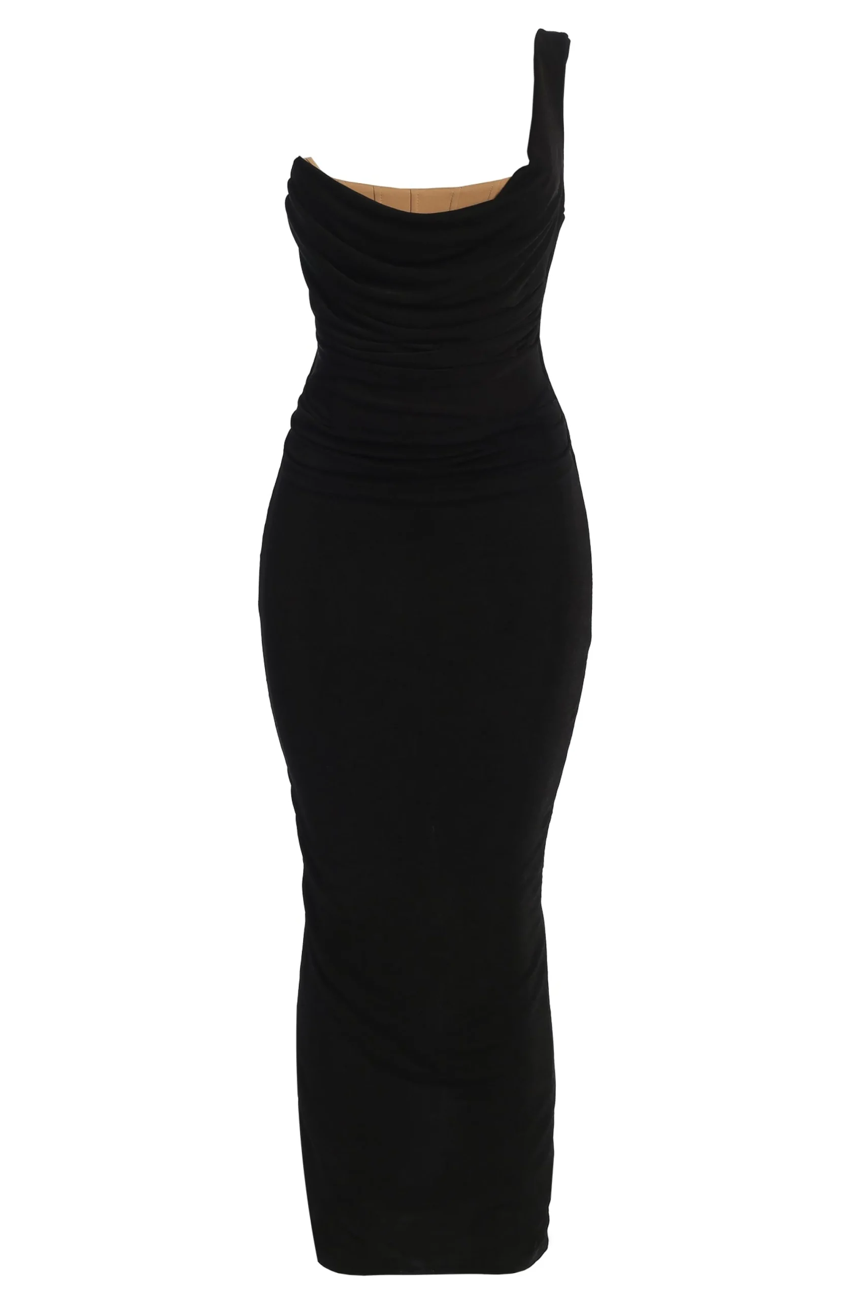 Step into Spring with our Black Slinky Krishna One Shoulder Maxi Dress. This stunning maxi dress features a sleek one shoulder design and a nude corset under layer with boning for structure and cinching. A cascading front drape with pleating at the waist finish the look. Crafted in a stretchy slinky material for extra stretch and quality. Hidden back zipper closure. Double lined.