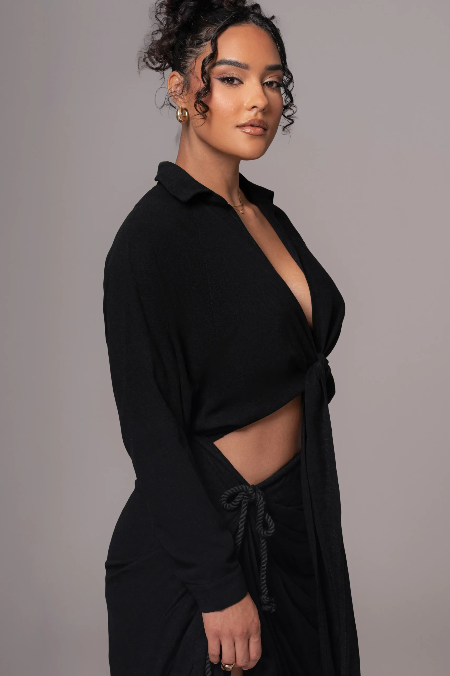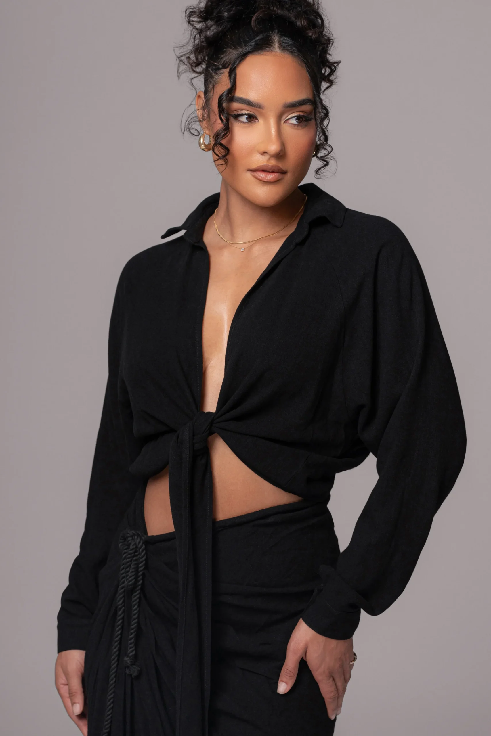 The Black Soho Front Tied Woven Top is a staple piece to style all year round! Featuring a lightweight knit fabric, this long sleeve top comes with a v-neckline formed by a stylish self tie front closure. Designed in a cropped hem with a relaxed fit for ease and comfort. No stretch.