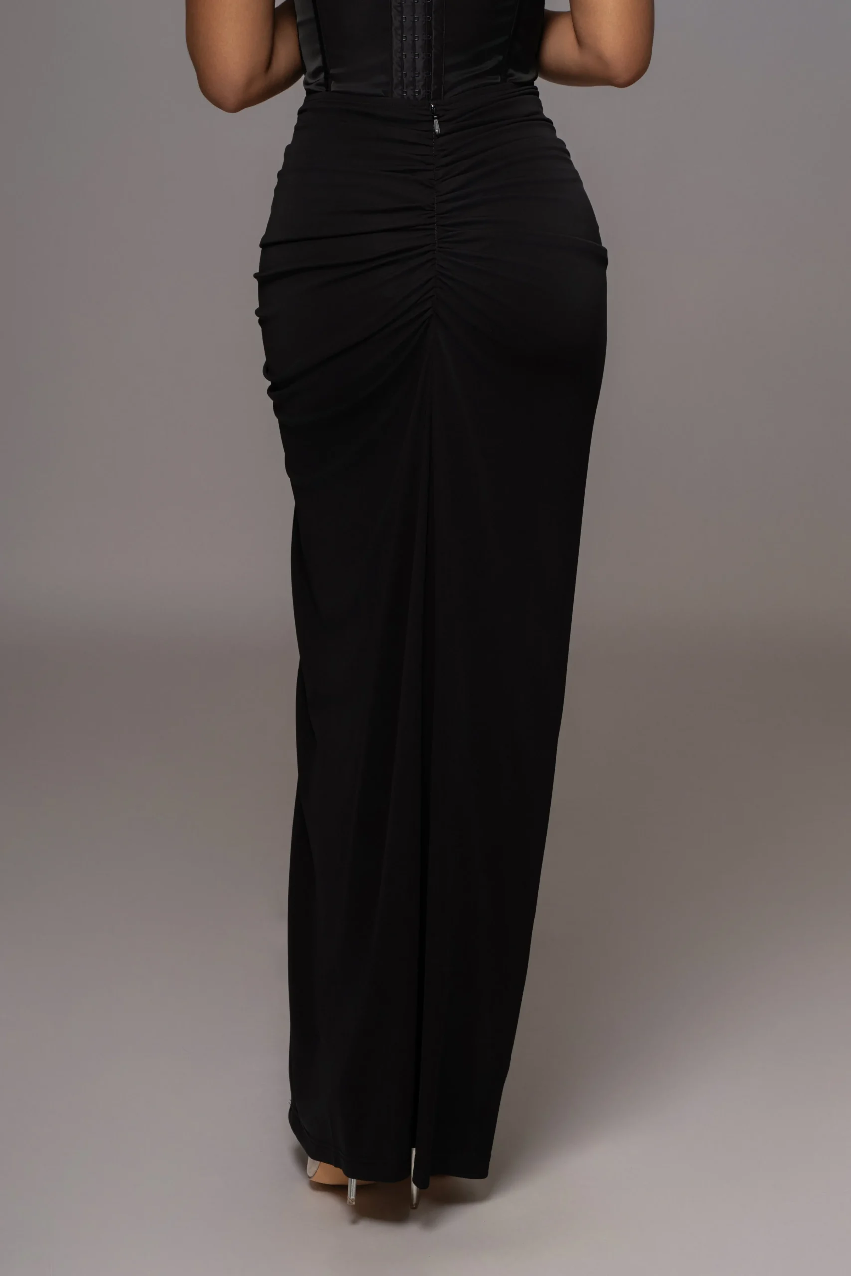 Take glamour to the next level with our Black Tara Drape Skirt! Featuring a draped design with a maxi silhouette that makes a stunning statement, this piece is enhanced by a thigh slit and subtle ruching. Hidden back zipper closure. Double lined. Stretchy.