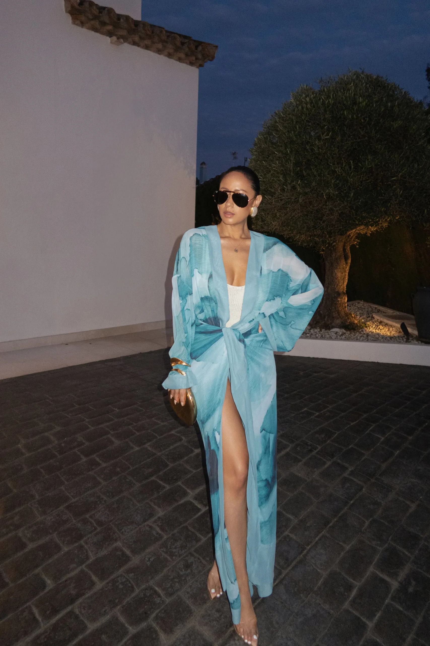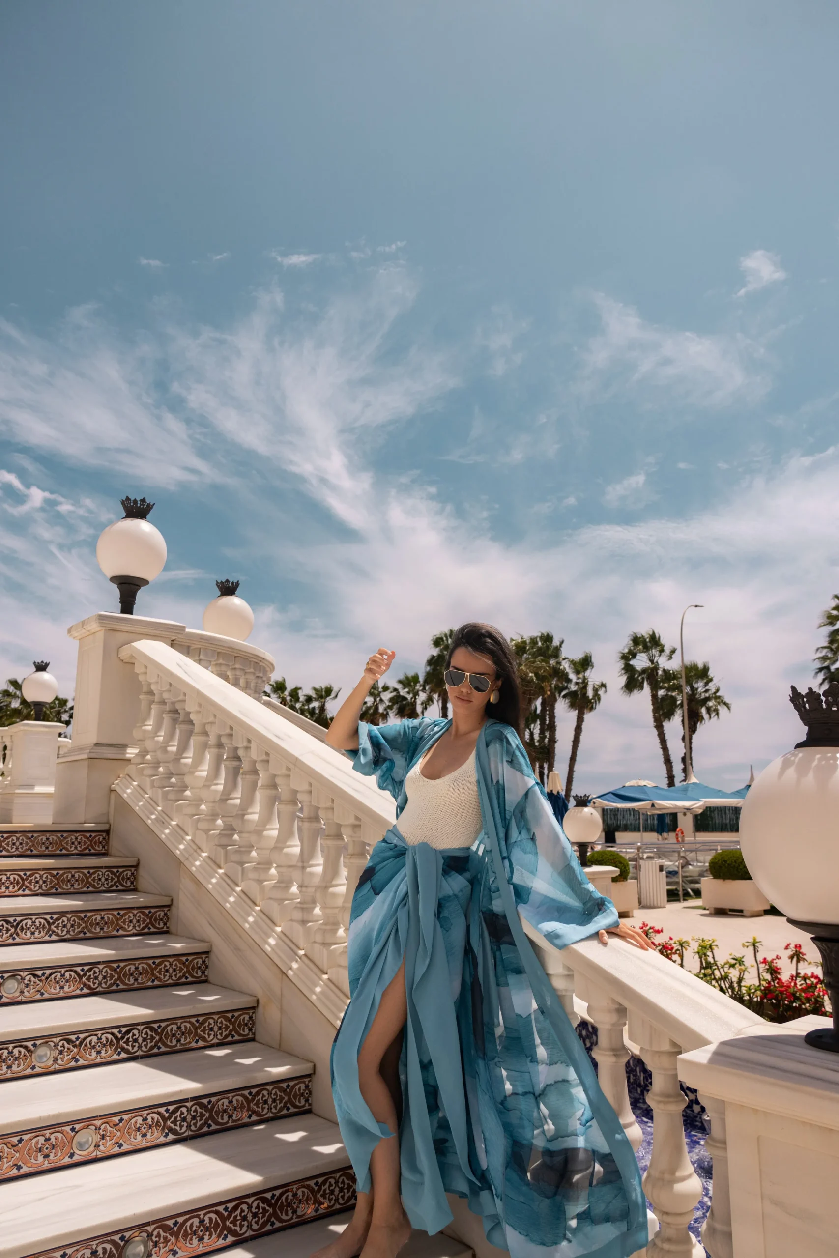 Our Blue Abstract Marine Print Sarong was made for the beach and beyond. This maxi sarong features a wrap style design with a marble print echoing waves of blue shades in a flowing silhouette. Crafted in lightweight chiffon fabric perfect for staying cool under the sun. Pair with our Alissa Printed Duster and Juliette Knit Belted One Piece for the full look. No stretch. Double lined.