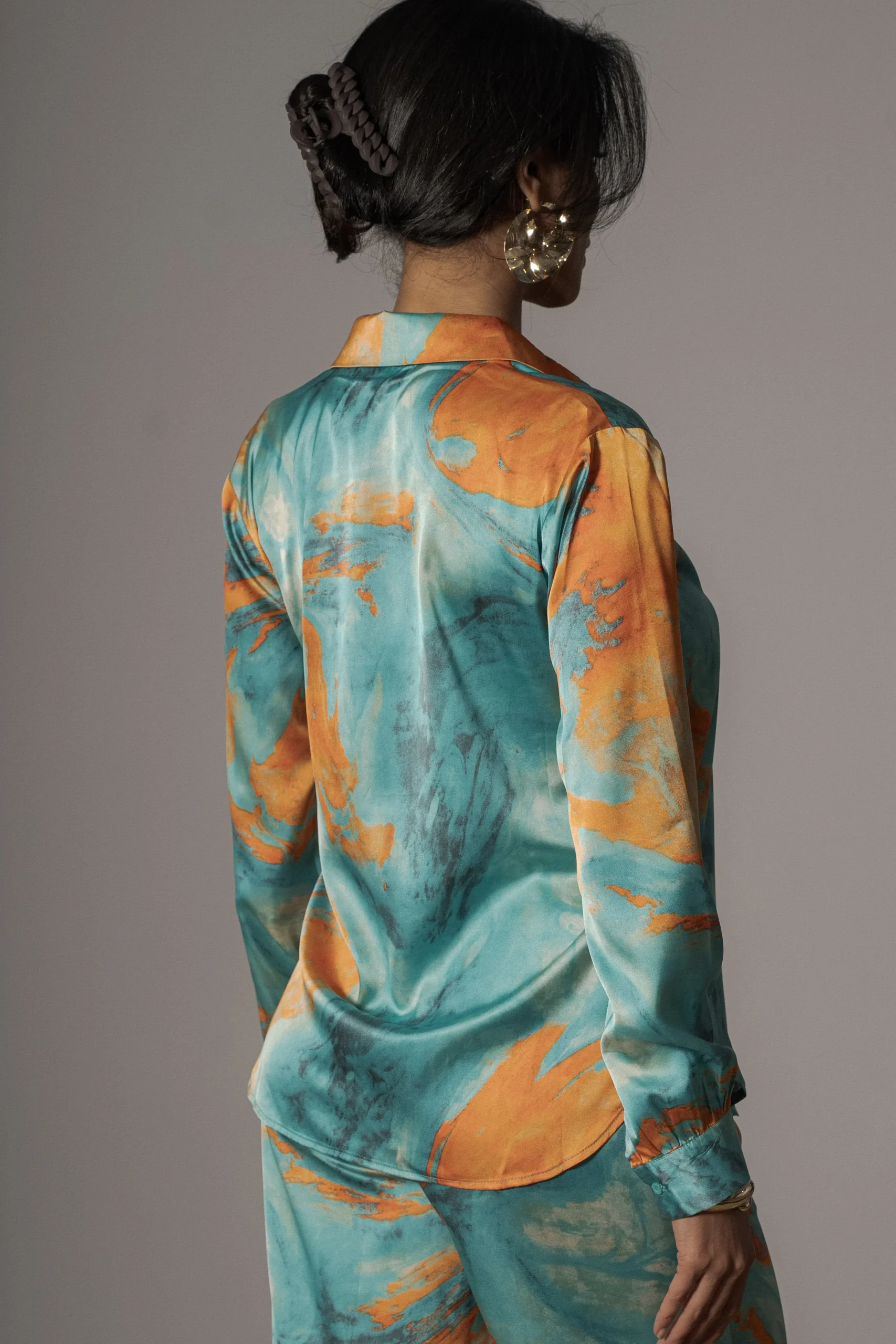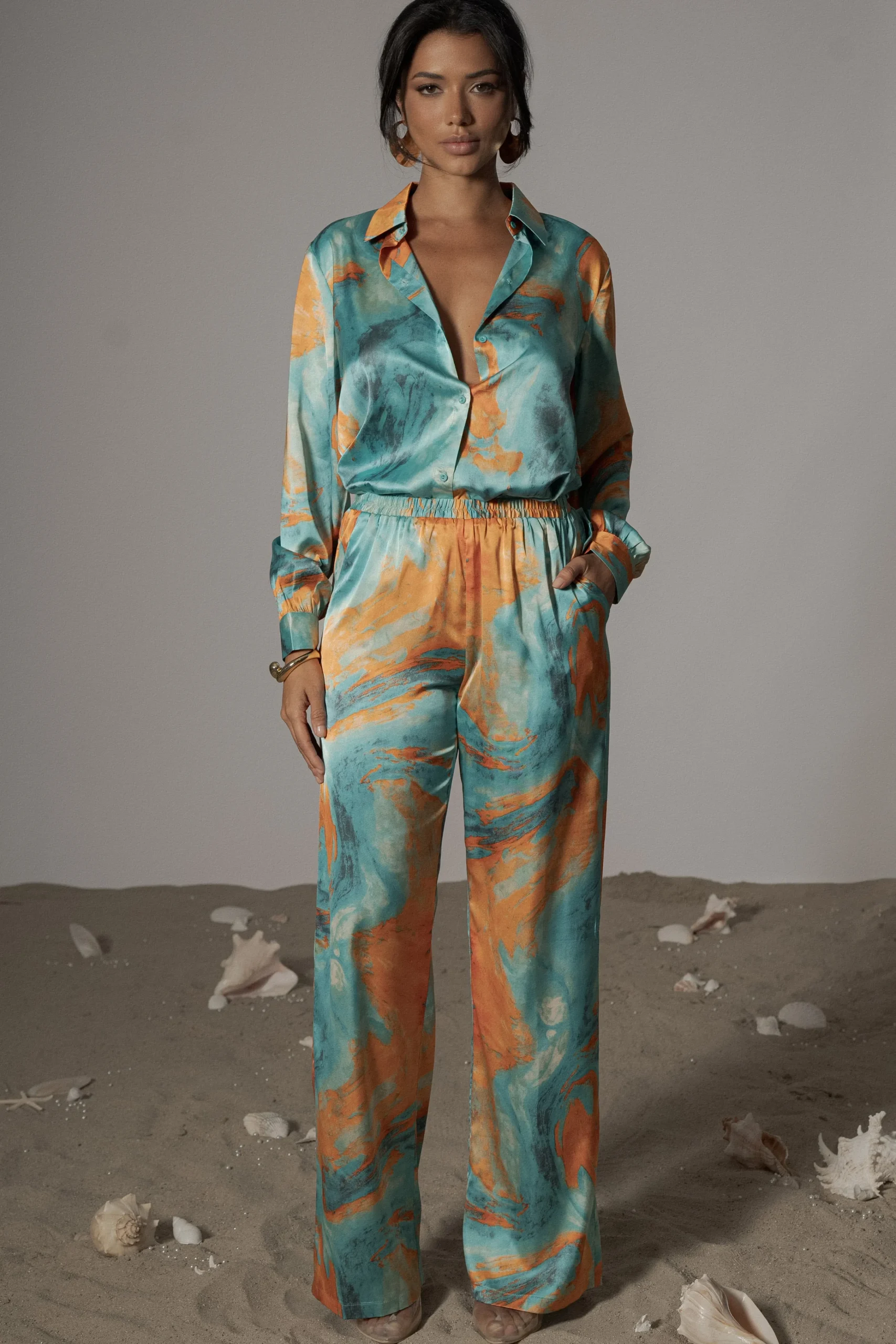 Step into summer elegance with our Blue Hidden Gems Satin Pant Set. This exquisite set features a collar button up top with long sleeves and matching elastic waistband pants in a mesmerizing marble print. The soft single-lined satin fabric will wrap you in sophistication, making a statement with every wear. No stretch. Sold as set.
